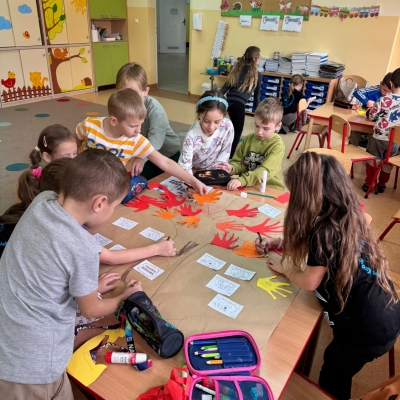 Następnie dzieci wzięły udział w zajęciach warsztatowych prowadzonych wg. metody Doroty Dziamskiej ,,Edukacja przez ruch”. Dzieci z najstarszej grupy przedszkolnej - wykonały plakat na dużym arkuszu szarego papieru , niejako ,,podpisując się” pod znajomością swoich praw. To był bardzo interesująco i aktywnie spędzony dzień.
