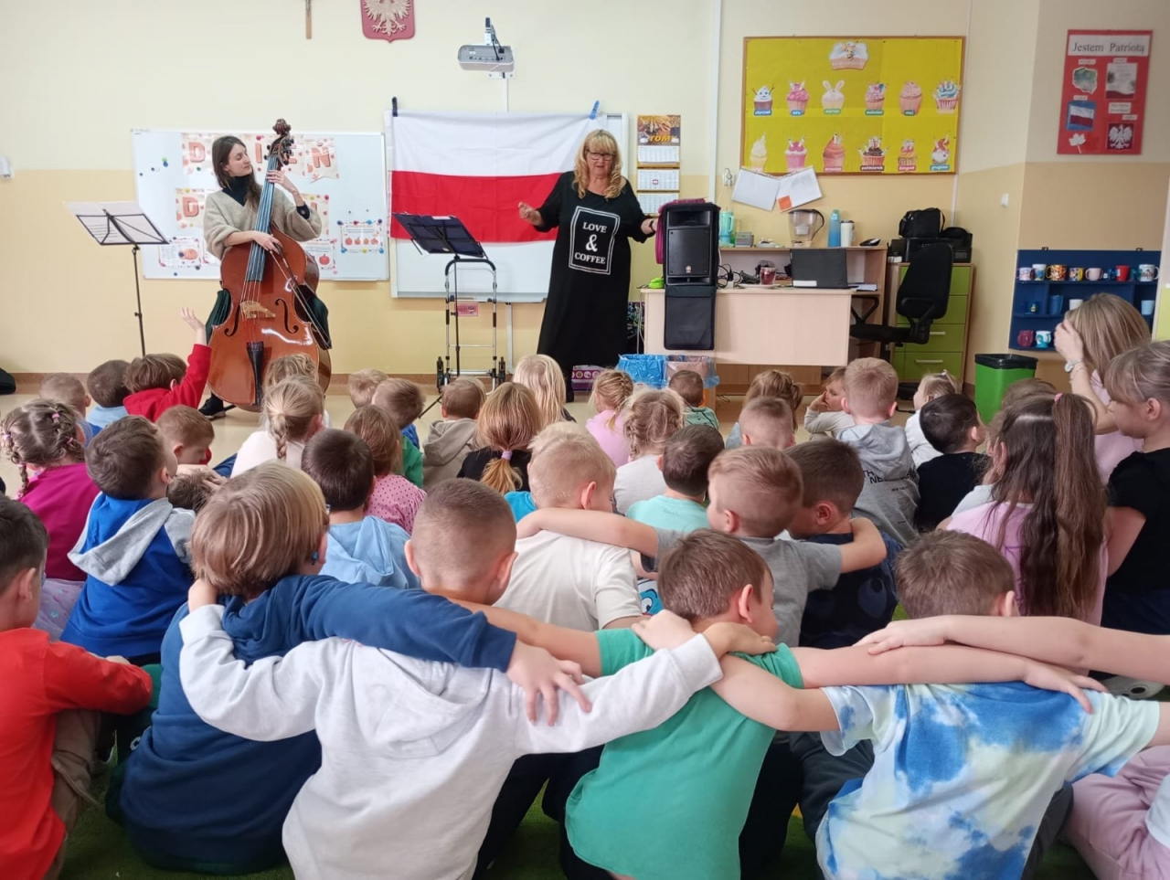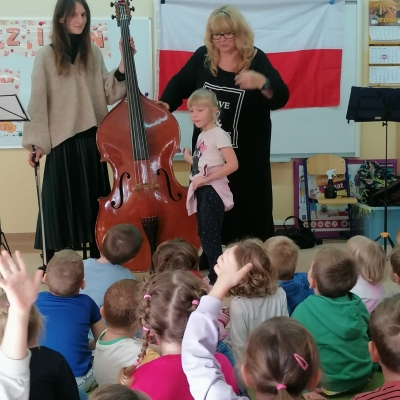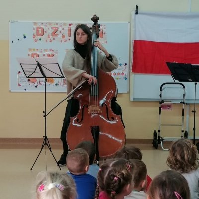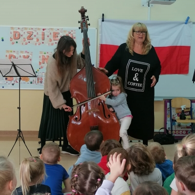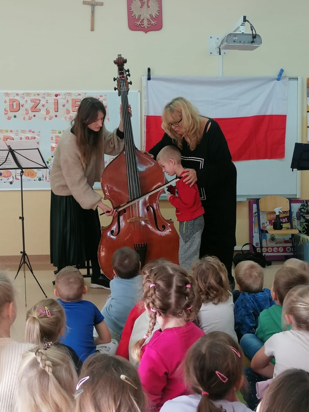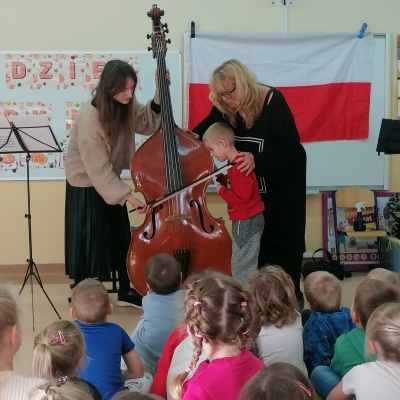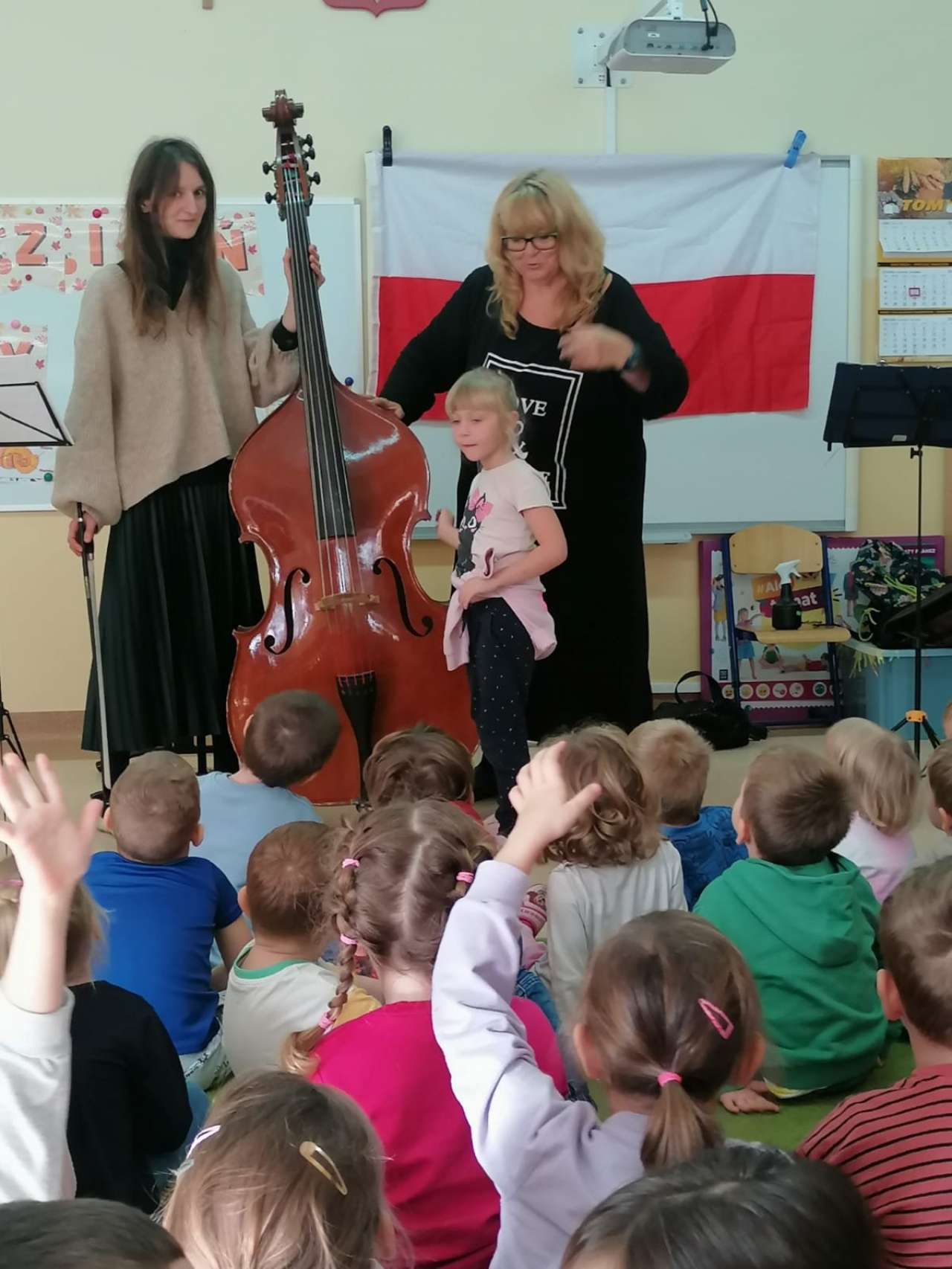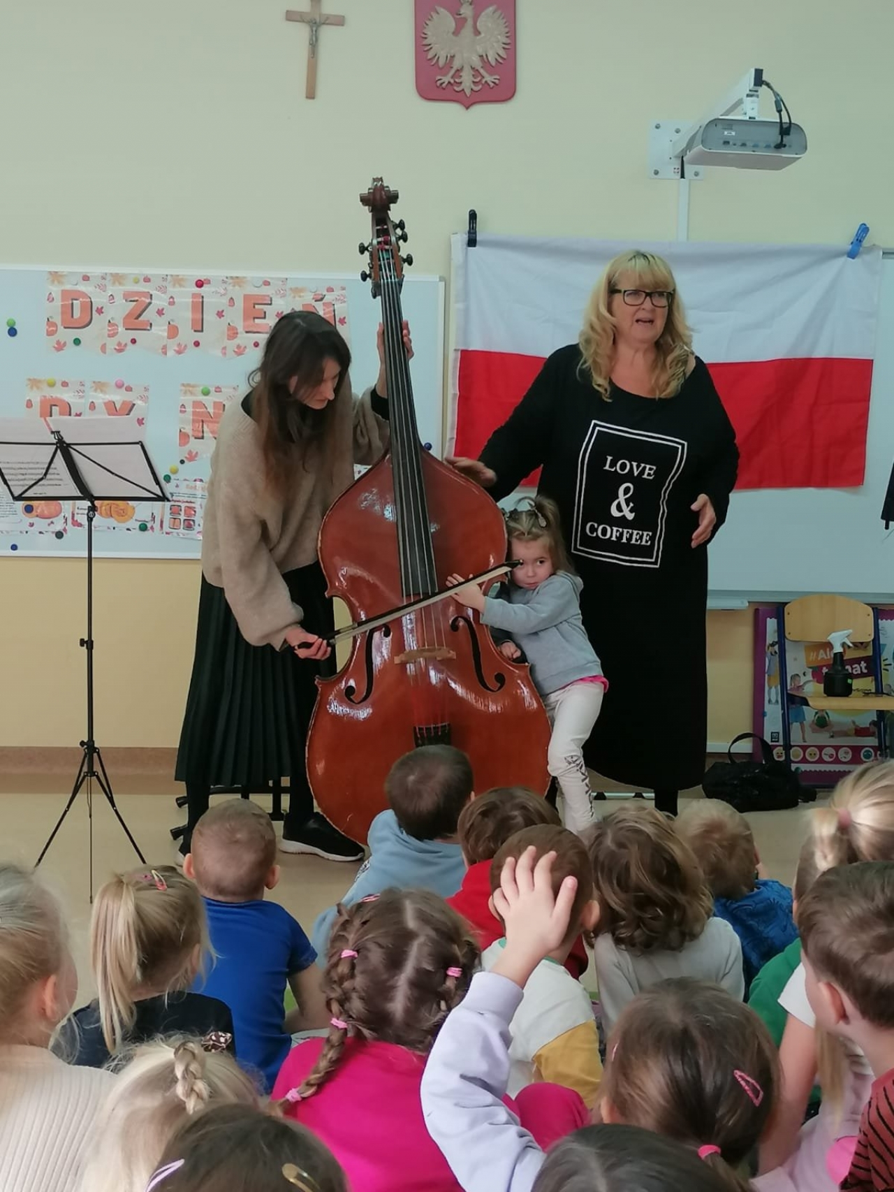 W dniu 12.11.2025r. w przedszkolu odbył się cykliczny koncert poprowadzony przez panią Joannę- kontrabasistkę oraz panią Alinę Zwoźniak . Dzieci słuchały i śpiewały piosenki o tematyce narodowej , a także wysłuchały utworów wykonanych na kontrabasie takich , jak: polonez Ogińskiego ,,Pożegnanie Ojczyzny” , włoskich utworów muzyki poważnej oraz tango ,,La Paloma”.Dzieci miały też okazję schować się w ogromnym futerale oraz porównać swój wzrost z wysokością instrumentu. Spotkanie dostarczyło przedszkolakom wiele muzycznych doznań, ale i spontanicznej radości.