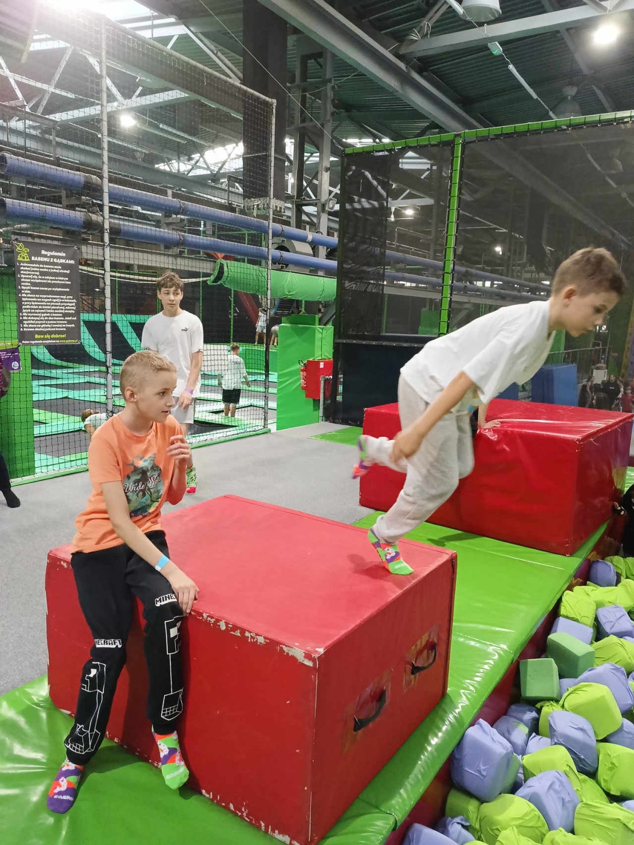 Dzieci doskonaliły matematyczne umiejętności w przestrzeni, z wykorzystaniem infrastruktury parku. Trening myślenia matematycznego i przestrzennego wśród trampolin wszystkim się podobał.