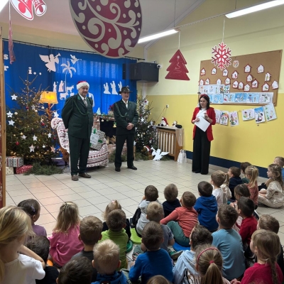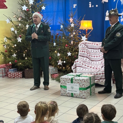nasze przedszkole odwiedzili myśliwi z Koła Łowieckiego św. Hubert Oleśnica. Pan Piotr Małas oraz pan Jerzy Nagórny wręczyli na ręce pani dyrektor przygotowaną ,,Łowiecką paczkę” – prezent dla naszych przedszkolaków.