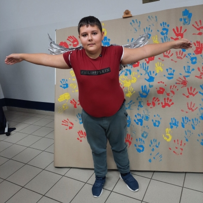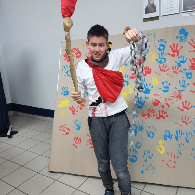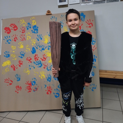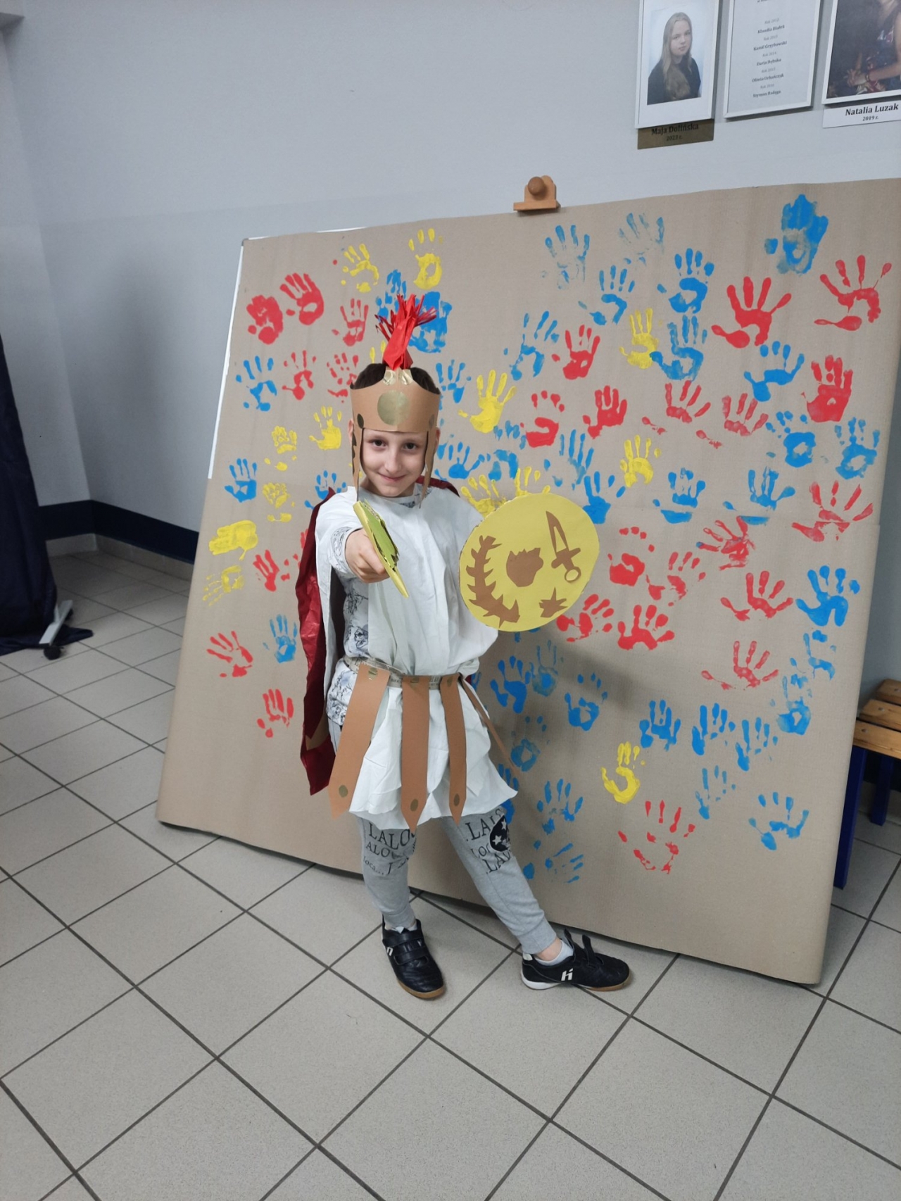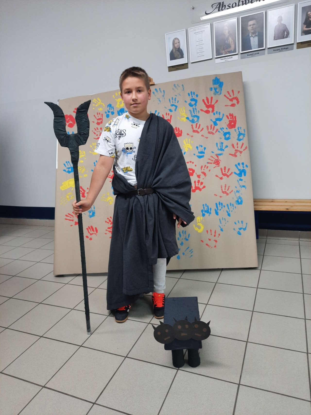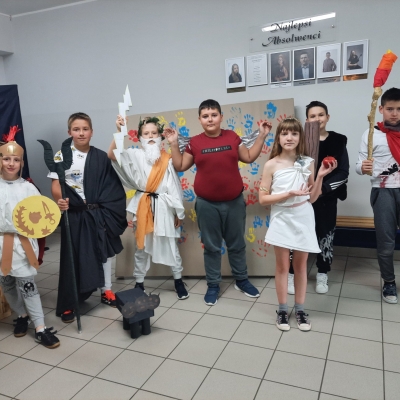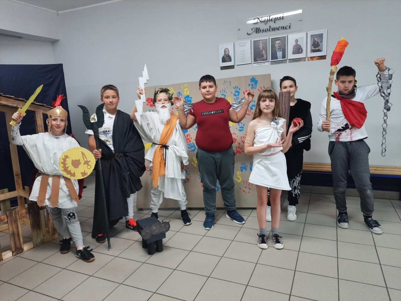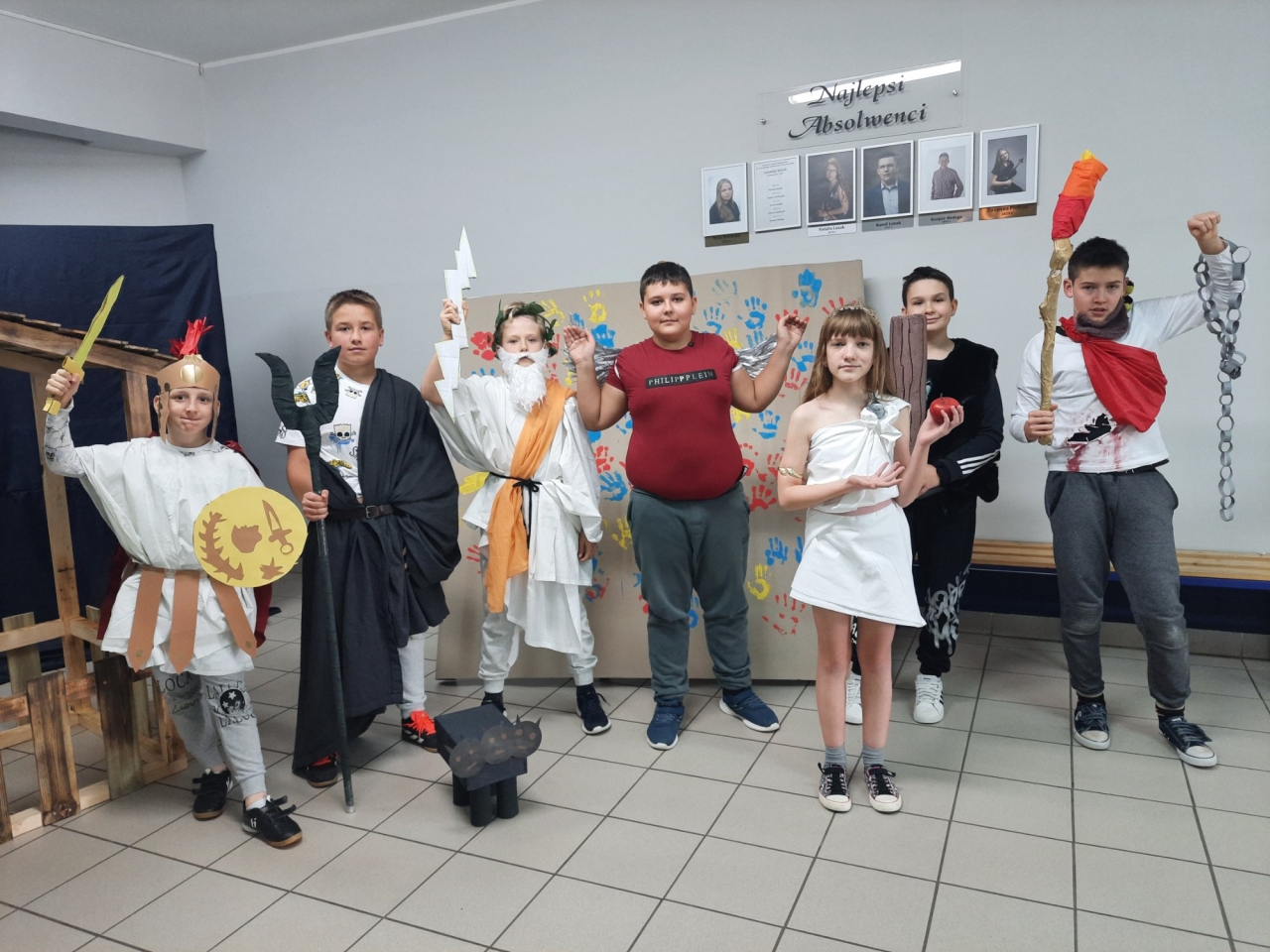To już w naszej szkole tradycja, że na zakończenie omawiania historii starożytnej Grecji, uczniowie przebierają się za wybranego mitologicznego boga, herosa lub bohatera. Prezentacja postaci, przygotowane stroje oraz atrybuty uczyniły naszą lekcję wyjątkową. Jesteśmy przekonani, że na długo pamiętać będziemy o: Łukaszu – Hadesie i jego Cerberze, gromowładnym Adasiu – Zeusie, dzielnym Kacprze – Prometeuszu, Julce – Afrodycie, najpiękniejszej z bogiń, pomysłowym Adrianie – Dedalu, walecznym Błażeju – Aresie oraz słynącym ze swojej siły i sprytu Michale – Heraklesie.