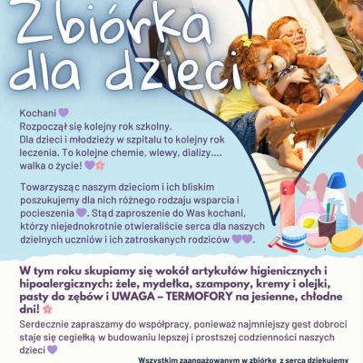Szanowni Państwo - szkolne koło wolontariatu ,,Razem Dobrze(ń)" zachęca wszystkich do wzięcia udziału w zbiórce hipoalergicznych kosmetyków i termoforów na rzecz dzieci i młodzieży ze Szkoły Podstawowej nr 90 w Gdańsku - przy Uniwersyteckim Centrum Klinicznym. Akcja trwa do 31 października 2025 roku - szczegółowe informacje na plakacie.