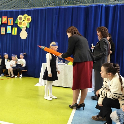 Pierwszoklasiści z dumą złożyli ślubowanie, obiecując być pilnymi uczniami, dobrymi kolegami i z radością odkrywać świat wiedzy. Aktu pasowania dokonała dyrektor szkoły Joanna Jaros, symbolicznie dotykając ramienia każdego ucznia ogromnym ołówkiem.