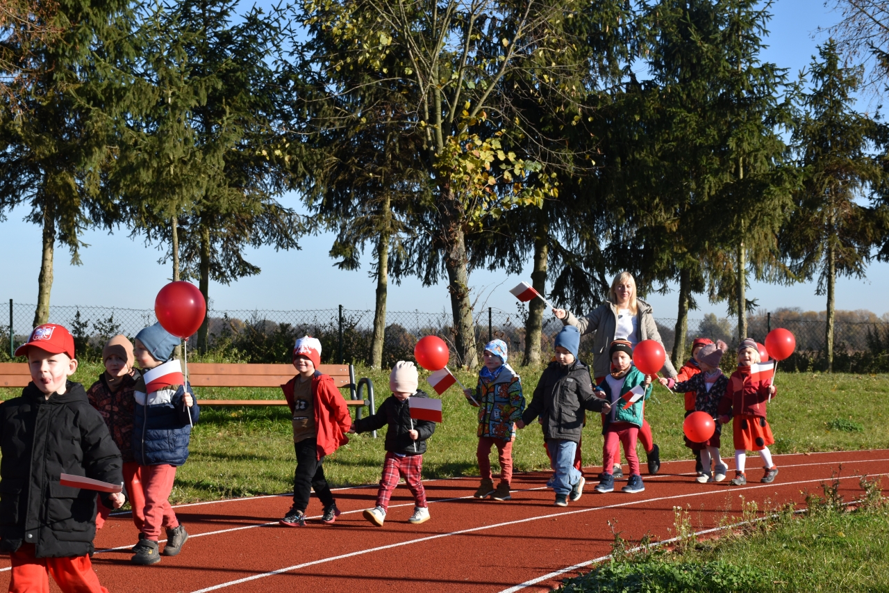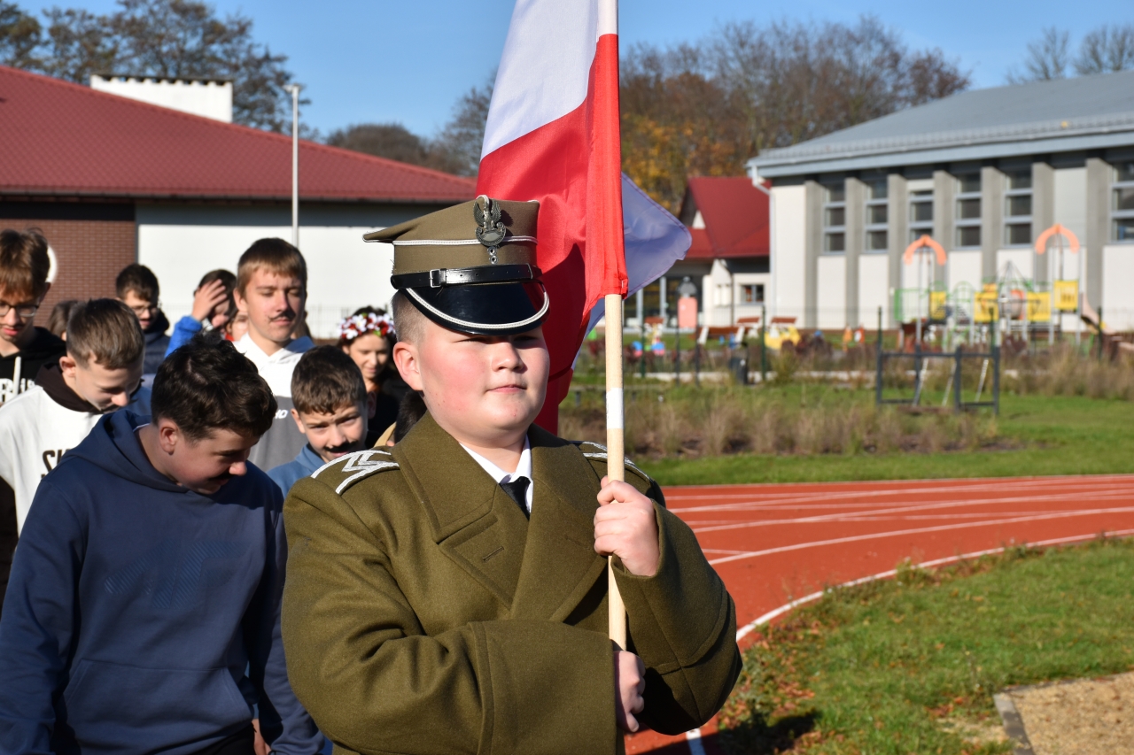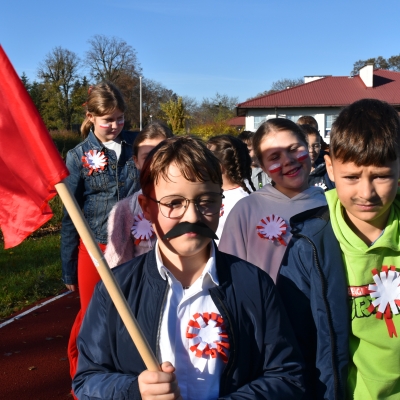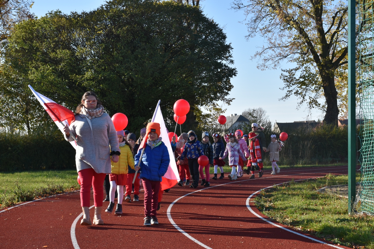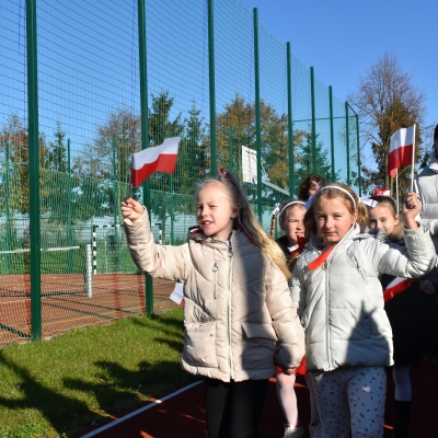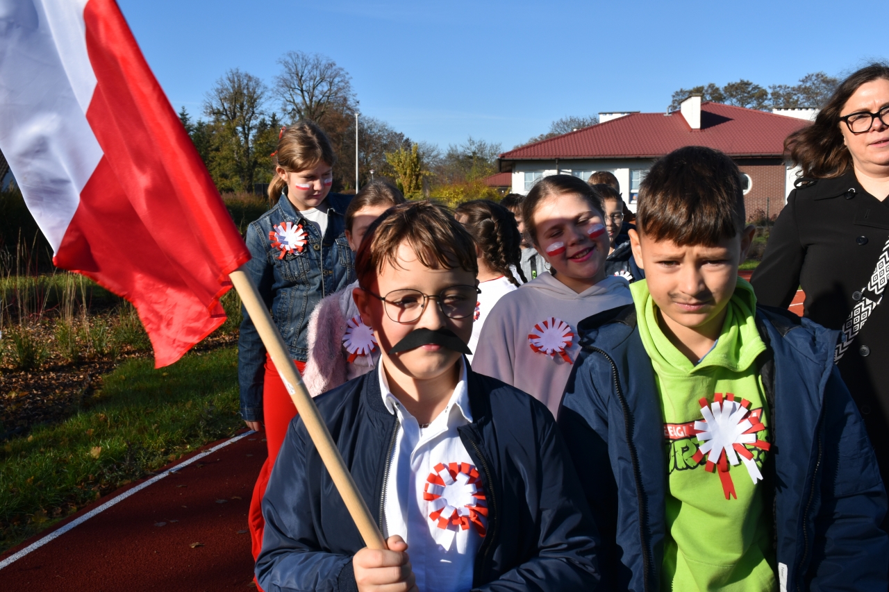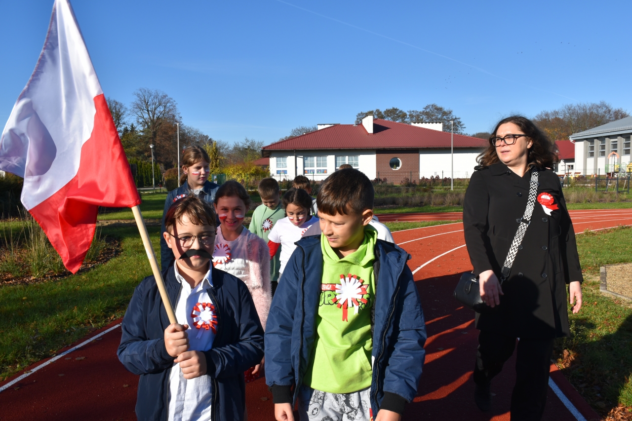 Symbolicznym rozpoczęciem obchodów była Sztafeta Niepodległości – uroczysty marsz z flagą narodową, prowadzony przez chorążego Krzysztofa Sachanka. Flaga wędrowała z rąk do rąk, począwszy od najmłodszej grupy przedszkolnej, aż po uczniów klasy ósmej.