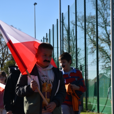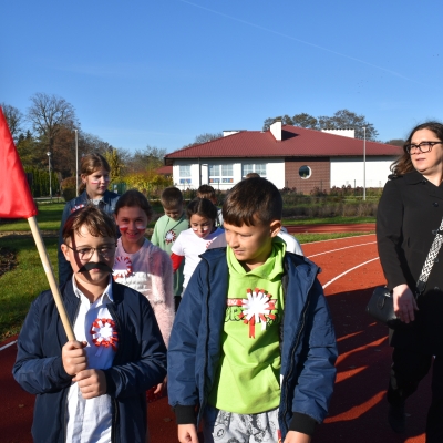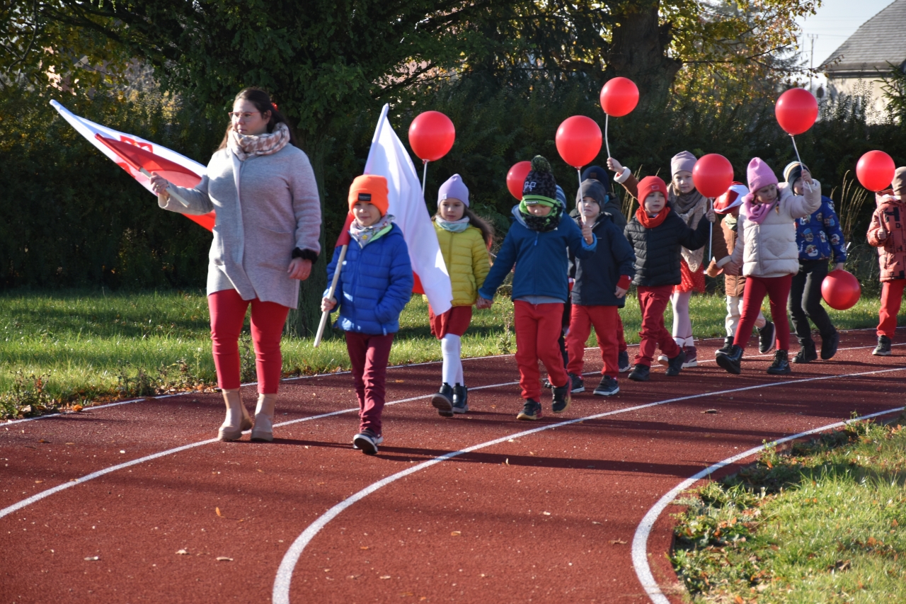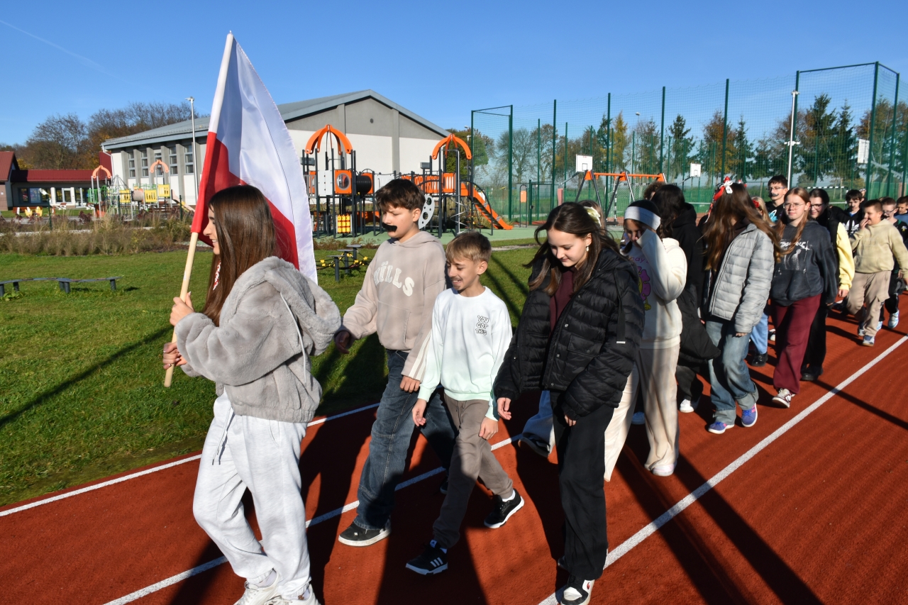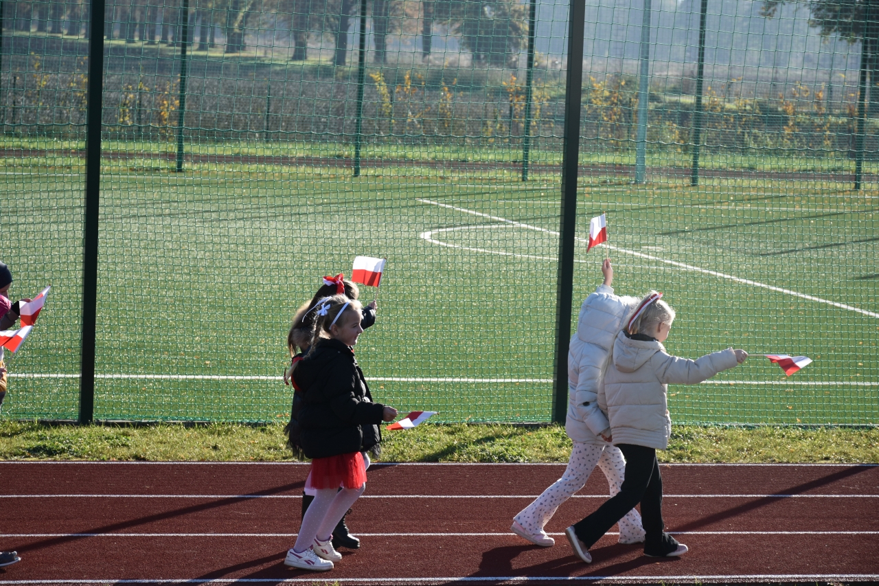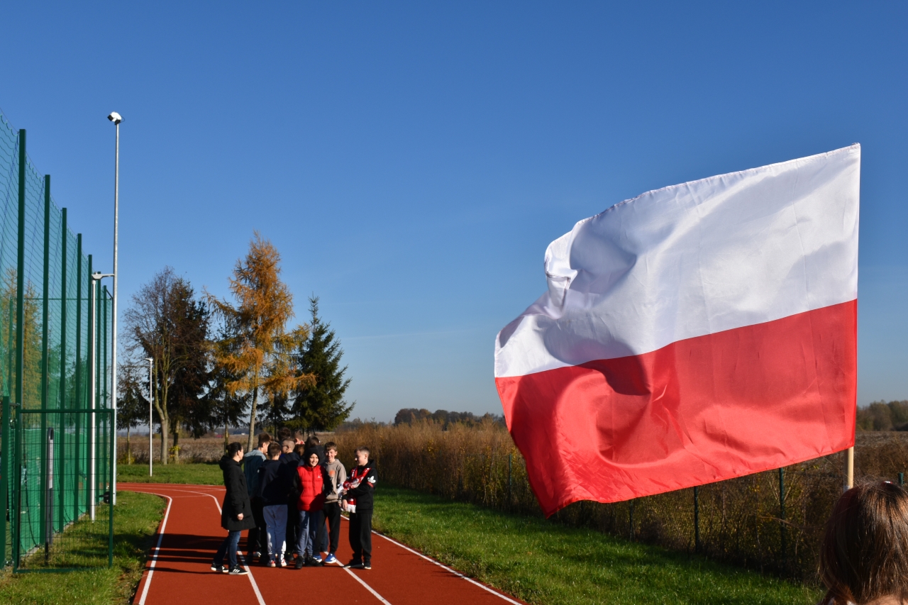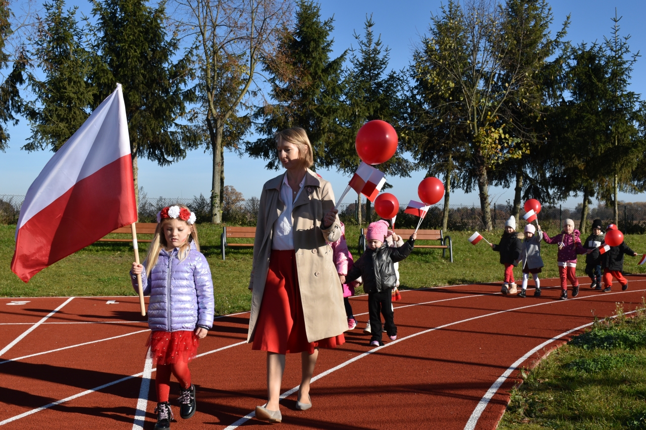 Symbolicznym rozpoczęciem obchodów była Sztafeta Niepodległości – uroczysty marsz z flagą narodową, prowadzony przez chorążego Krzysztofa Sachanka. Flaga wędrowała z rąk do rąk, począwszy od najmłodszej grupy przedszkolnej, aż po uczniów klasy ósmej.