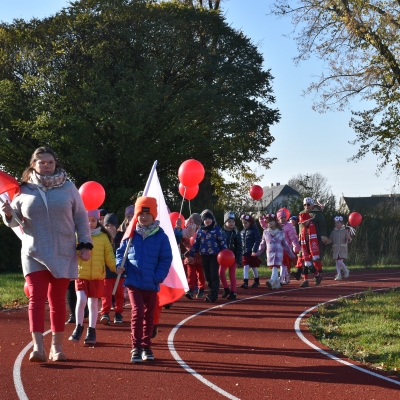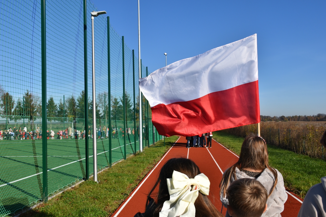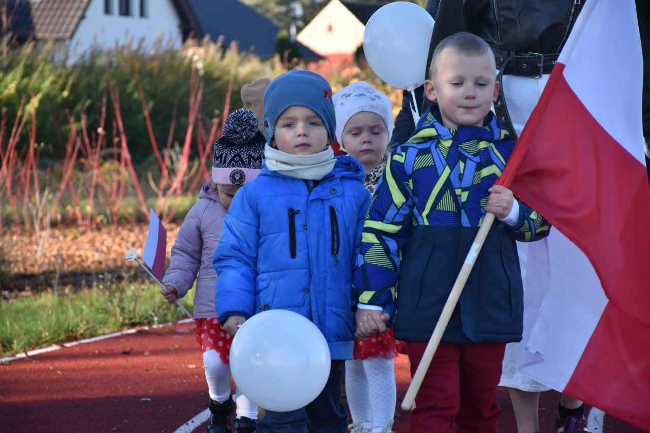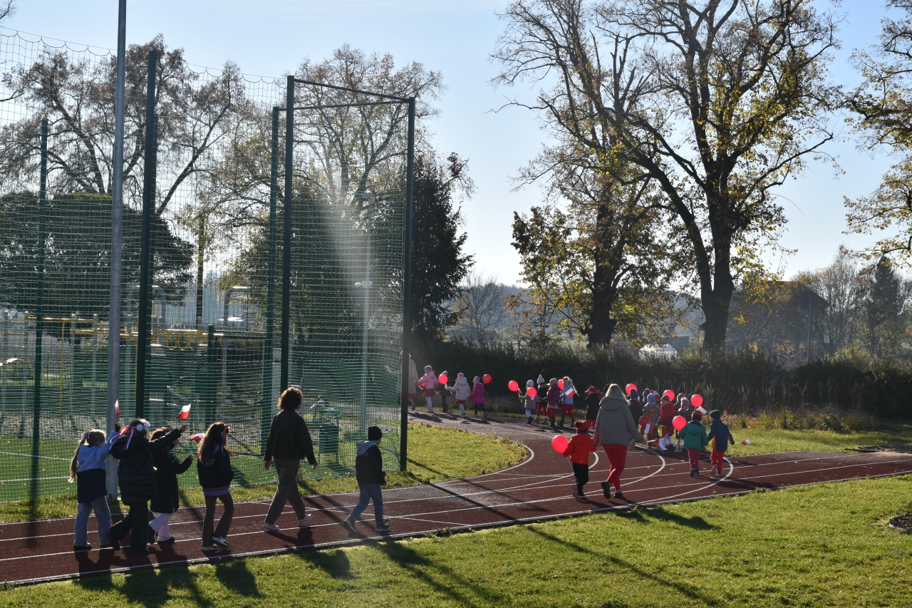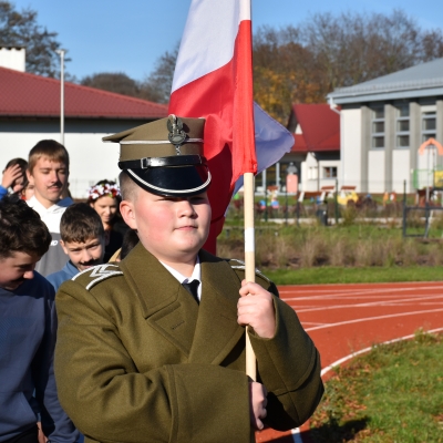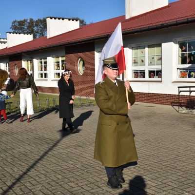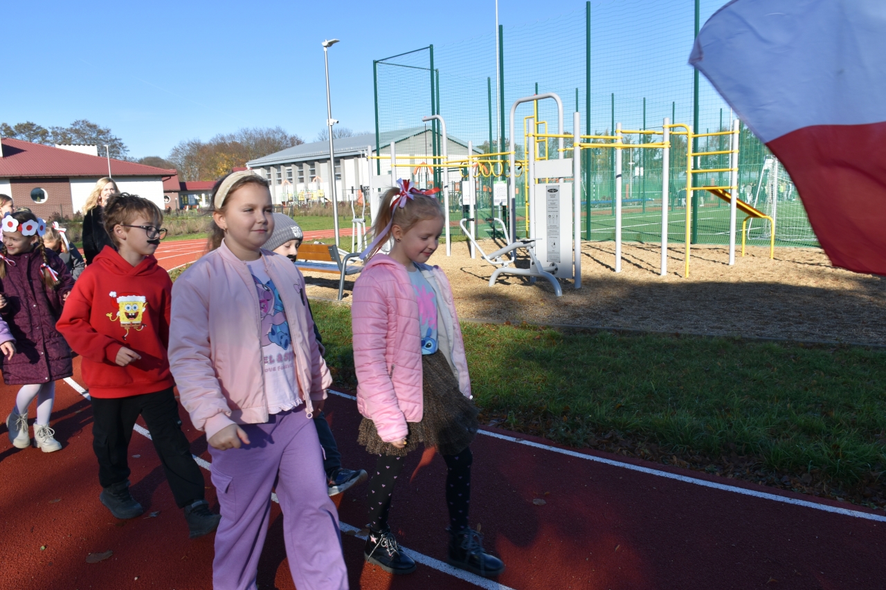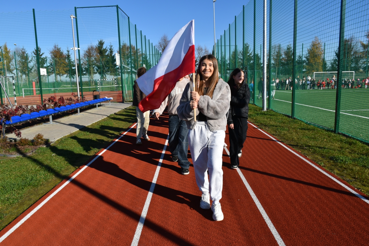 Symbolicznym rozpoczęciem obchodów była Sztafeta Niepodległości – uroczysty marsz z flagą narodową, prowadzony przez chorążego Krzysztofa Sachanka. Flaga wędrowała z rąk do rąk, począwszy od najmłodszej grupy przedszkolnej, aż po uczniów klasy ósmej.