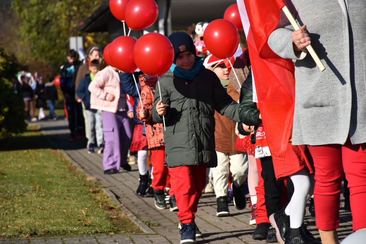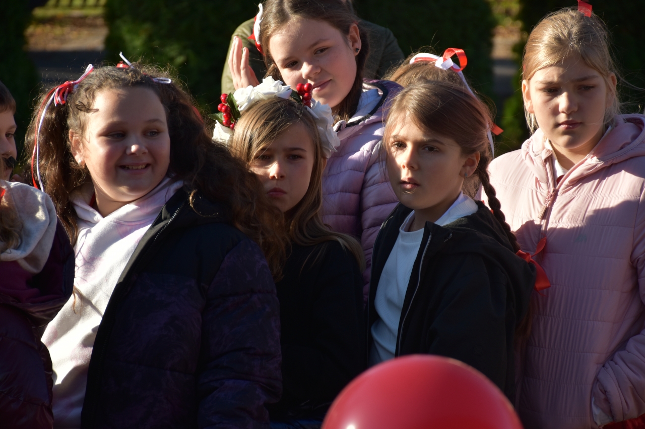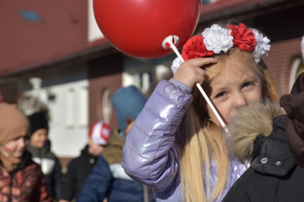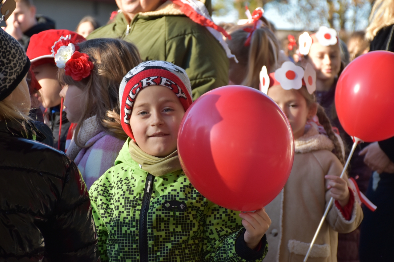 W dłoniach wielu uczniów powiewały biało-czerwone flagi, a balony w barwach narodowych dodawały wydarzeniu radosnego charakteru.