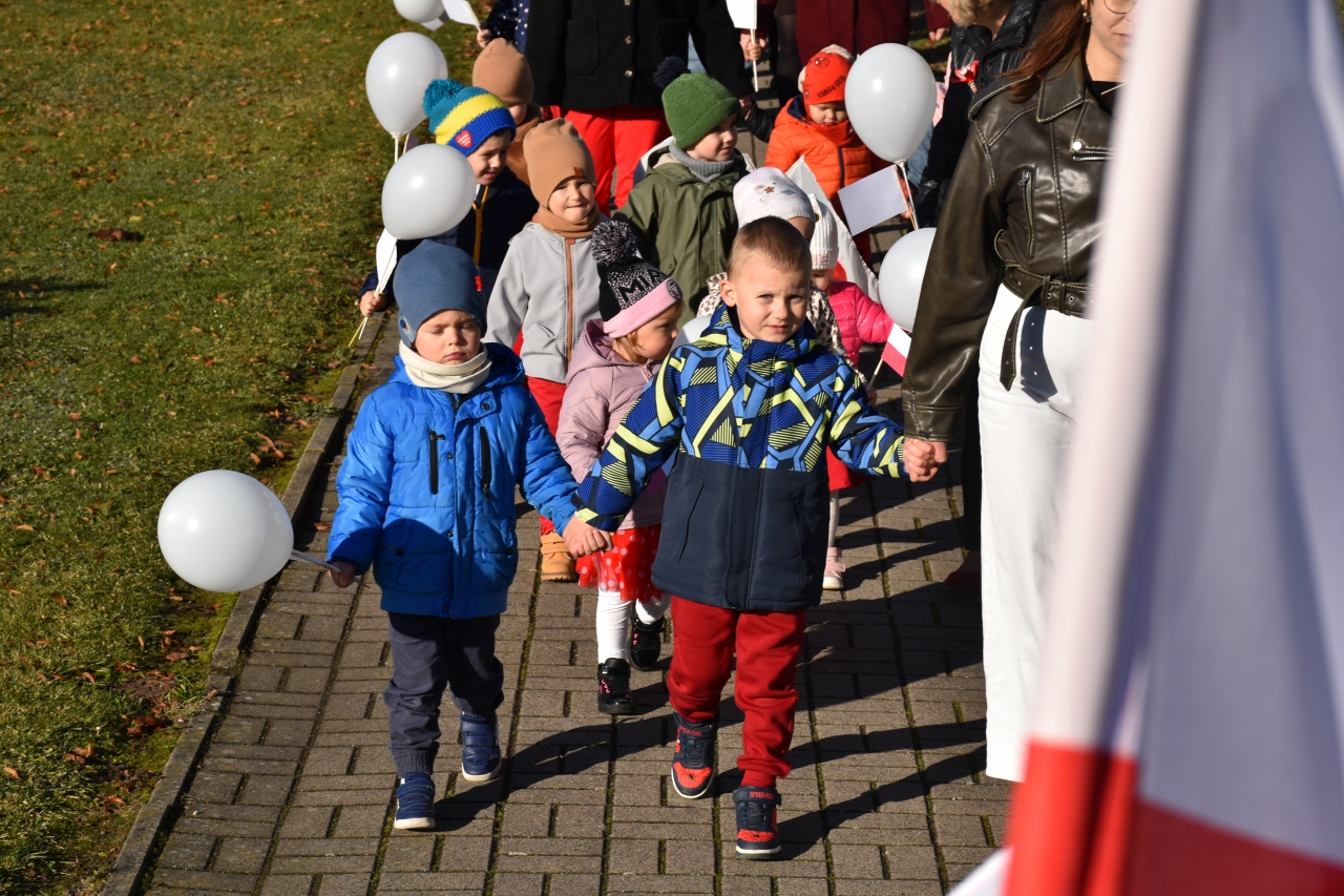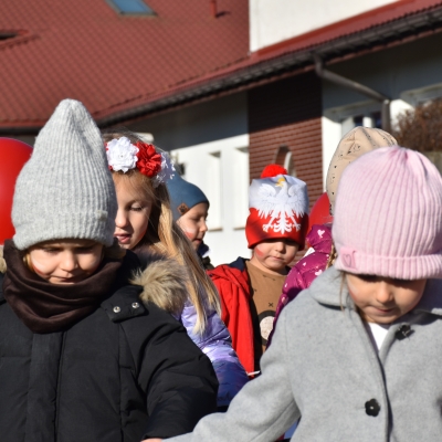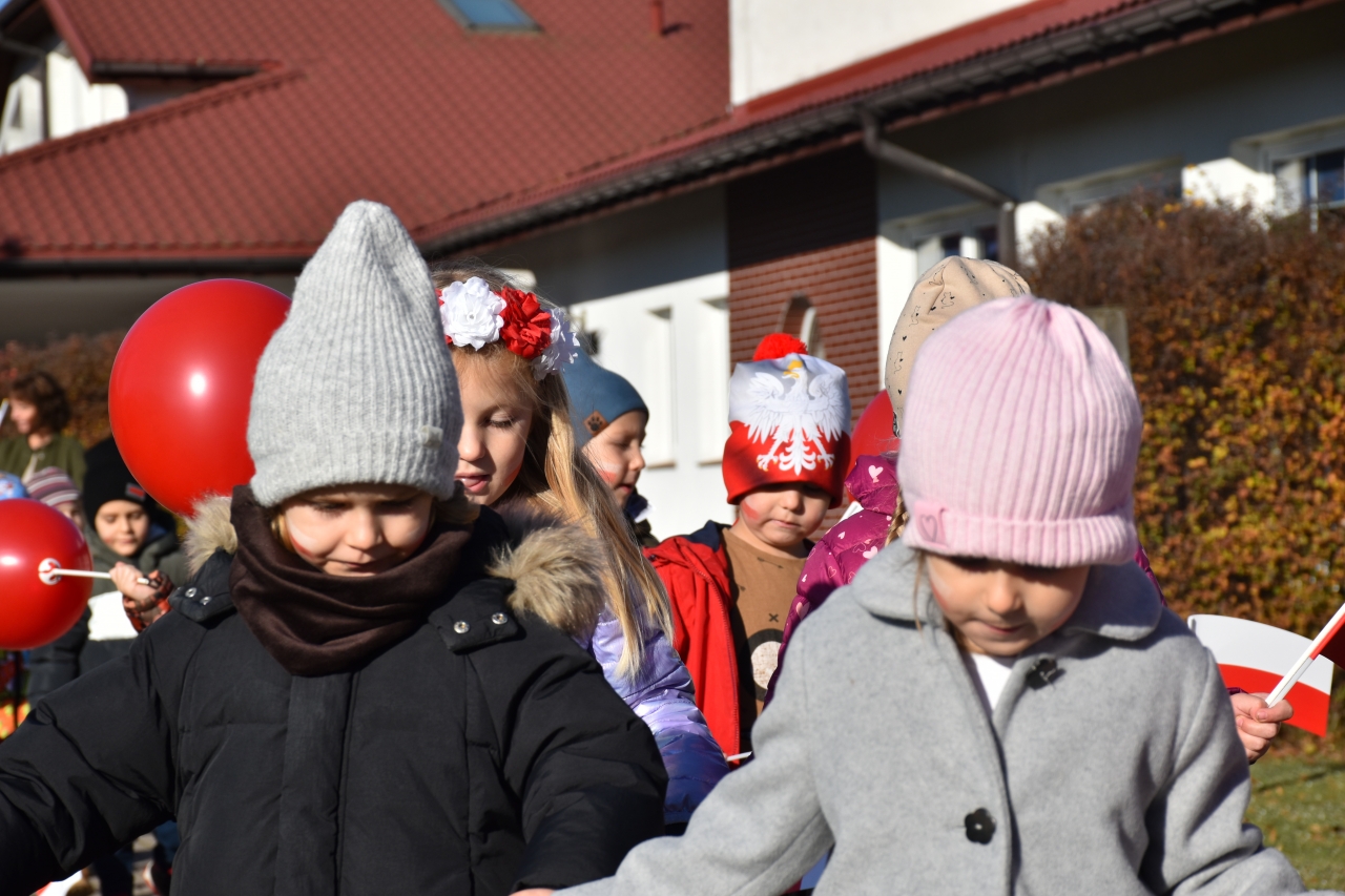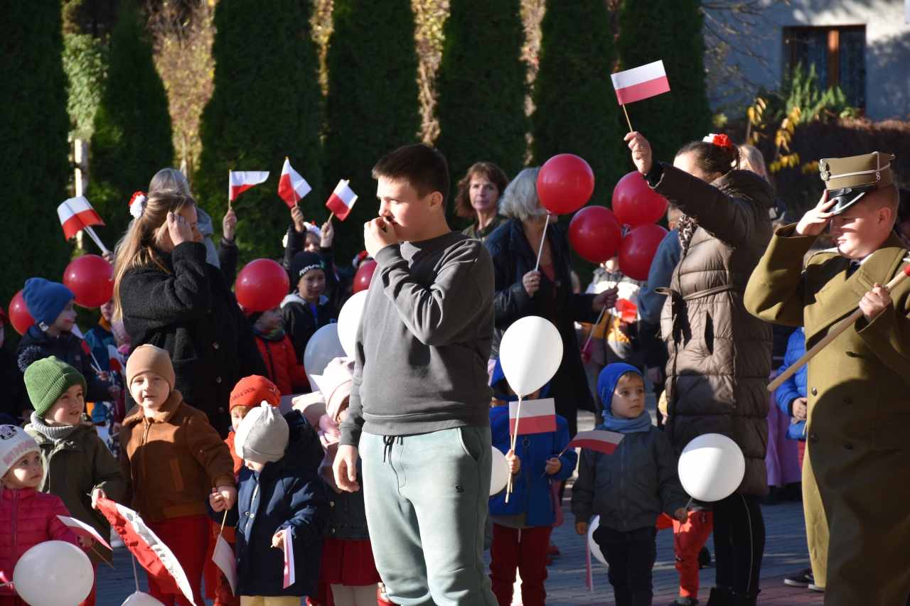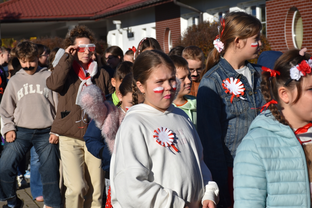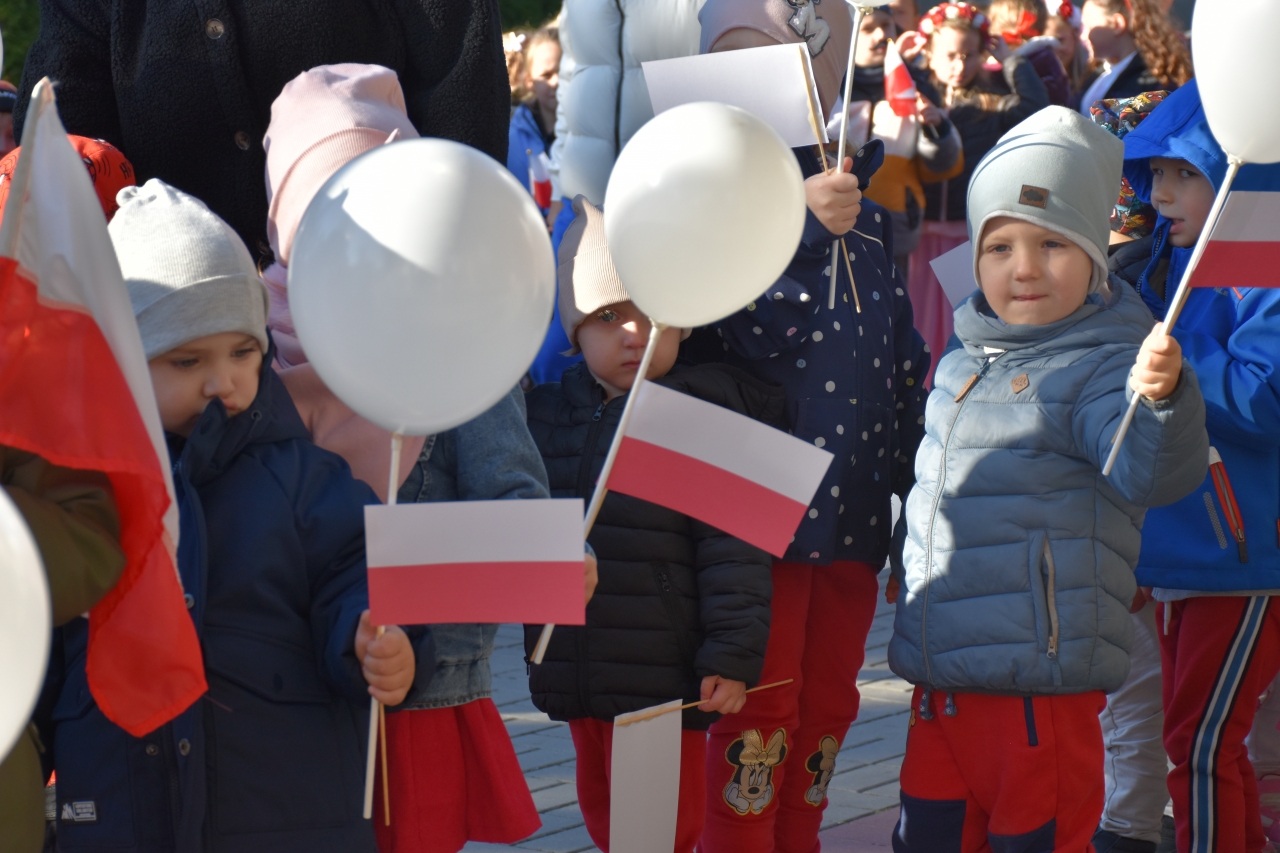 W dłoniach wielu uczniów powiewały biało-czerwone flagi, a balony w barwach narodowych dodawały wydarzeniu radosnego charakteru.