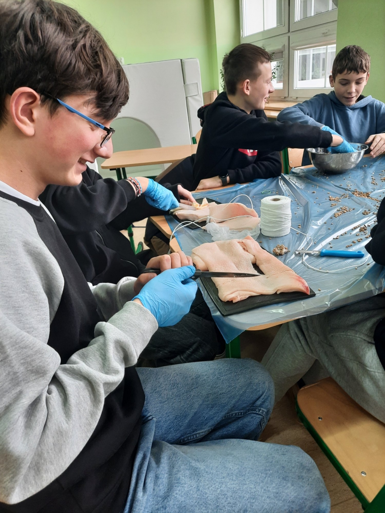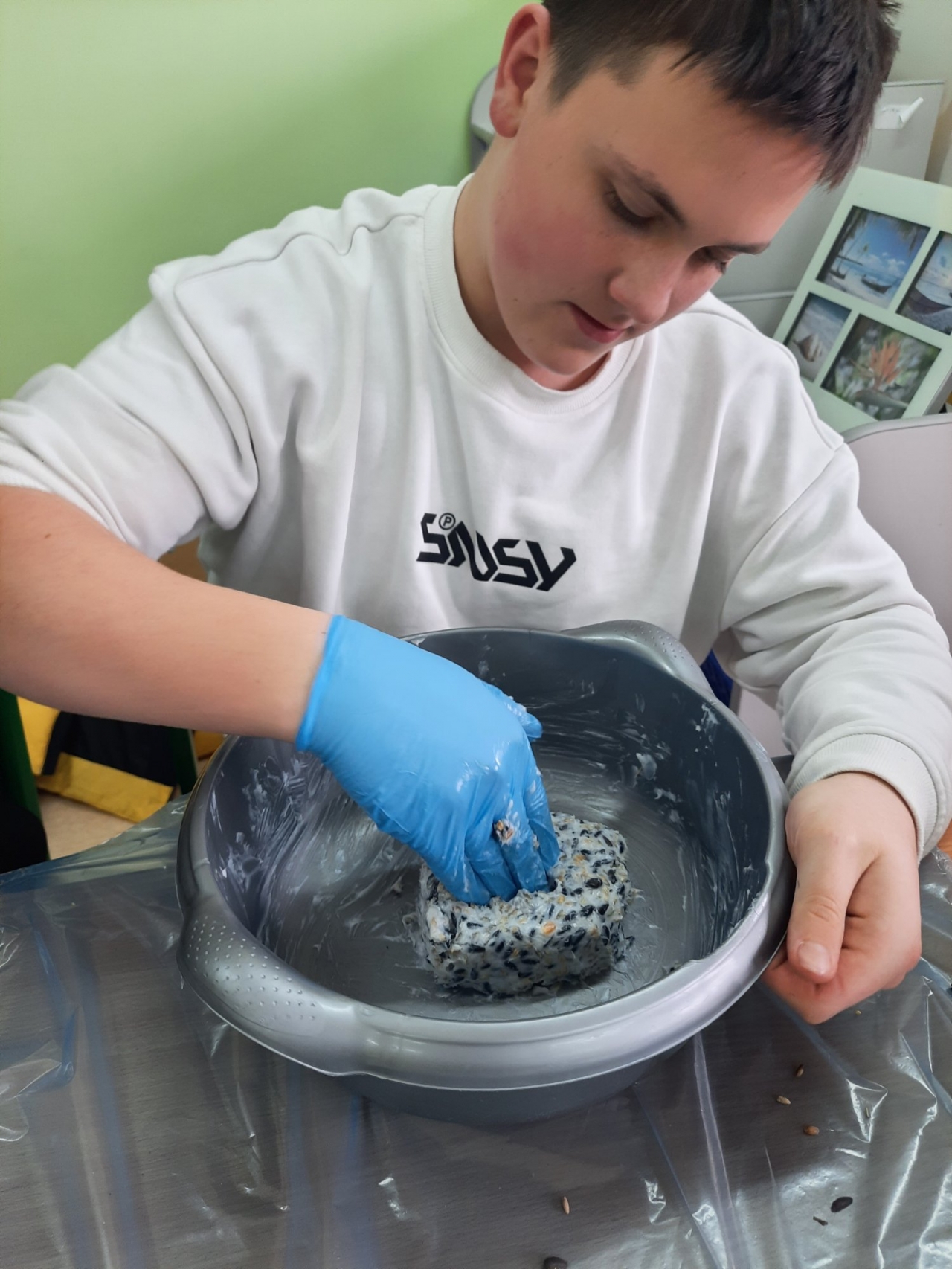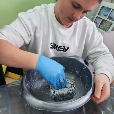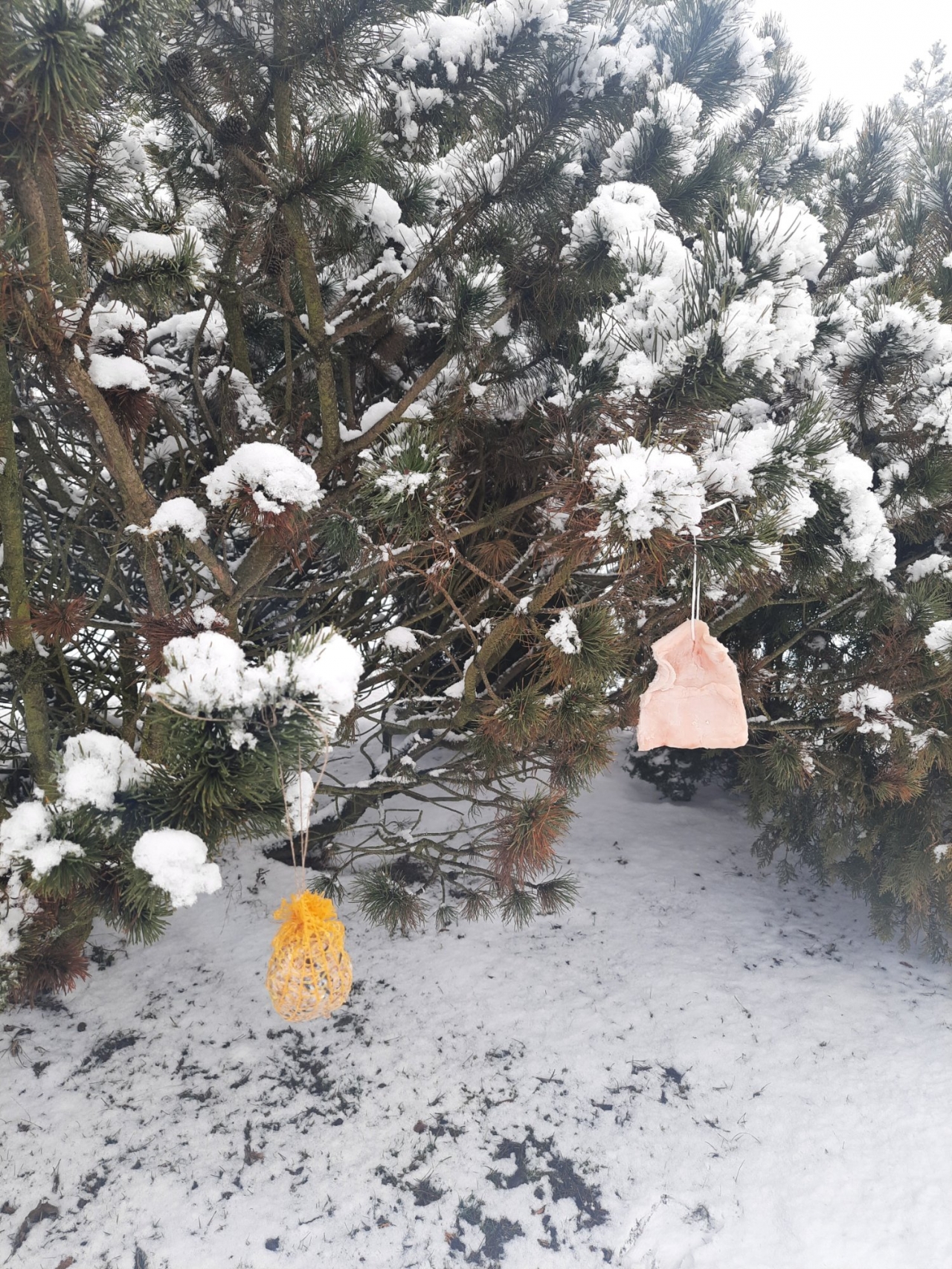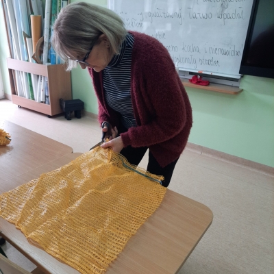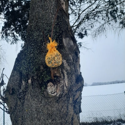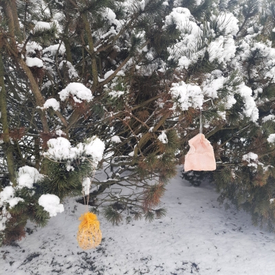 Wolontariusze – pod czujnym okiem opiekunek, wykonali zawieszki z produktów, które nie szkodzą naszym skrzydlatym przyjaciołom. Naturalne, pozbawione przypraw ziarna zostały połączone z tłuszczem. Uformowane w ten sposób kule zostały rozwieszone na drzewach wokół szkoły. Nie zabrakło także tradycyjnej słoniny, która z pewnością pomoże przetrwać największe mrozy.