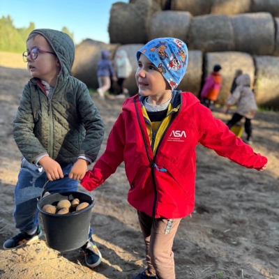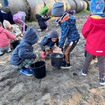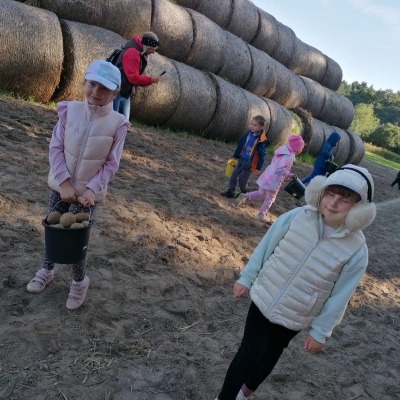 Po przybyciu na miejsce zajęcia rozpoczęliśmy wizytą na polu, gdzie dzieci samodzielnie zbierały ziemniaki, które później trafiły do ogniska. Podczas pieczenia się ziemniaczków przedszkolaki wysłuchały ciekawostek na temat ziemniaka – dowiedziały się, skąd przybył do Europy i jakie potrawy można z niego przygotować.