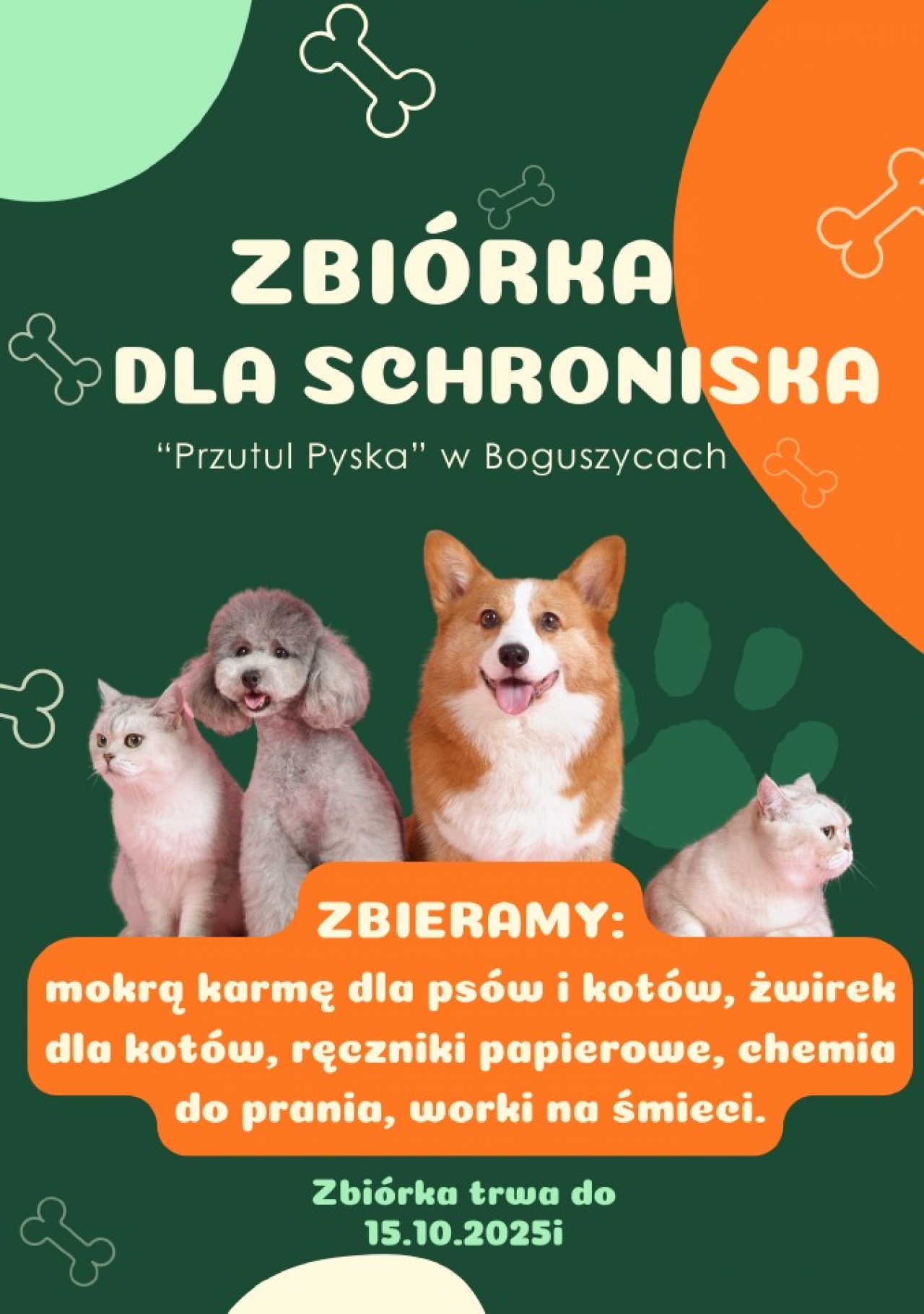 Akcja potrwa do 15.10.2025. Wszystkie zebrane dary zostaną przekazane podopiecznym schroniska.