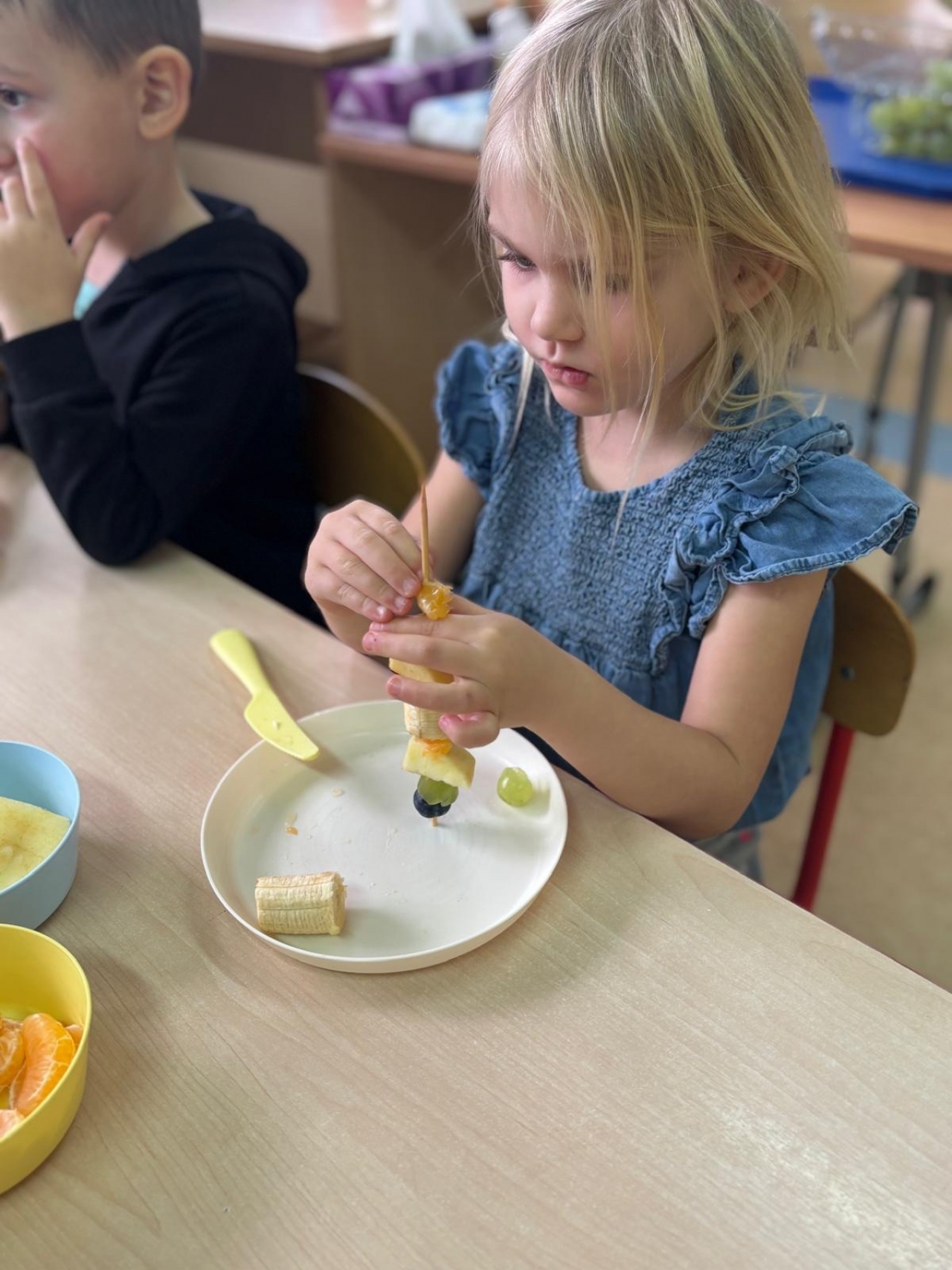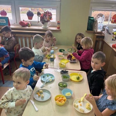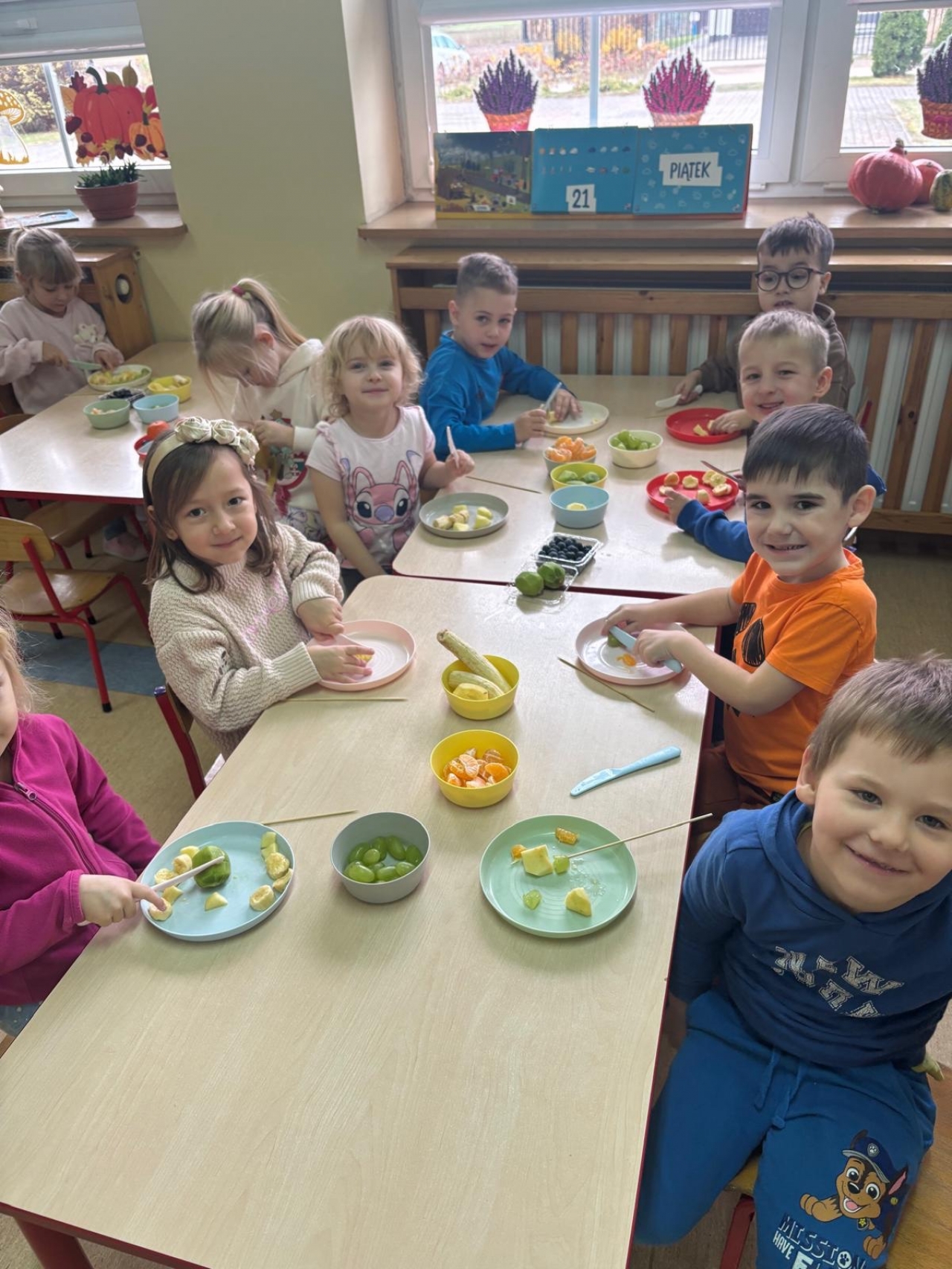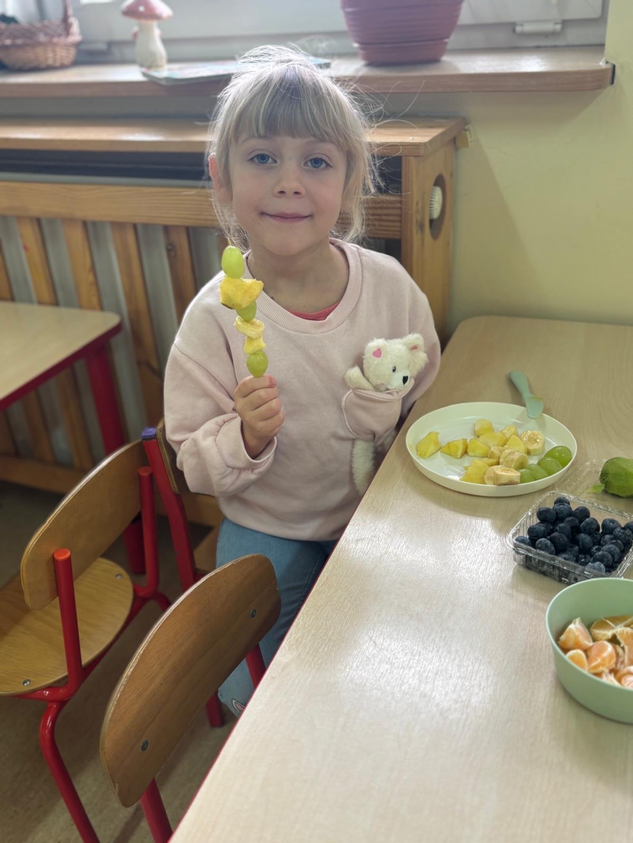 Największą atrakcją tygodnia było wspólne przygotowanie szaszłyków owocowych. Przedszkolaki z entuzjazmem wybierały ulubione owoce, kroiły je i tworzyły kolorowe, apetyczne przekąski. Była to świetna okazja, aby pokazać, że zdrowe jedzenie może być nie tylko pożywne, ale także wyjątkowo smaczne i kolorowe.