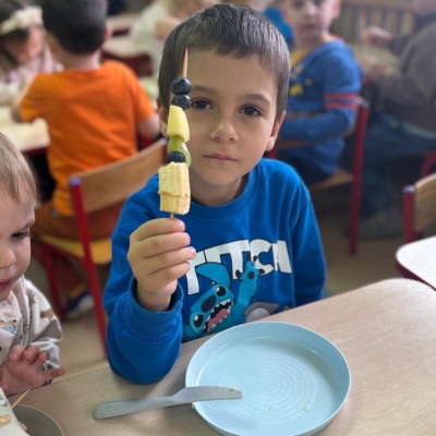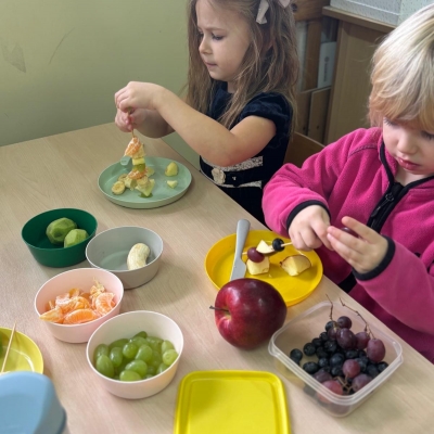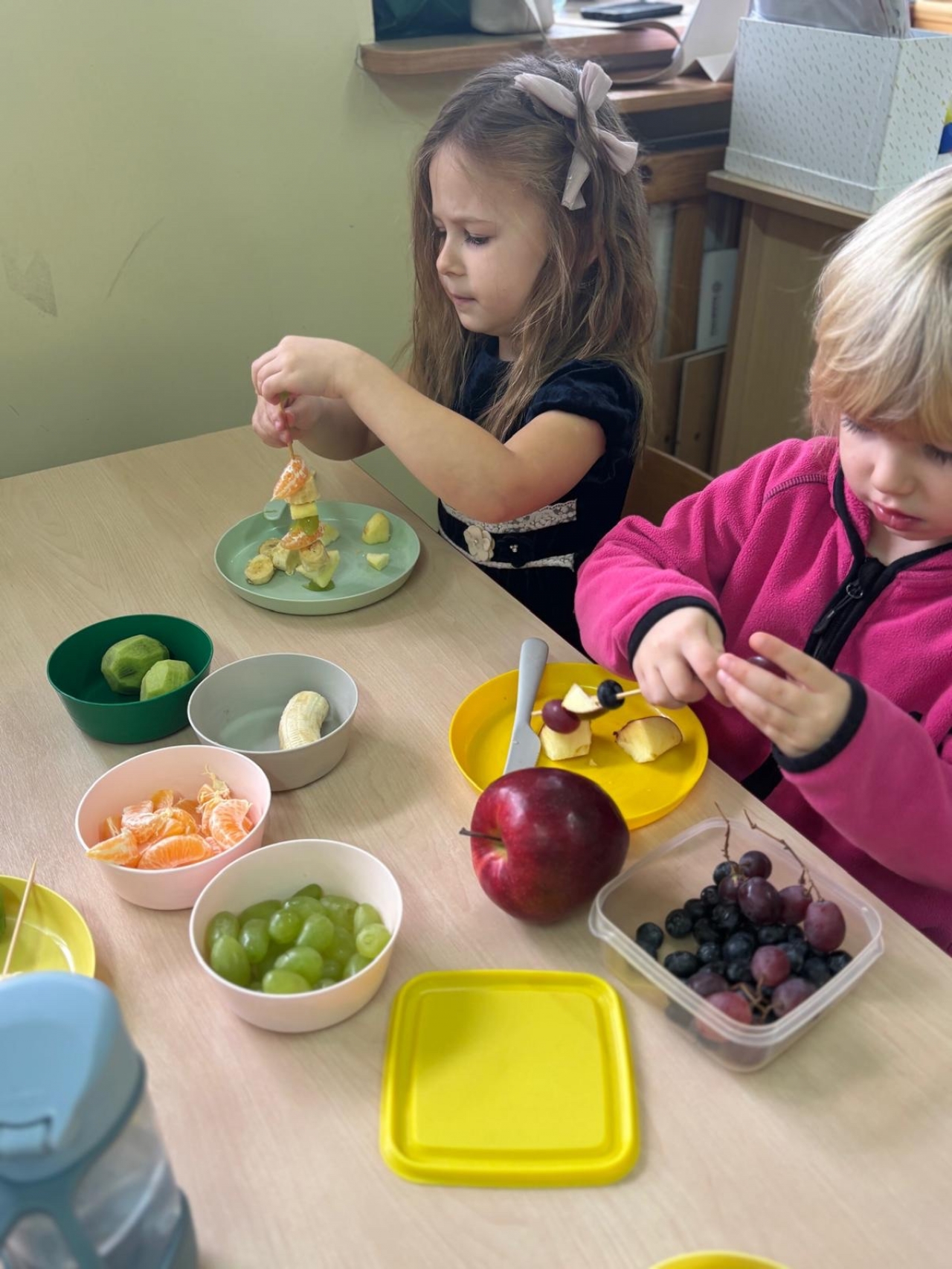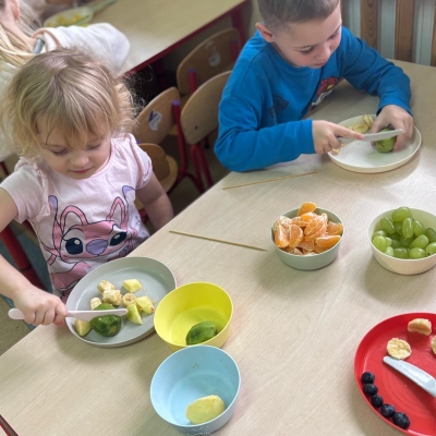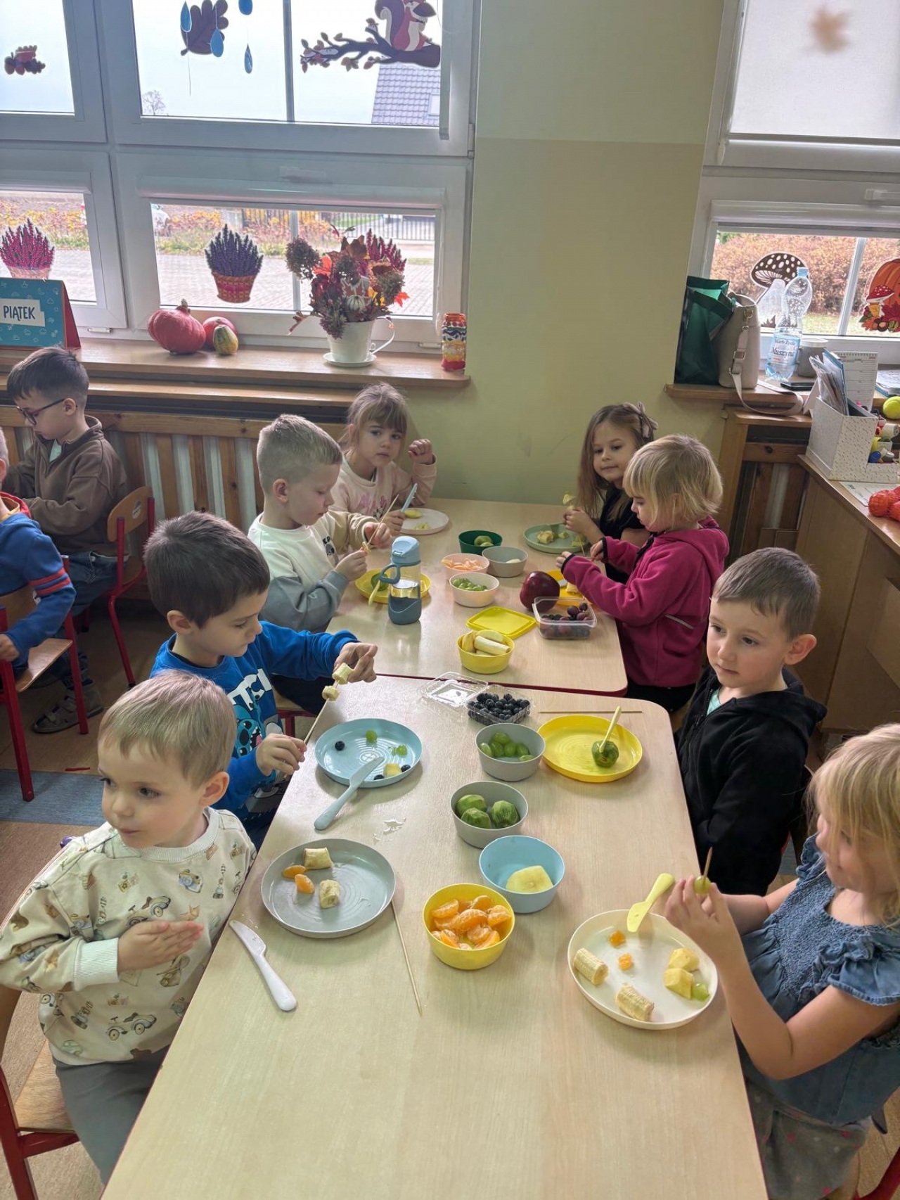 Największą atrakcją tygodnia było wspólne przygotowanie szaszłyków owocowych. Przedszkolaki z entuzjazmem wybierały ulubione owoce, kroiły je i tworzyły kolorowe, apetyczne przekąski. Była to świetna okazja, aby pokazać, że zdrowe jedzenie może być nie tylko pożywne, ale także wyjątkowo smaczne i kolorowe.
