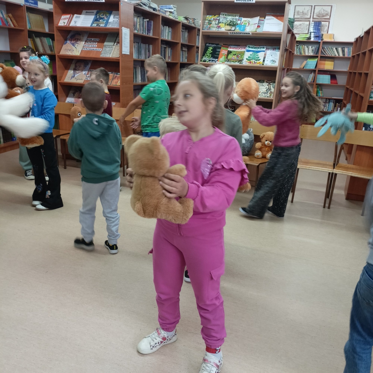 W tym dniu dzieci przyszły do biblioteki ze swoimi ulubionymi pluszakami. Już w drzwiach witał ich ogromny pluszowy miś, któremu podawały rękę. Dzieci poznały historię powstania pluszowego misia a potem opowiadały o swoich misiach.