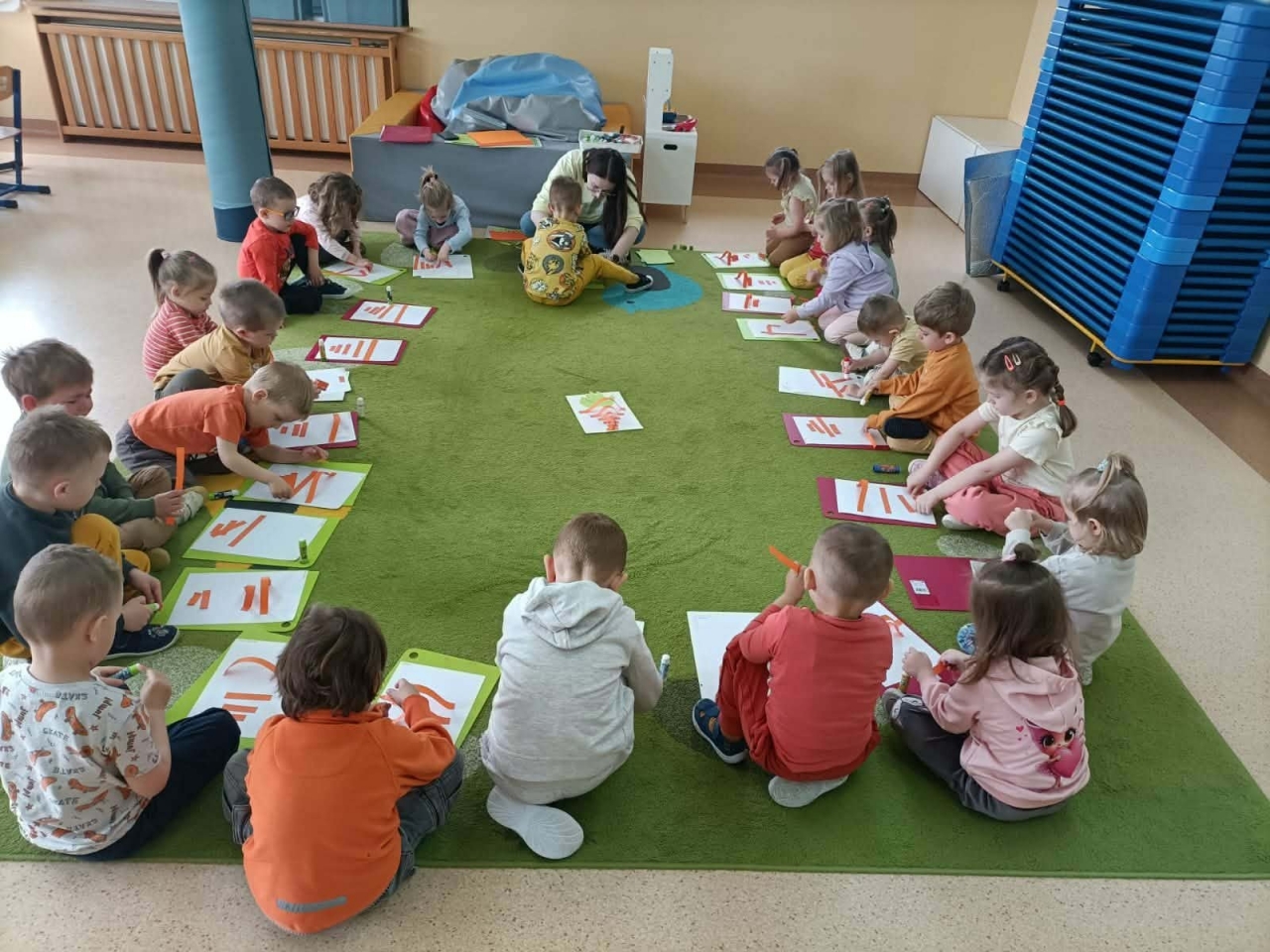 Już od samego rana w przedszkolu królował kolor pomarańczowy! Dzieci przyszły ubrane w marchewkowe stroje, opaski i dodatki, co wprowadziło wszystkich w radosny nastrój.