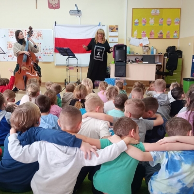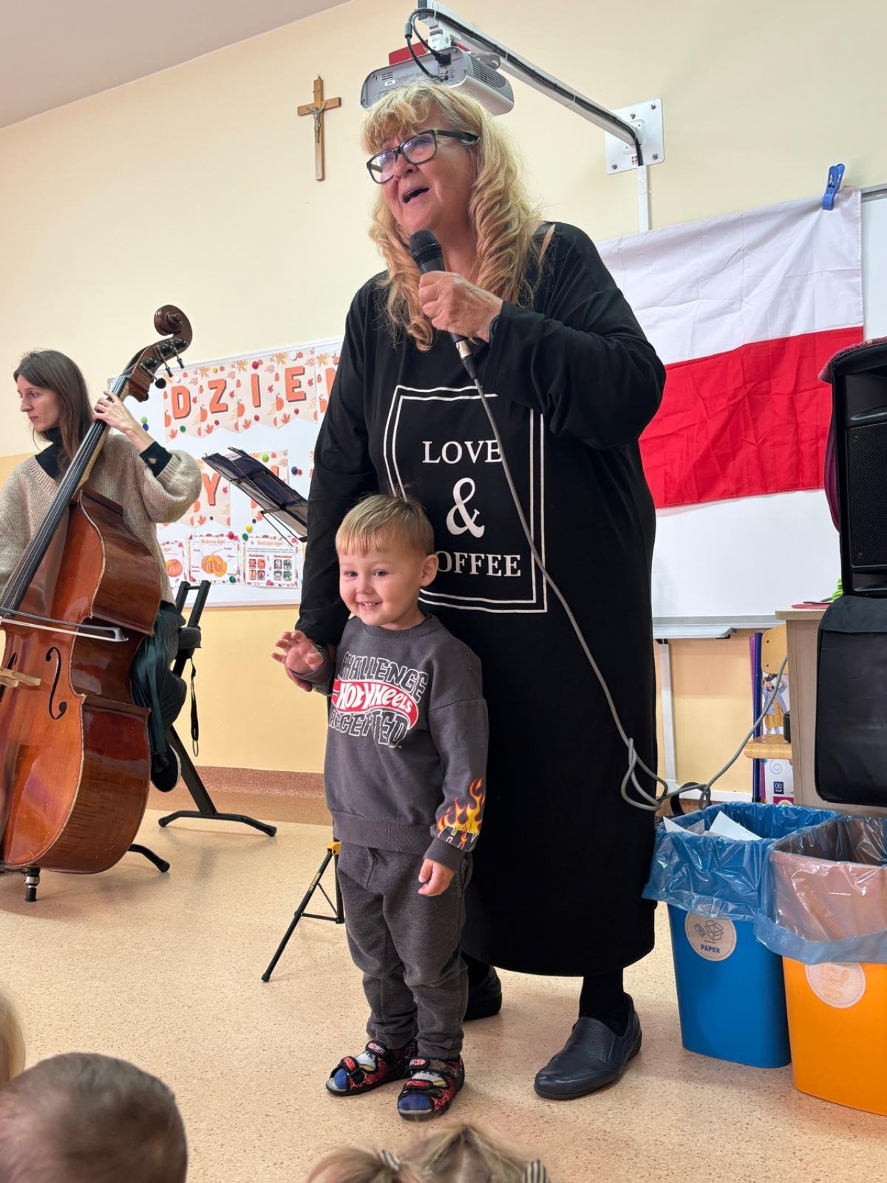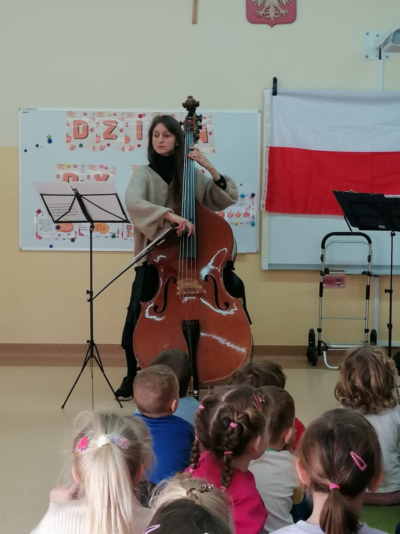 W dniu 12.11.2025r. w przedszkolu odbył się cykliczny koncert poprowadzony przez panią Joannę- kontrabasistkę oraz panią Alinę Zwoźniak . Dzieci słuchały i śpiewały piosenki o tematyce narodowej , a także wysłuchały utworów wykonanych na kontrabasie takich , jak: polonez Ogińskiego ,,Pożegnanie Ojczyzny” , włoskich utworów muzyki poważnej oraz tango ,,La Paloma”.Dzieci miały też okazję schować się w ogromnym futerale oraz porównać swój wzrost z wysokością instrumentu. Spotkanie dostarczyło przedszkolakom wiele muzycznych doznań, ale i spontanicznej radości.