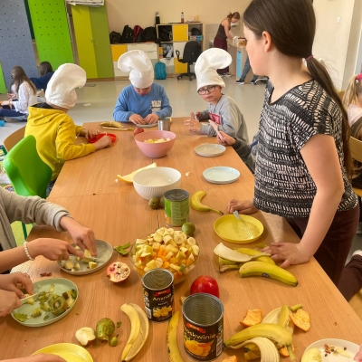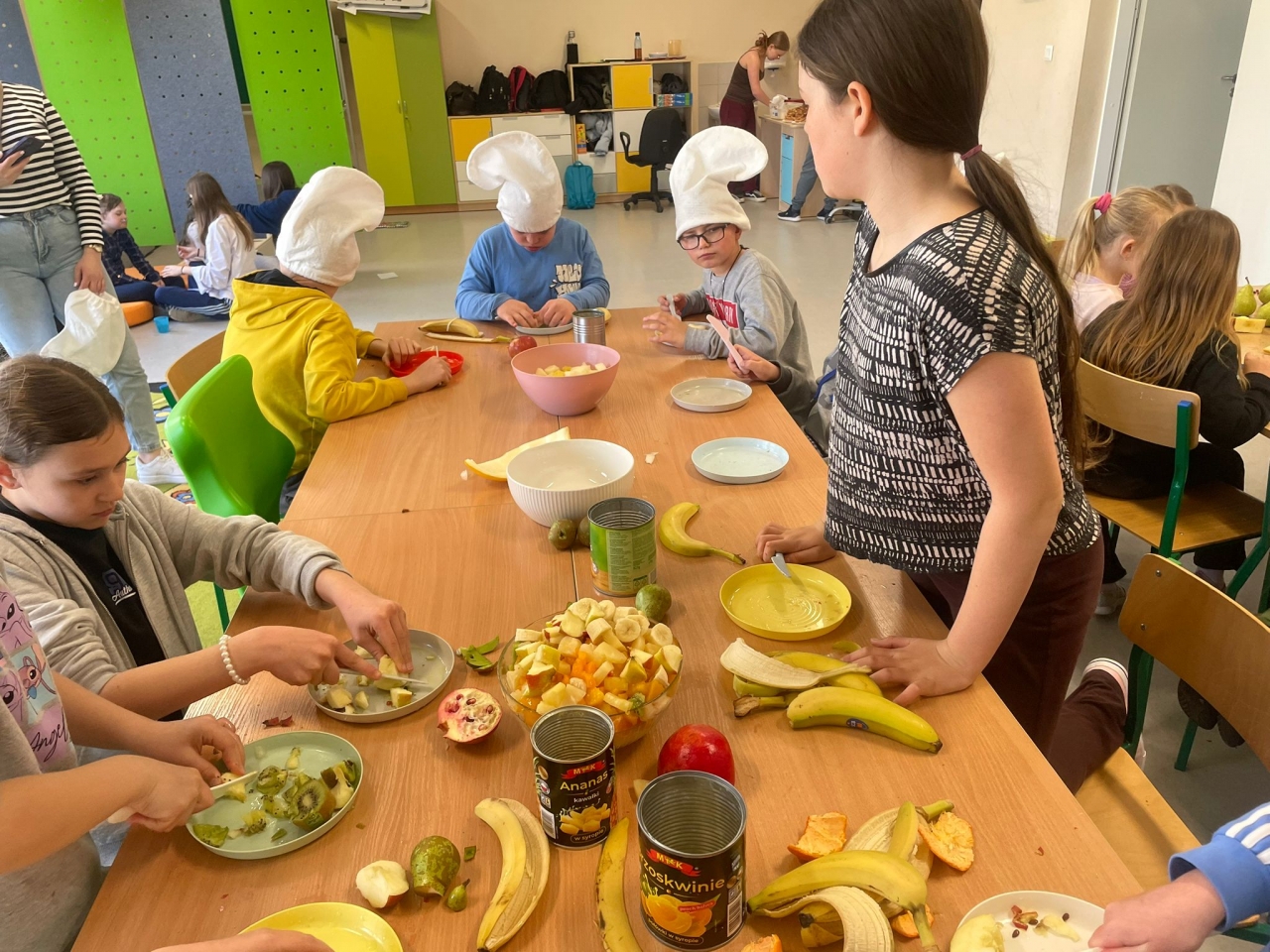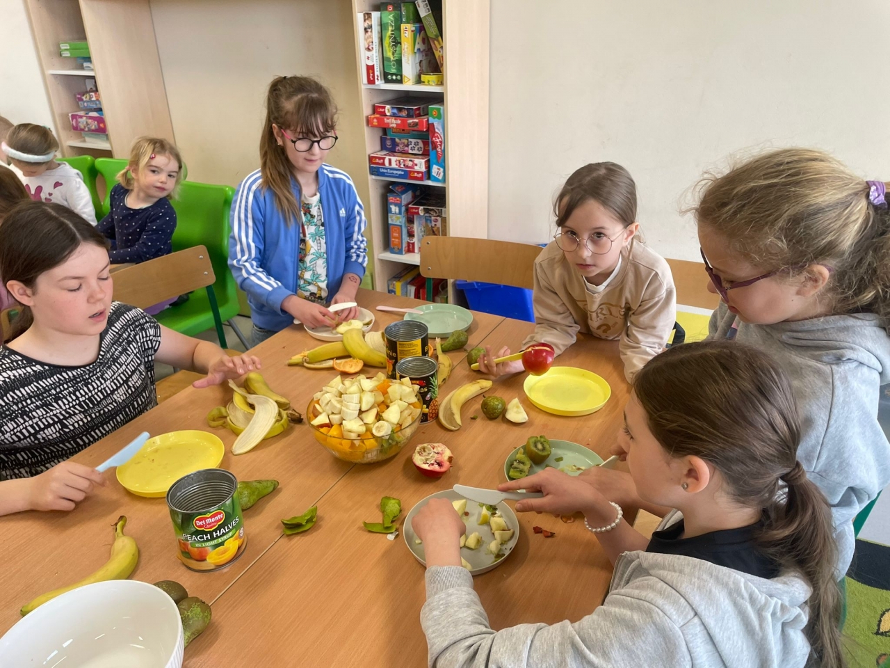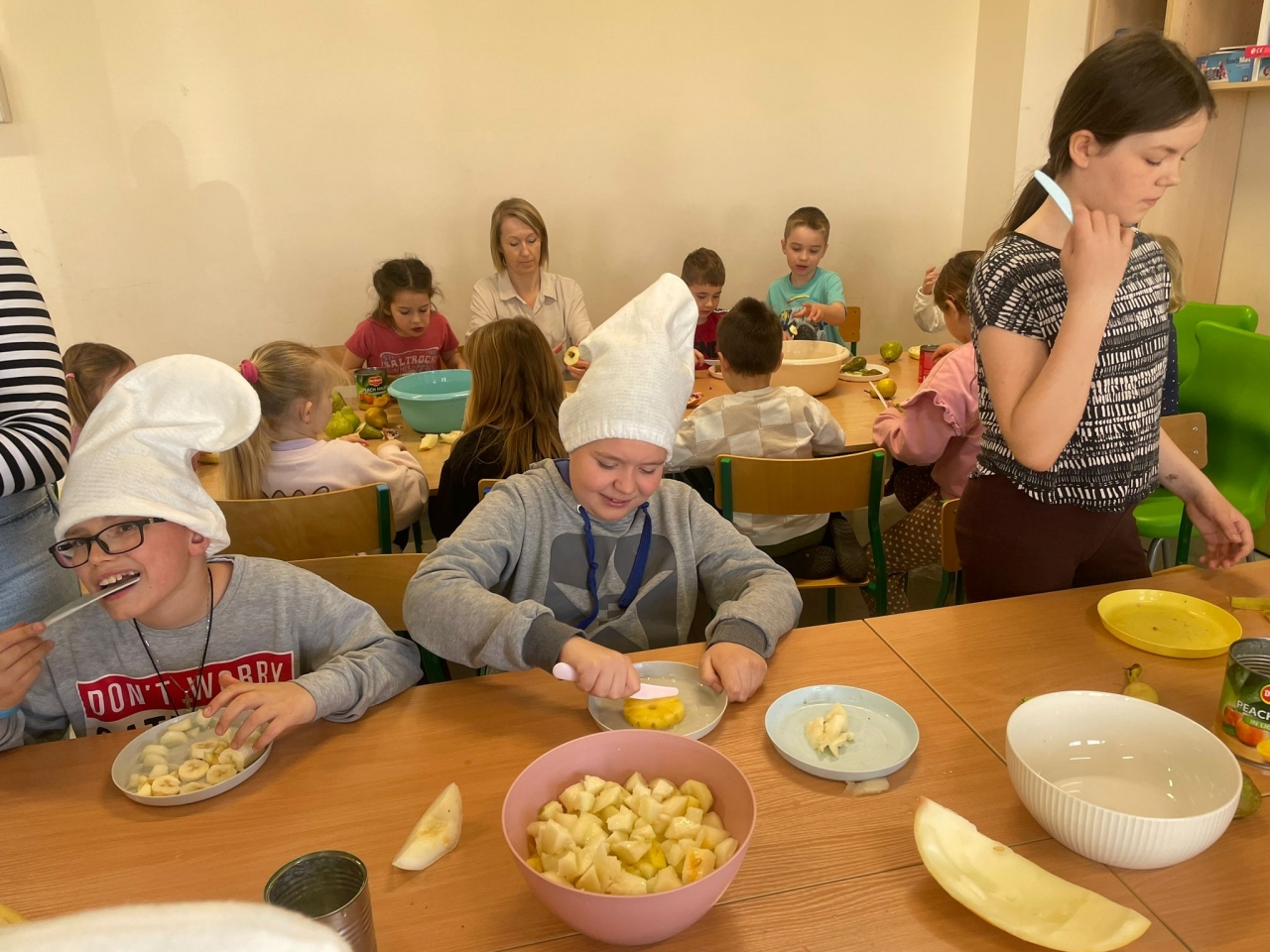 Wspólnie przygotowaliśmy różnorodne warsztaty, które pozwoliły wszystkim aktywnie spędzić czas i odkryć swoje talenty. Uczniowie z entuzjazmem przygotowywali sałatki oraz gofry, a także brali udział w zajęciach artystycznych – malowali twarze, wykonywali brokatowe tatuaże oraz tworzyli prace plastyczne.