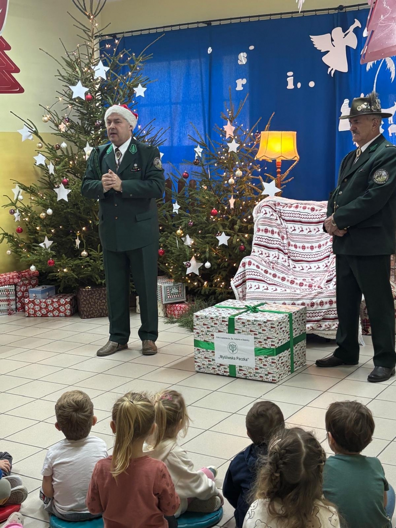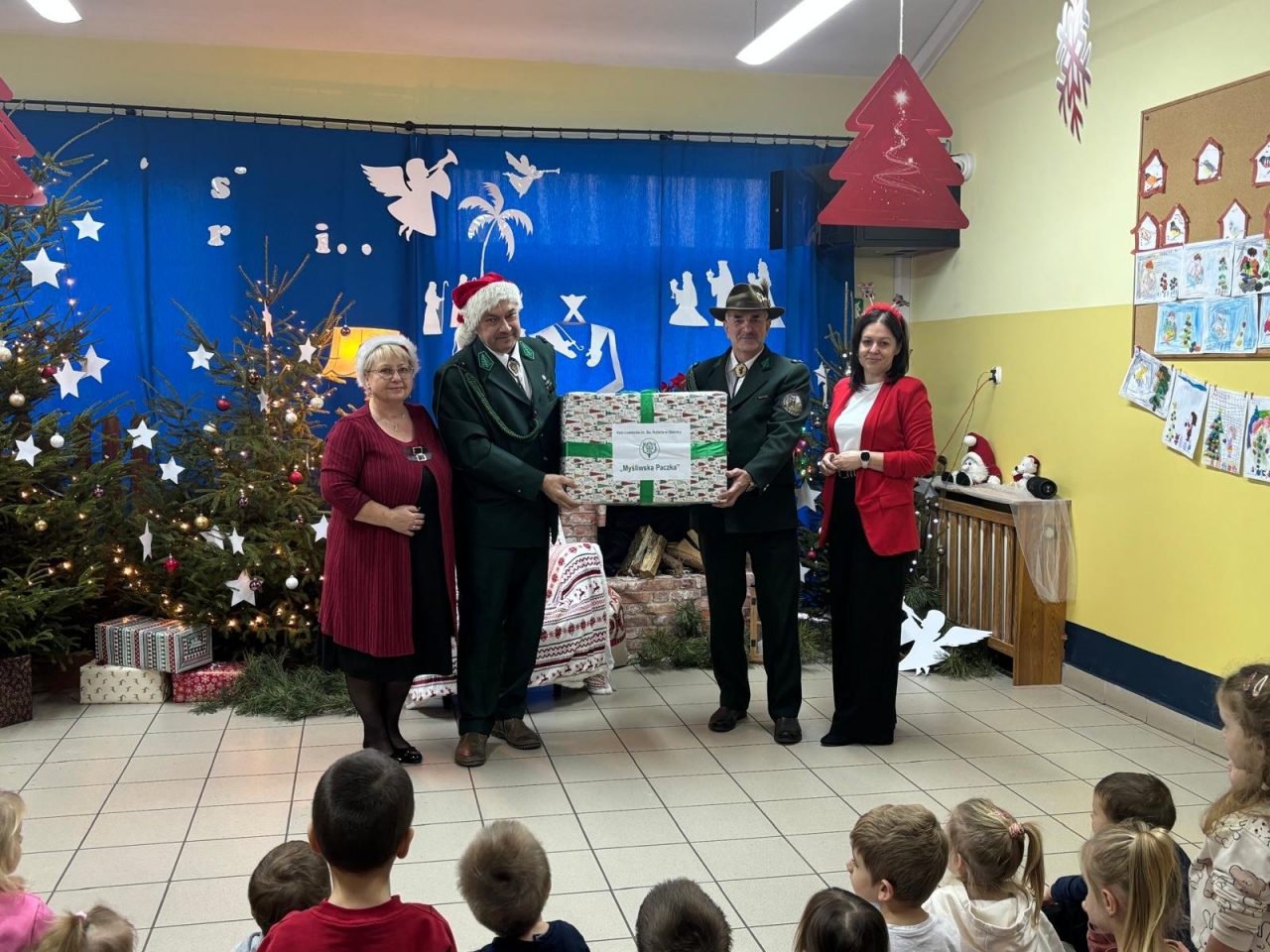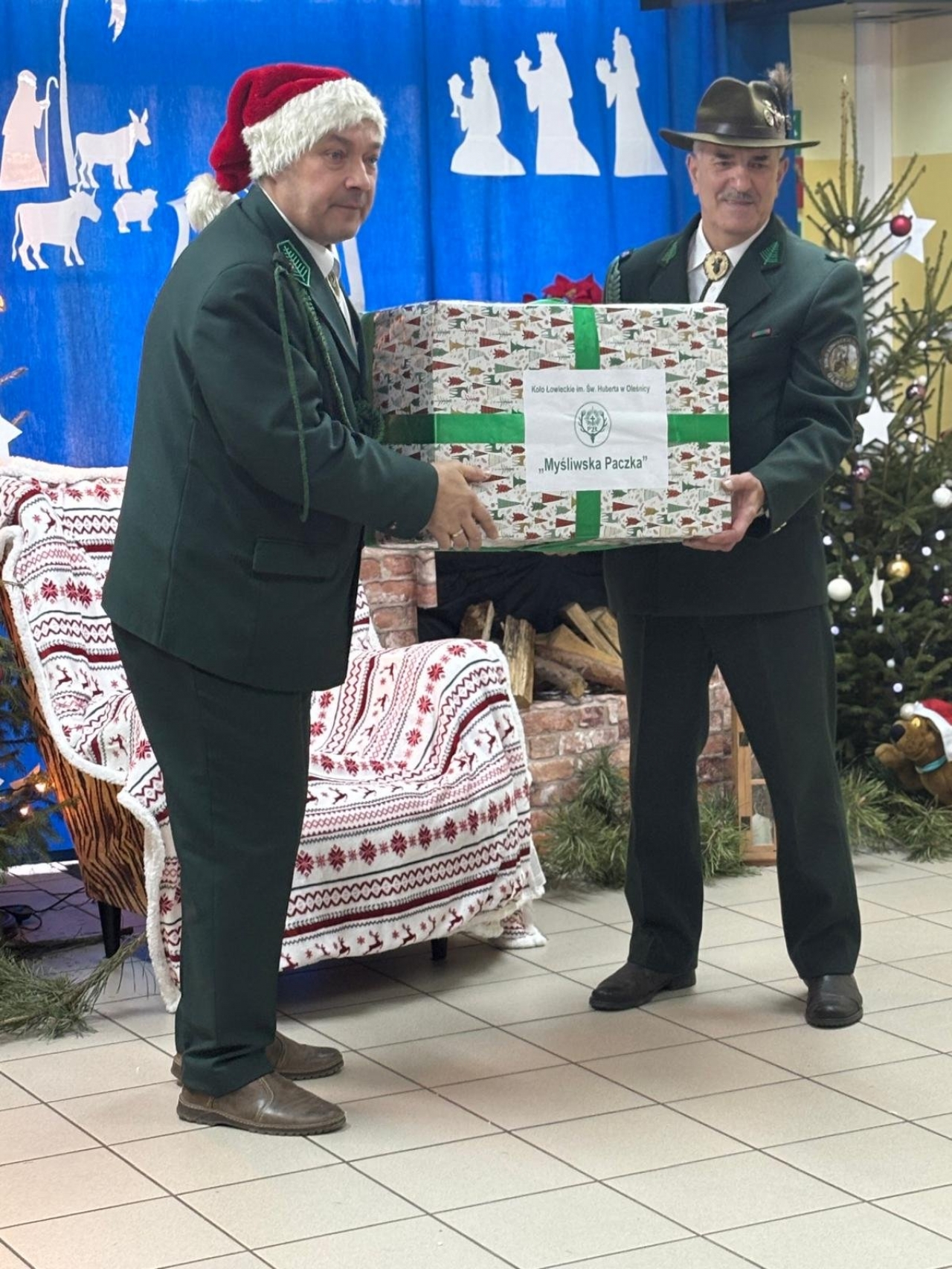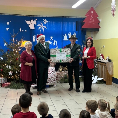 nasze przedszkole odwiedzili myśliwi z Koła Łowieckiego św. Hubert Oleśnica. Pan Piotr Małas oraz pan Jerzy Nagórny wręczyli na ręce pani dyrektor przygotowaną ,,Łowiecką paczkę” – prezent dla naszych przedszkolaków.