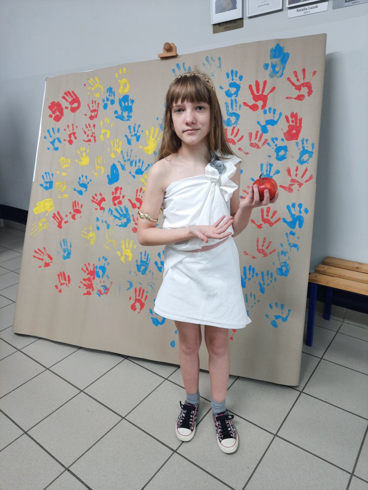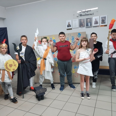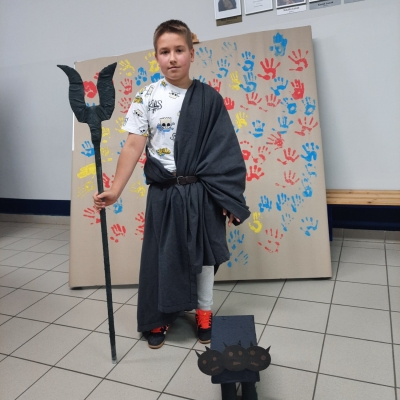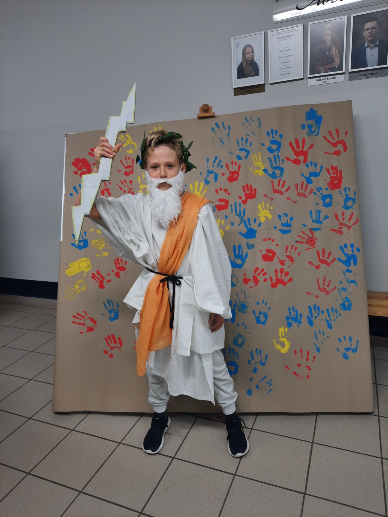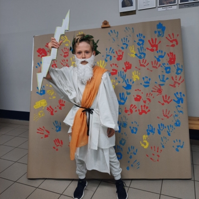 To już w naszej szkole tradycja, że na zakończenie omawiania historii starożytnej Grecji, uczniowie przebierają się za wybranego mitologicznego boga, herosa lub bohatera. Prezentacja postaci, przygotowane stroje oraz atrybuty uczyniły naszą lekcję wyjątkową. Jesteśmy przekonani, że na długo pamiętać będziemy o: Łukaszu – Hadesie i jego Cerberze, gromowładnym Adasiu – Zeusie, dzielnym Kacprze – Prometeuszu, Julce – Afrodycie, najpiękniejszej z bogiń, pomysłowym Adrianie – Dedalu, walecznym Błażeju – Aresie oraz słynącym ze swojej siły i sprytu Michale – Heraklesie.