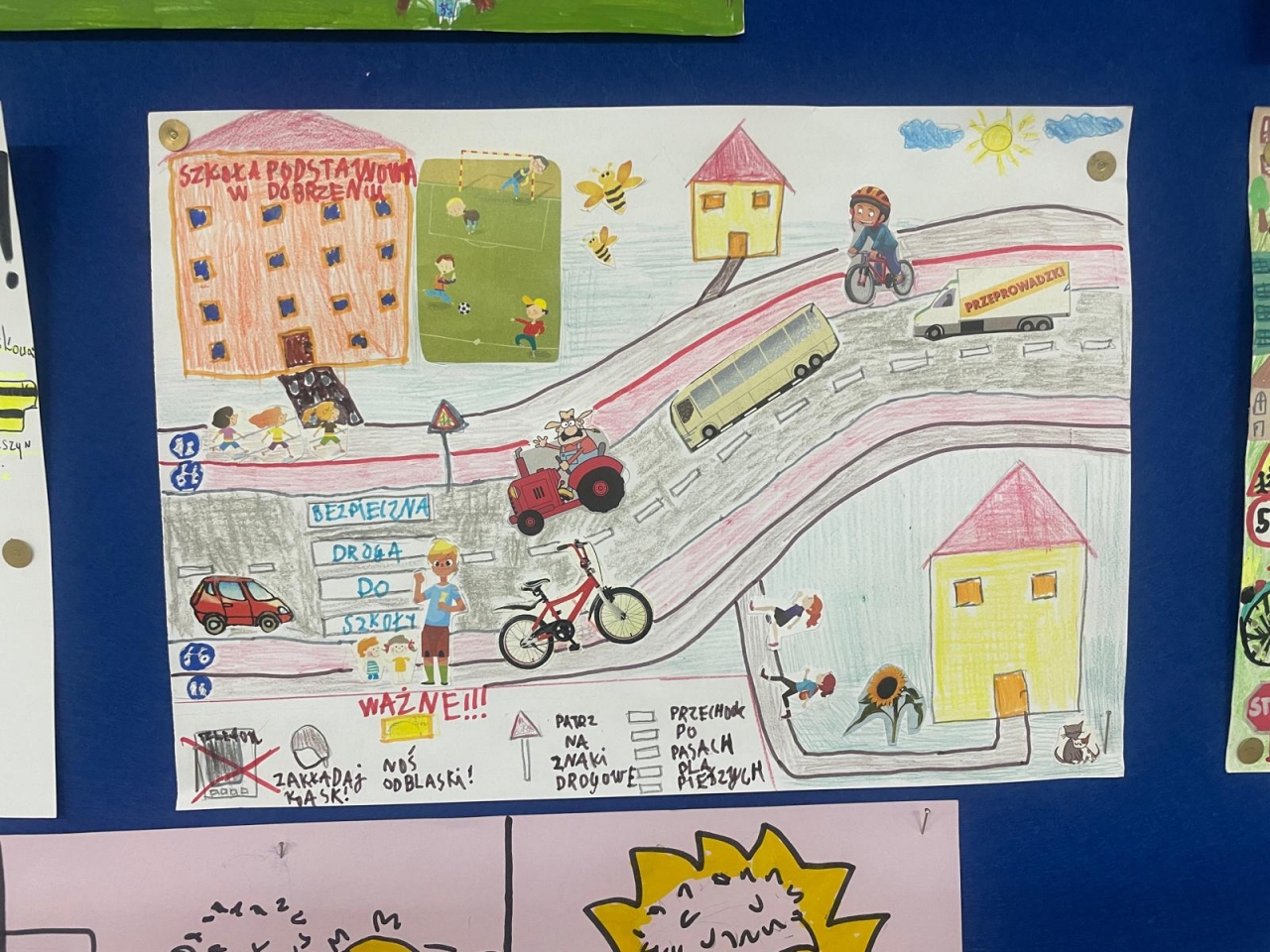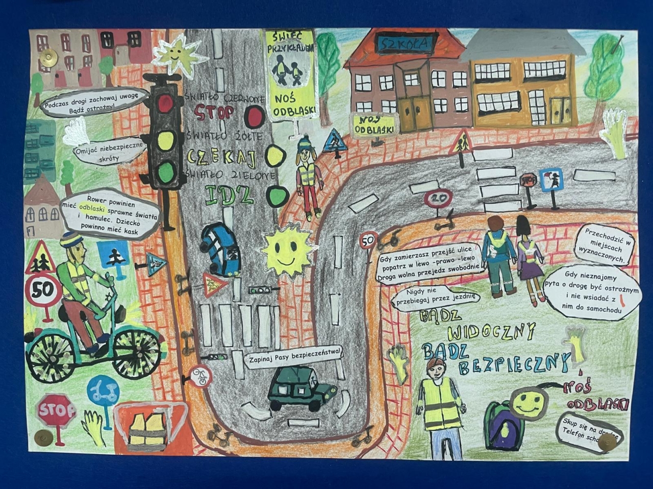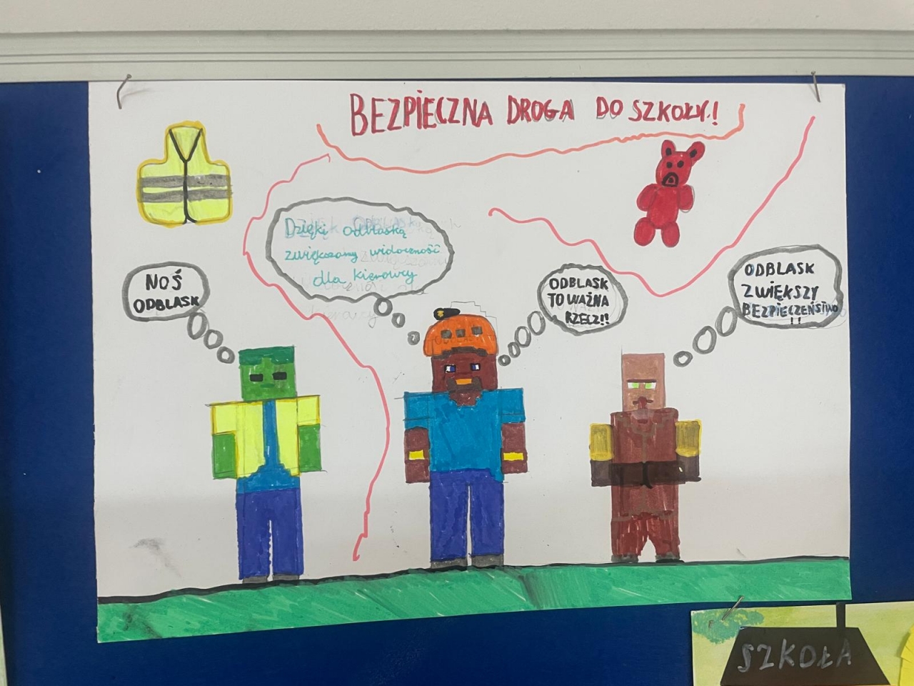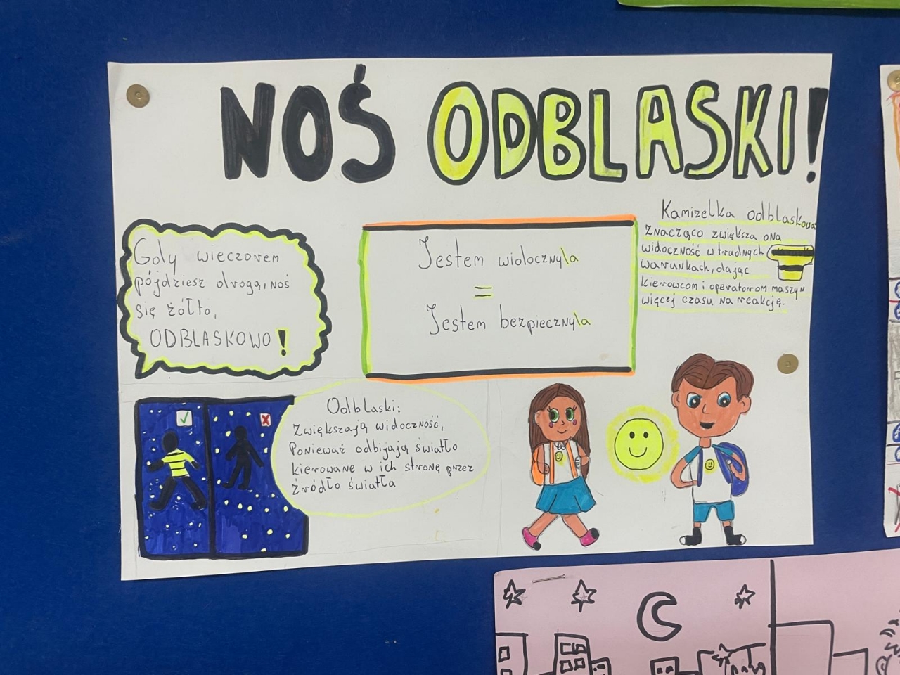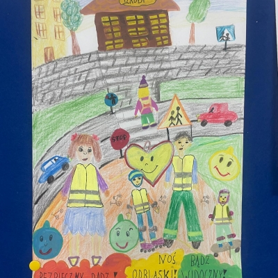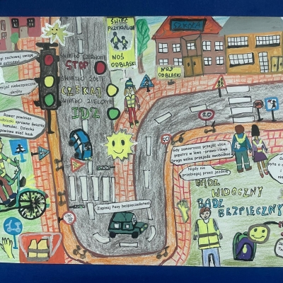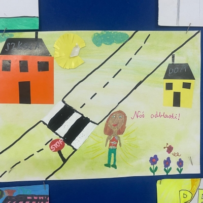 Nasza szkoła bierze udział w ogólnopolskim konkursie „Odblaskowa Szkoła”, którego celem jest promowanie bezpiecznego zachowania na drodze oraz noszenia elementów odblaskowych. Pierwszym etapem naszego udziału było wykonanie przez uczniów prac plastycznych i komiksów poświęconych tematyce bezpieczeństwa w ruchu drogowym. Uczniowie wykazali się ogromną kreatywnością i zaangażowaniem – ich dzieła przypominają, jak ważne jest bycie widocznym na drodze. Wszystkie prace można podziwiać w naszej Szkolnej Galerii Sztuki, gdzie tworzą barwną i pouczającą wystawę promującą bezpieczeństwo.