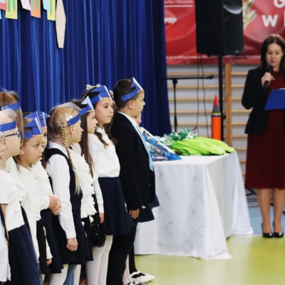 Pierwszoklasiści z dumą złożyli ślubowanie, obiecując być pilnymi uczniami, dobrymi kolegami i z radością odkrywać świat wiedzy. Aktu pasowania dokonała dyrektor szkoły Joanna Jaros, symbolicznie dotykając ramienia każdego ucznia ogromnym ołówkiem.