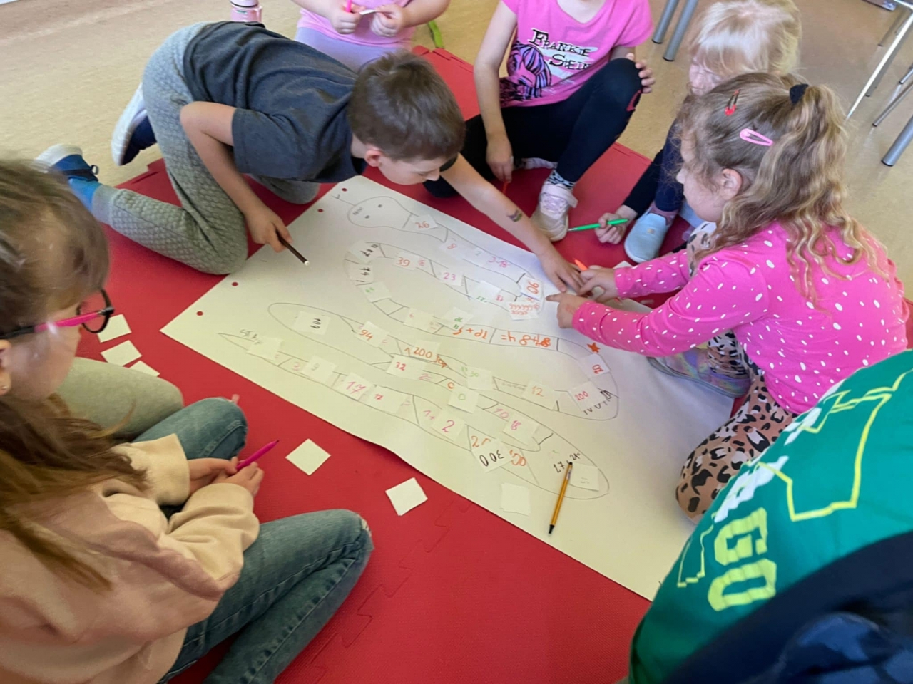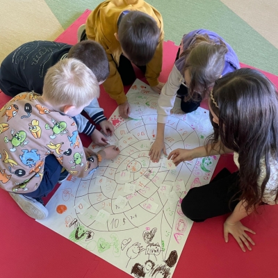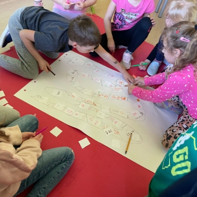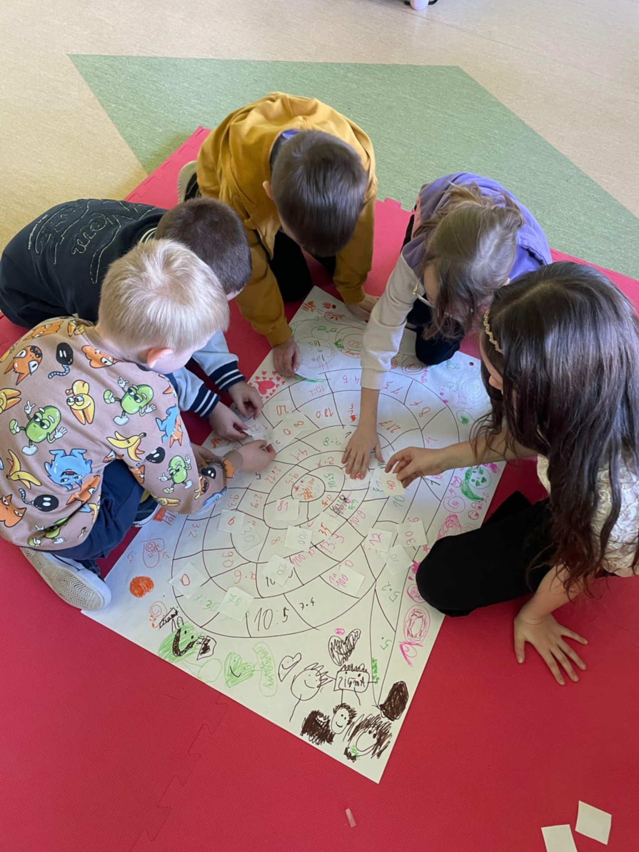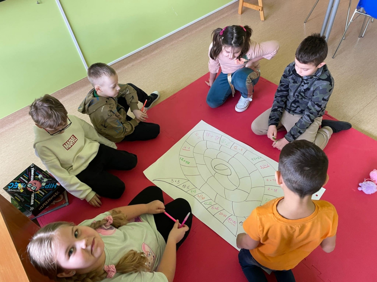 Tym razem skonstruowaliśmy grę planszową i na niej ćwiczyliśmy umiejętność dodawania i odejmowania, a grupa starsza mnożenia i dzielenia.