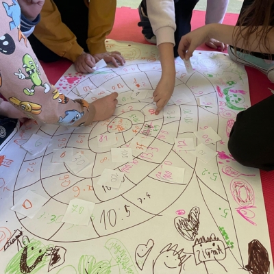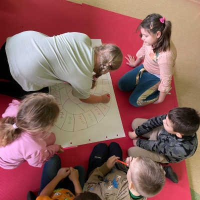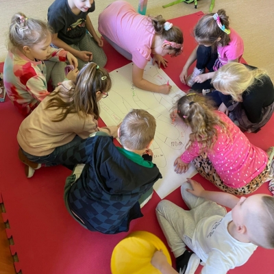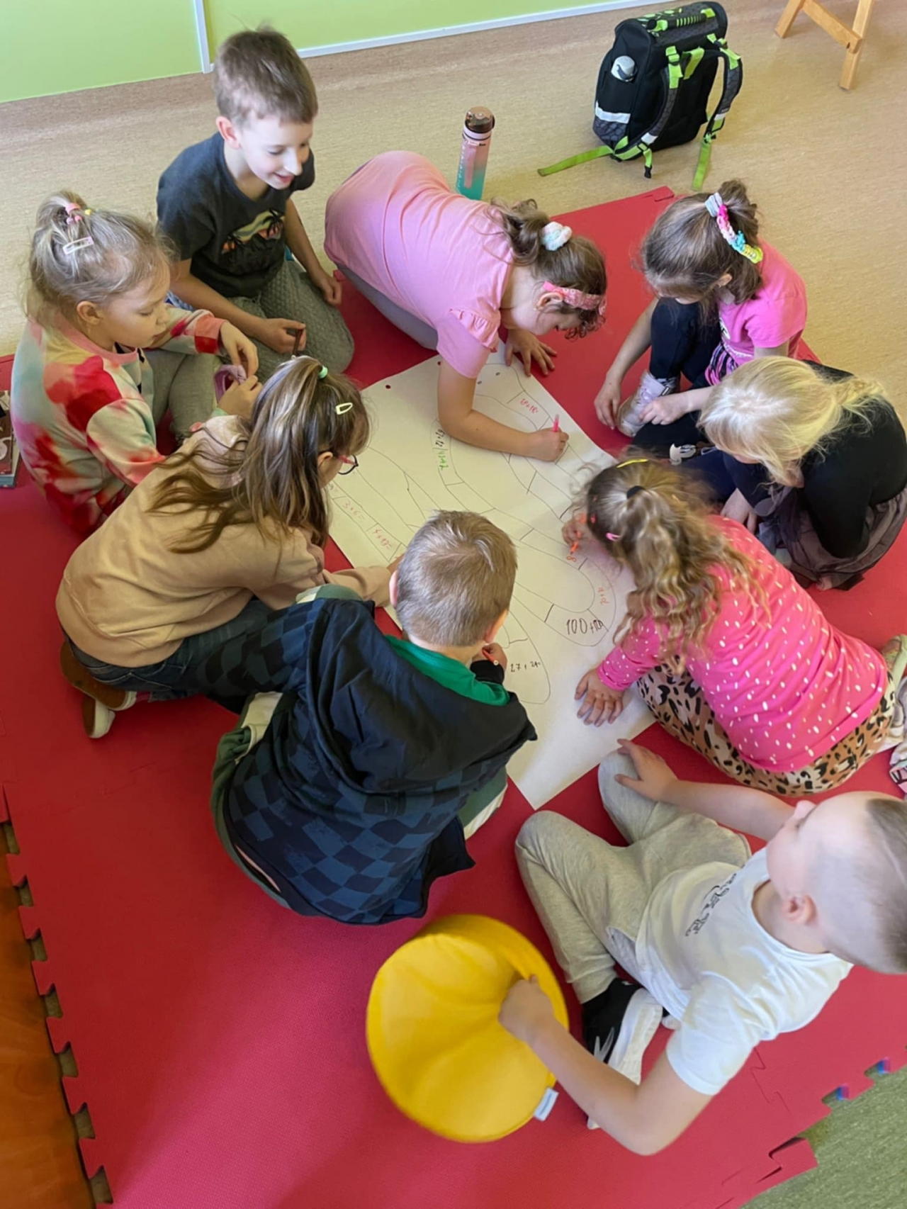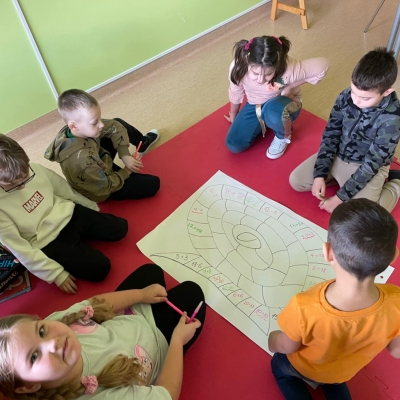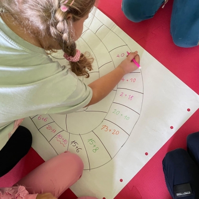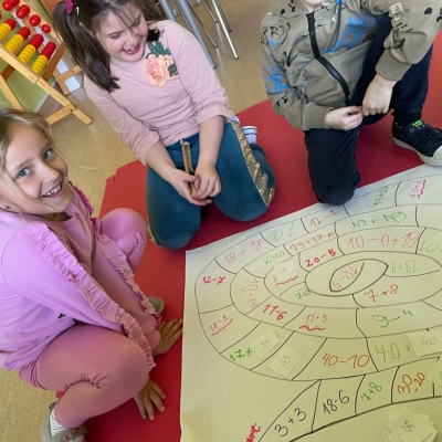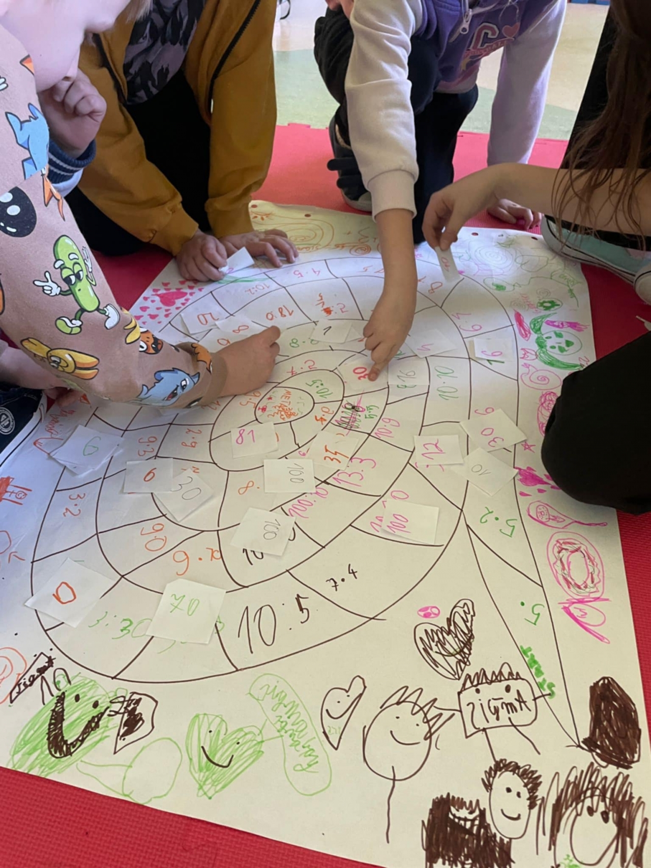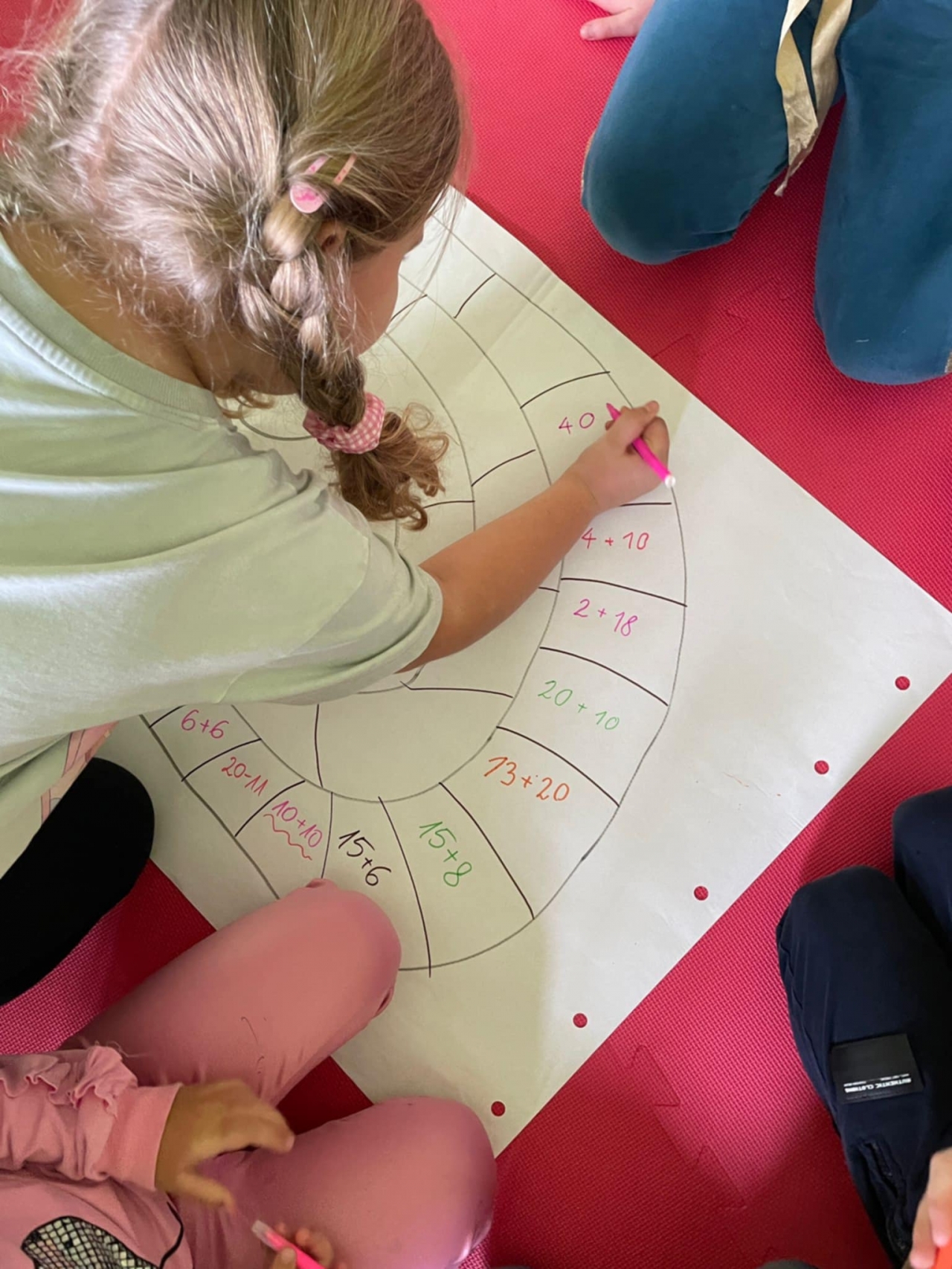Tym razem skonstruowaliśmy grę planszową i na niej ćwiczyliśmy umiejętność dodawania i odejmowania, a grupa starsza mnożenia i dzielenia.
