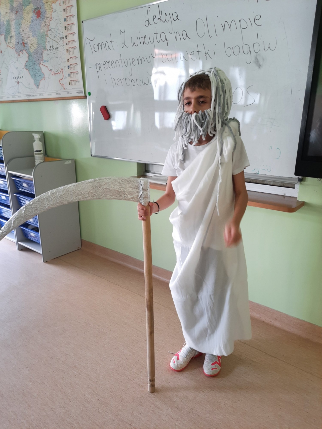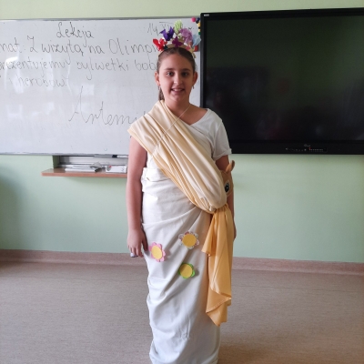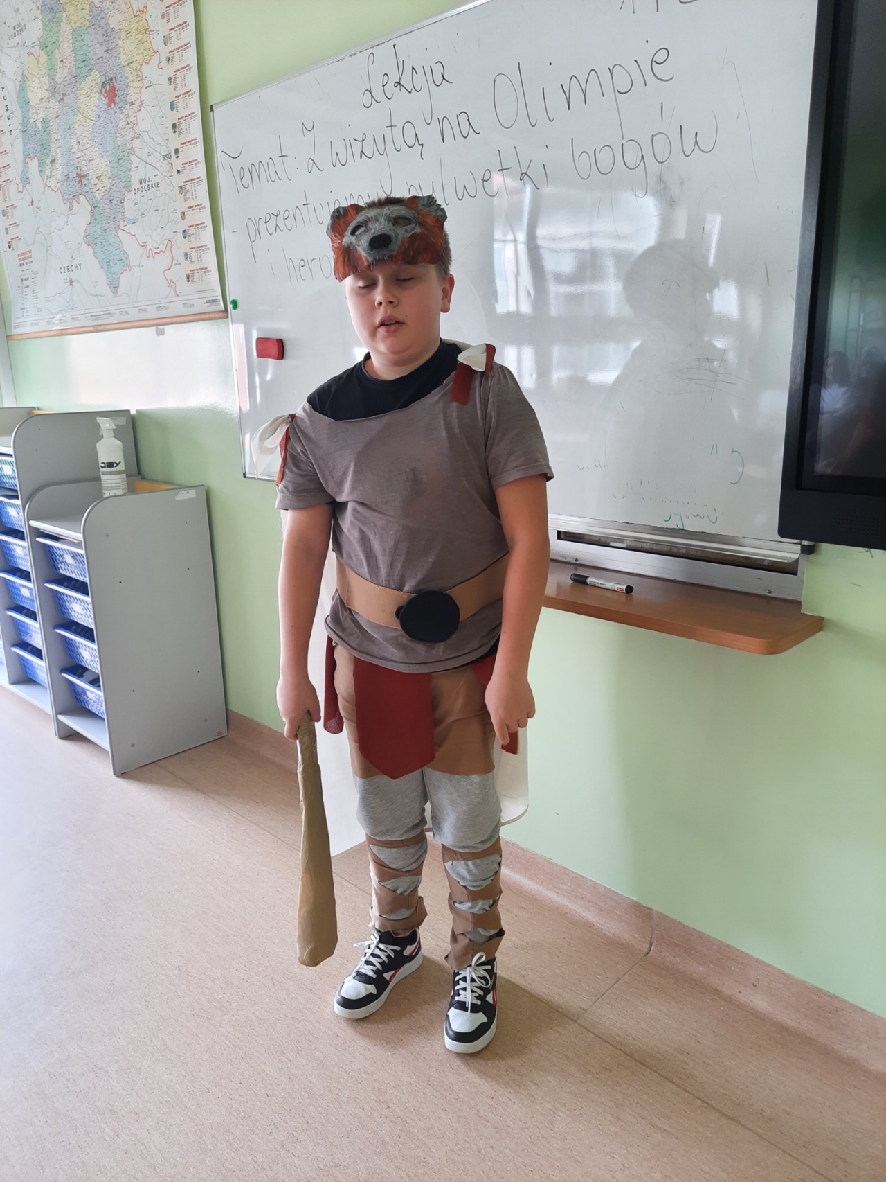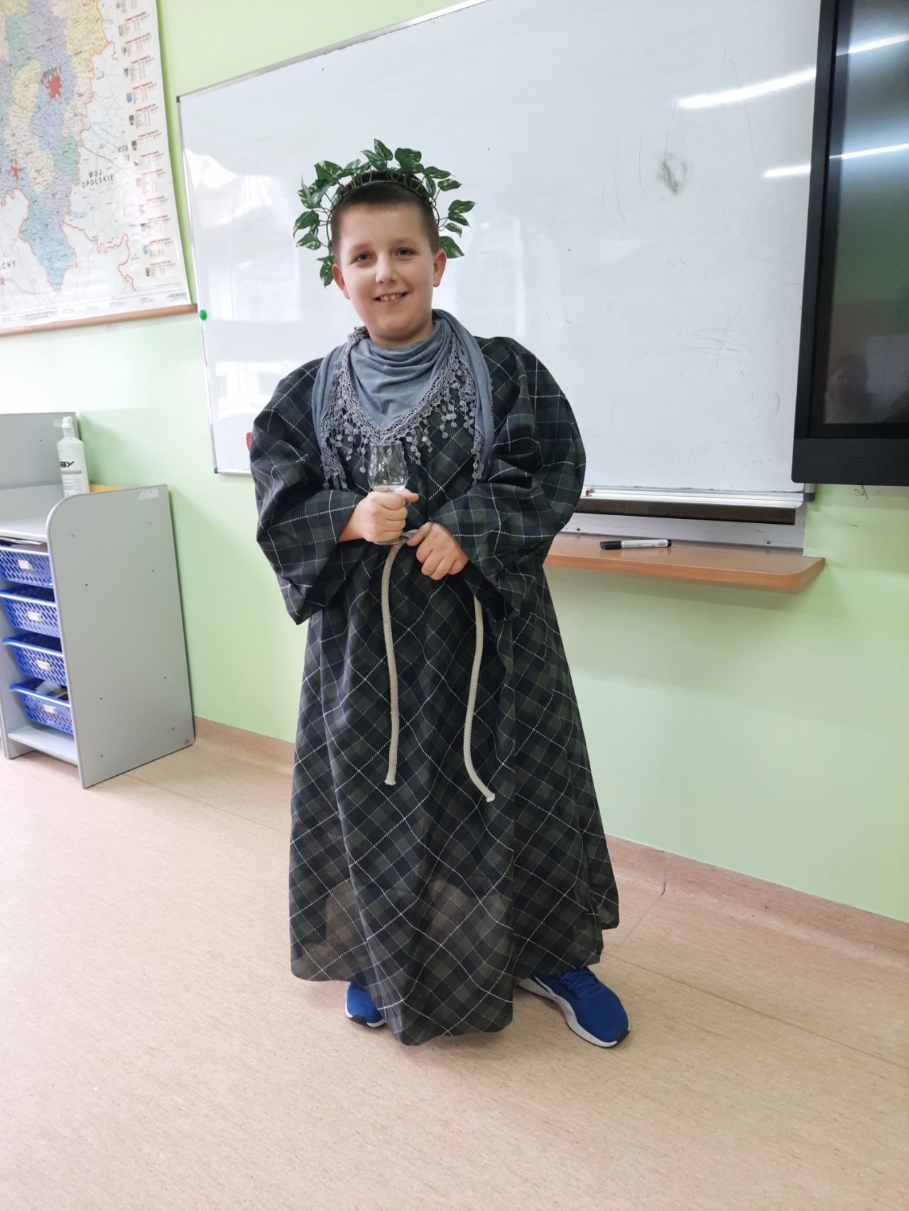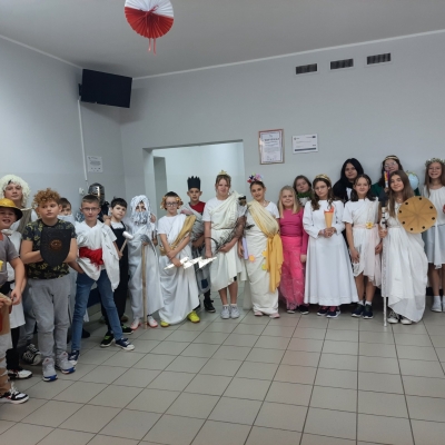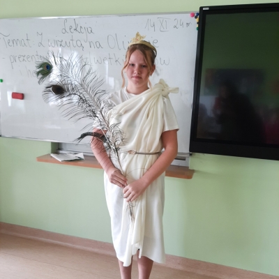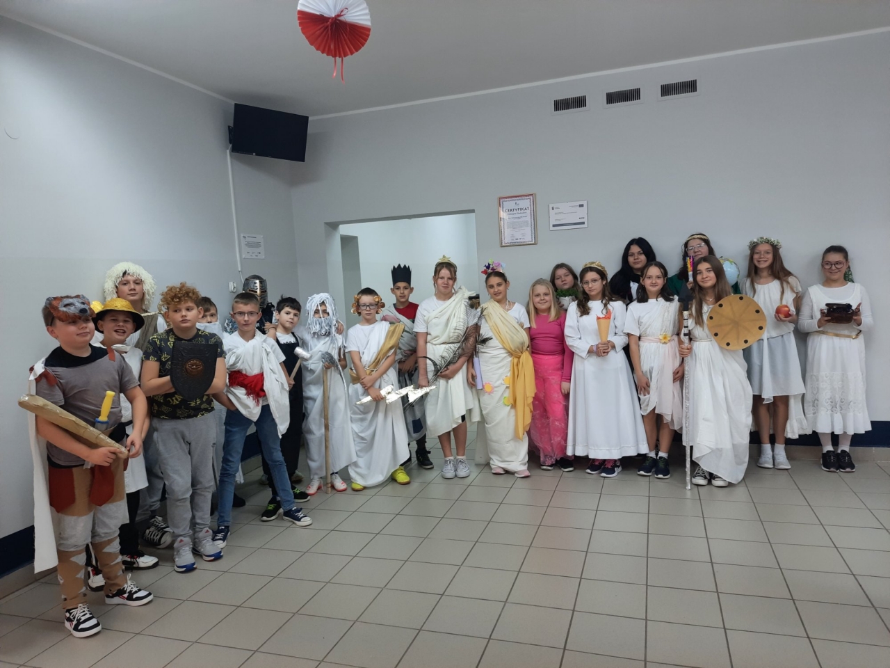 W ubiegły czwartek - podczas lekcji podsumowującej dział: ,,Starożytna Grecja”, piątoklasiści mieli okazję wcielić się w rolę bogów i herosów. Pięknie przebrani w ciekawy sposób opowiadali pochodzeniu i przygodach mitologicznych bohaterów. Wykazali się dużą wiedzą i pomysłowością. Ta lekcja z pewnością na długo pozostanie w ich pamięci.