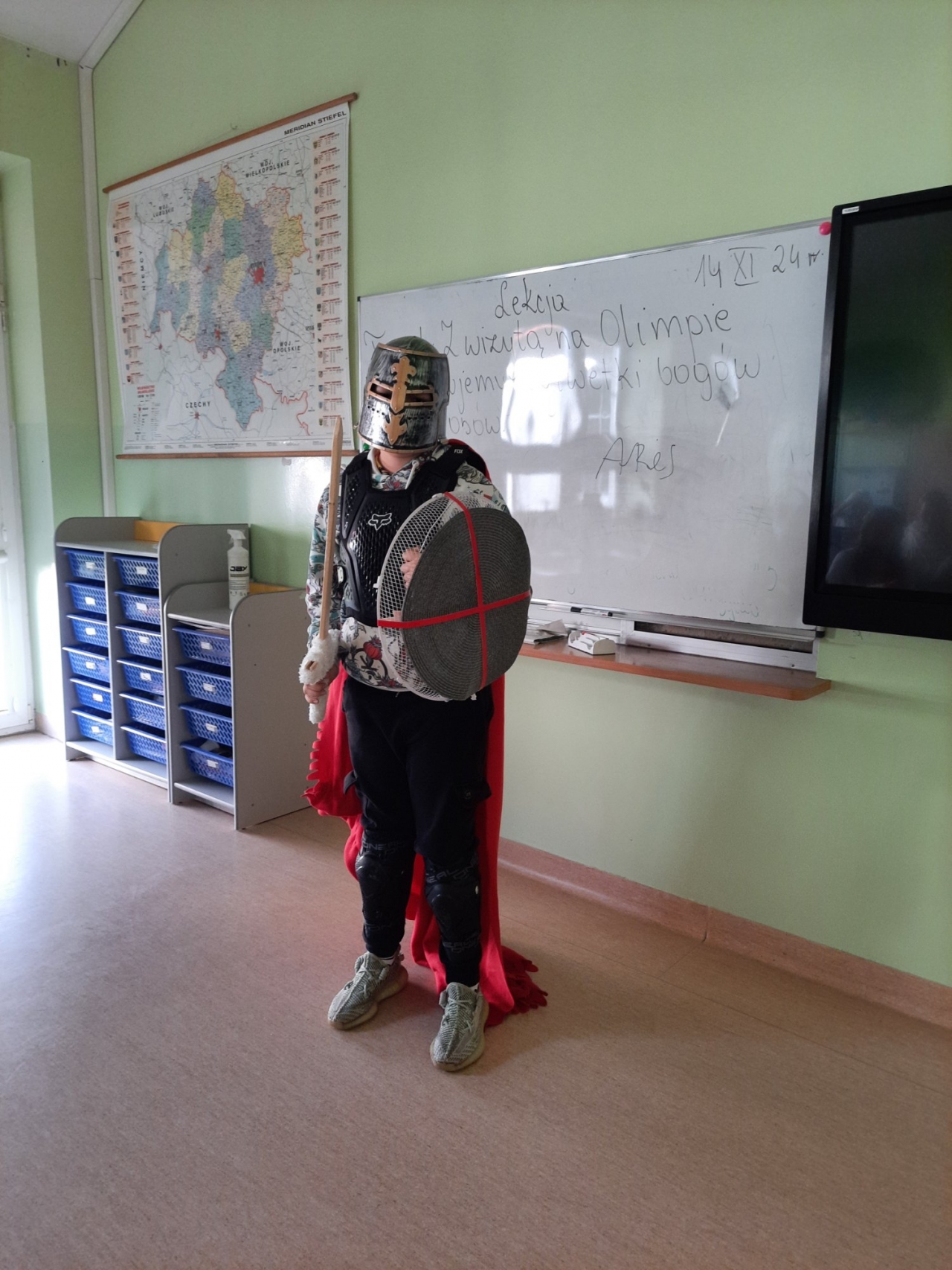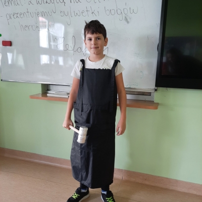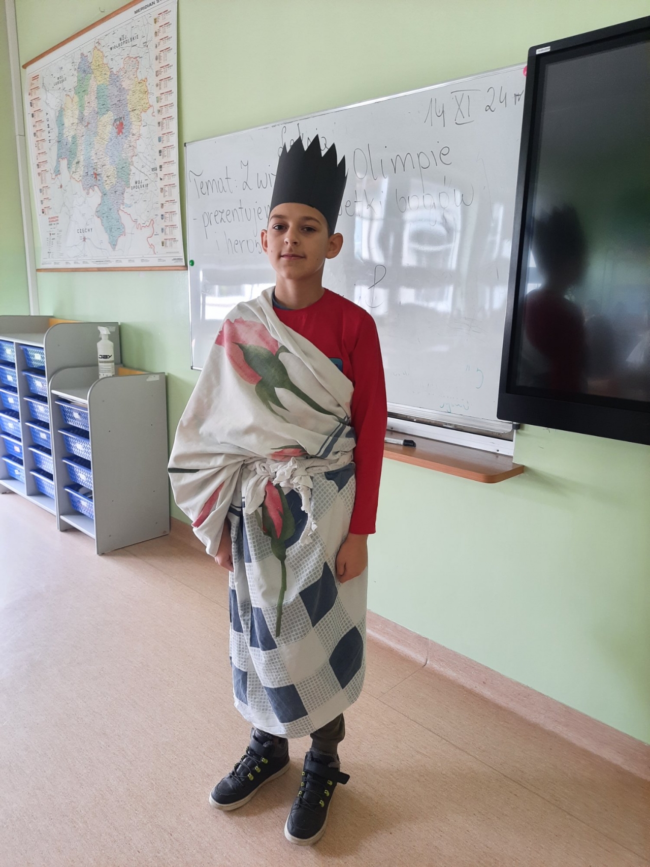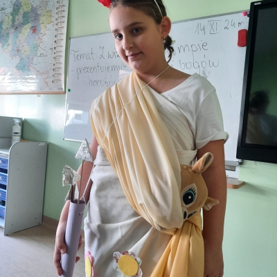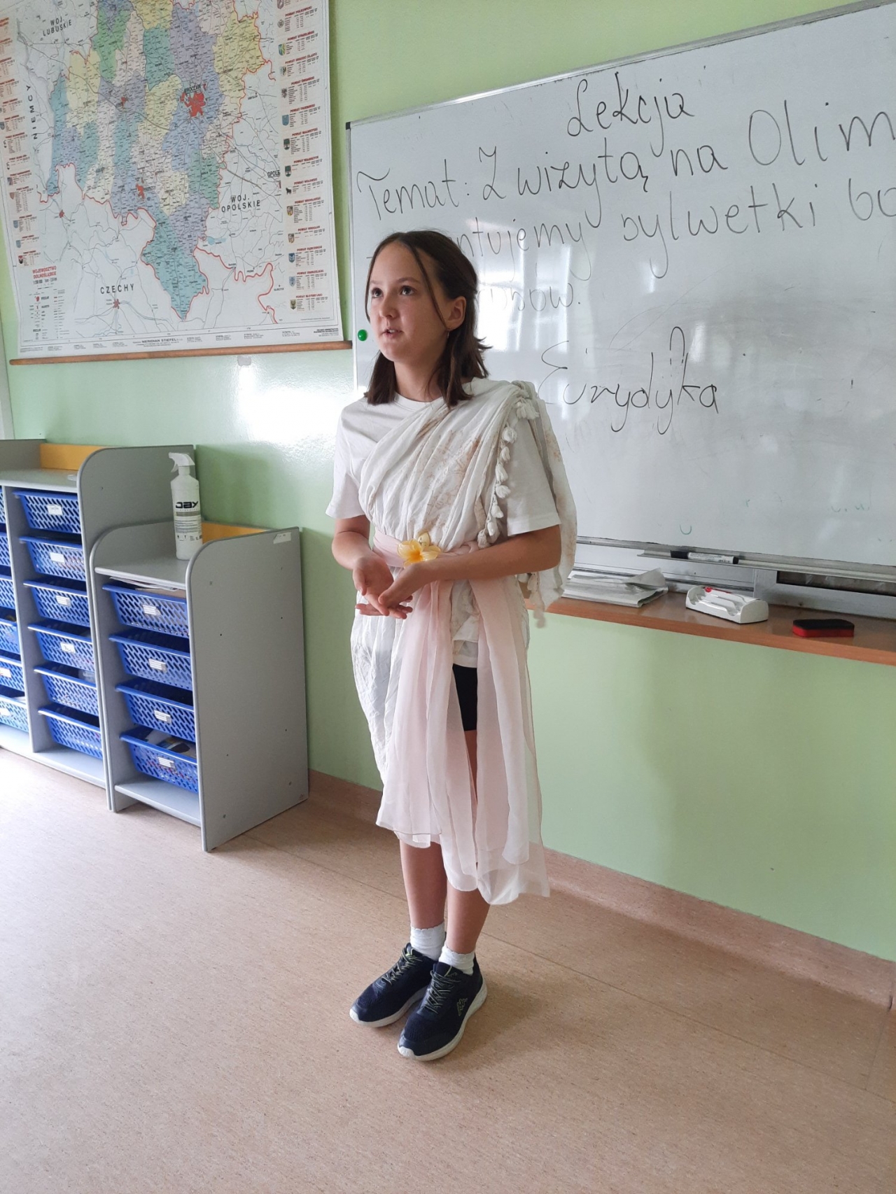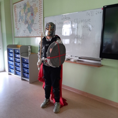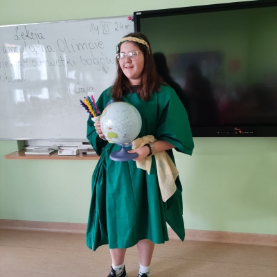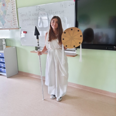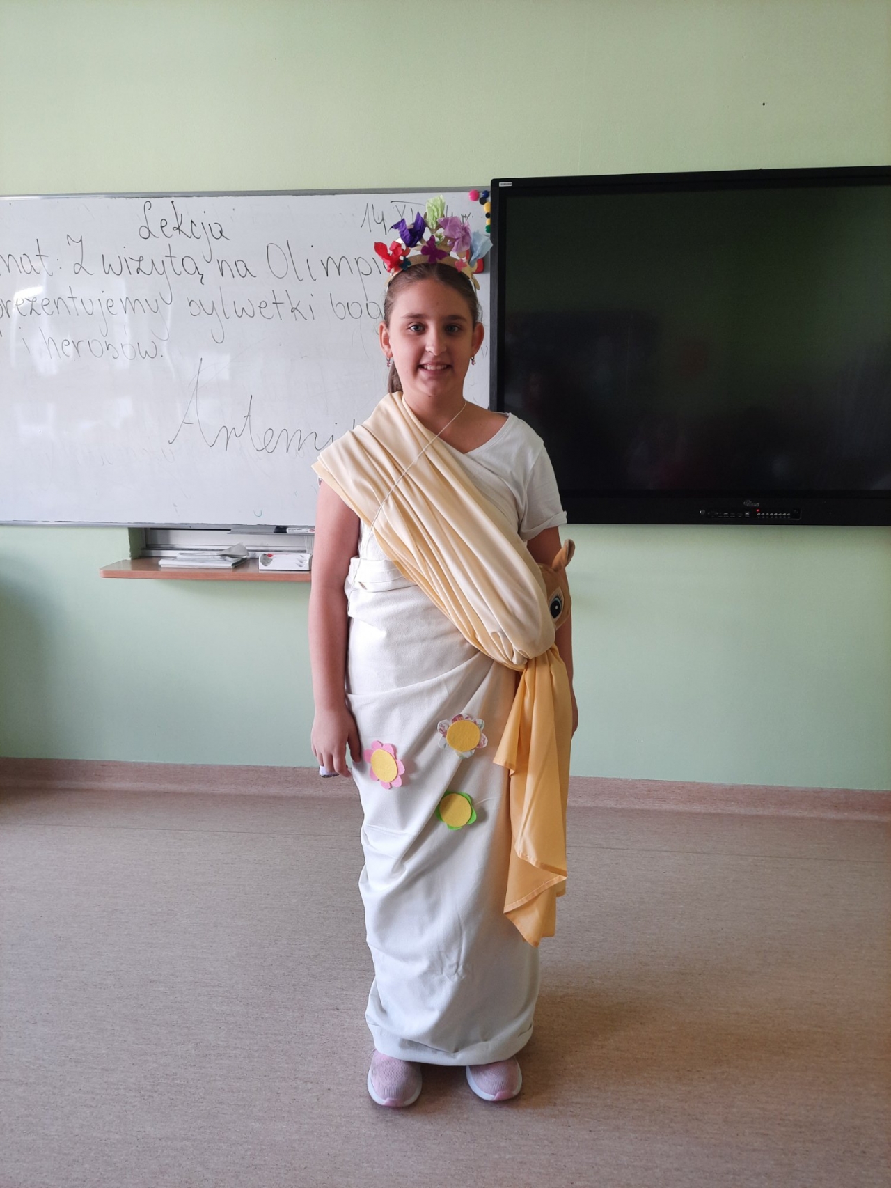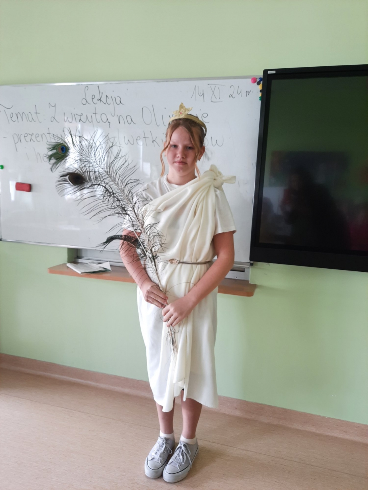 W ubiegły czwartek - podczas lekcji podsumowującej dział: ,,Starożytna Grecja”, piątoklasiści mieli okazję wcielić się w rolę bogów i herosów. Pięknie przebrani w ciekawy sposób opowiadali pochodzeniu i przygodach mitologicznych bohaterów. Wykazali się dużą wiedzą i pomysłowością. Ta lekcja z pewnością na długo pozostanie w ich pamięci.