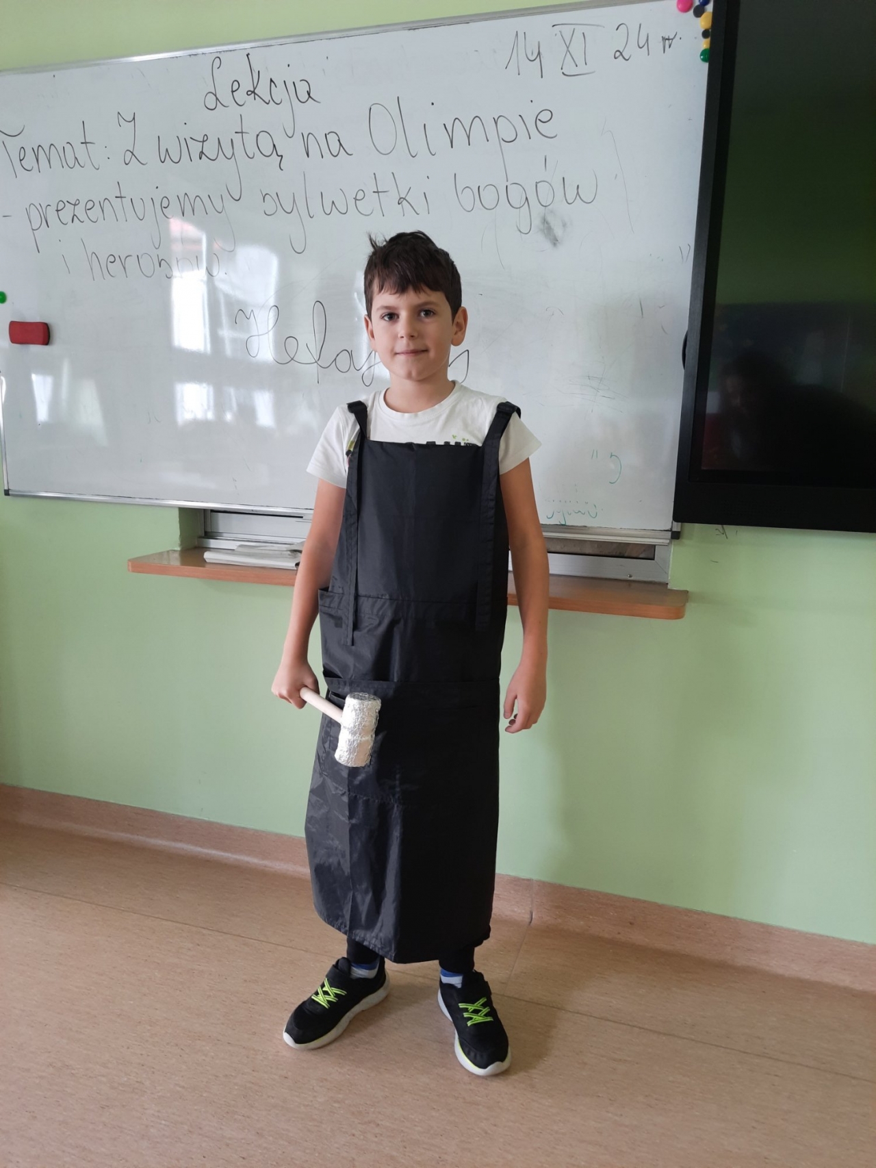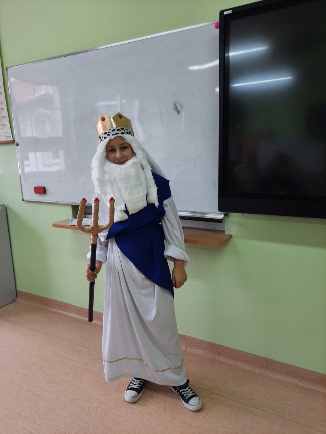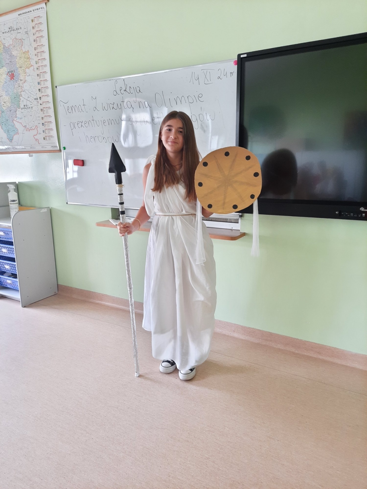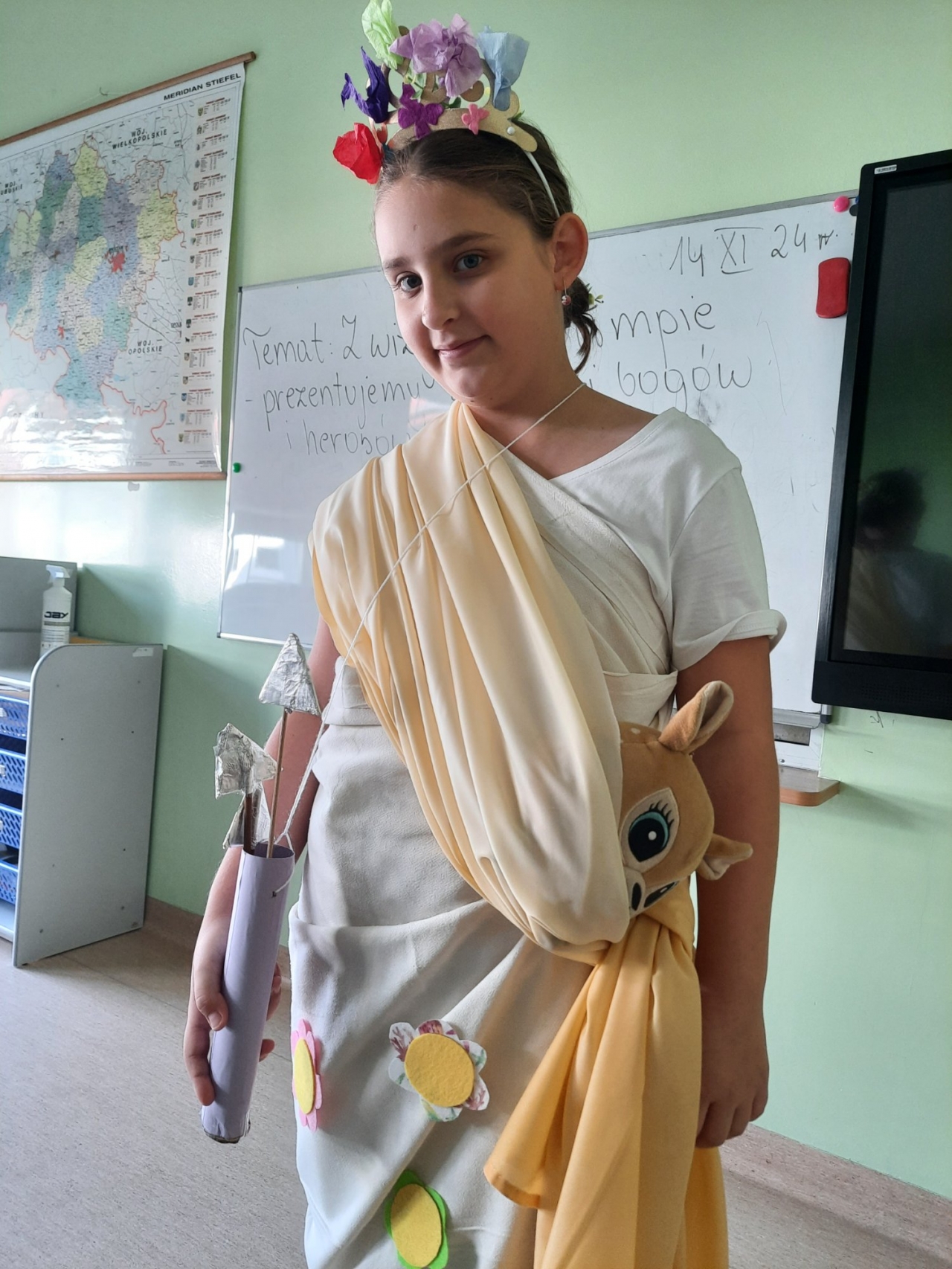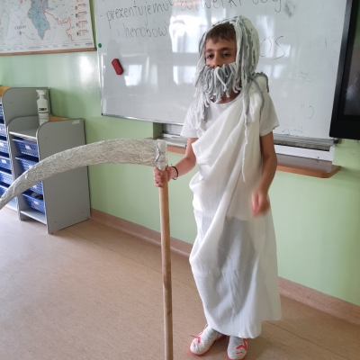W ubiegły czwartek - podczas lekcji podsumowującej dział: ,,Starożytna Grecja”, piątoklasiści mieli okazję wcielić się w rolę bogów i herosów. Pięknie przebrani w ciekawy sposób opowiadali pochodzeniu i przygodach mitologicznych bohaterów. Wykazali się dużą wiedzą i pomysłowością. Ta lekcja z pewnością na długo pozostanie w ich pamięci.