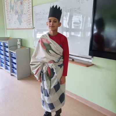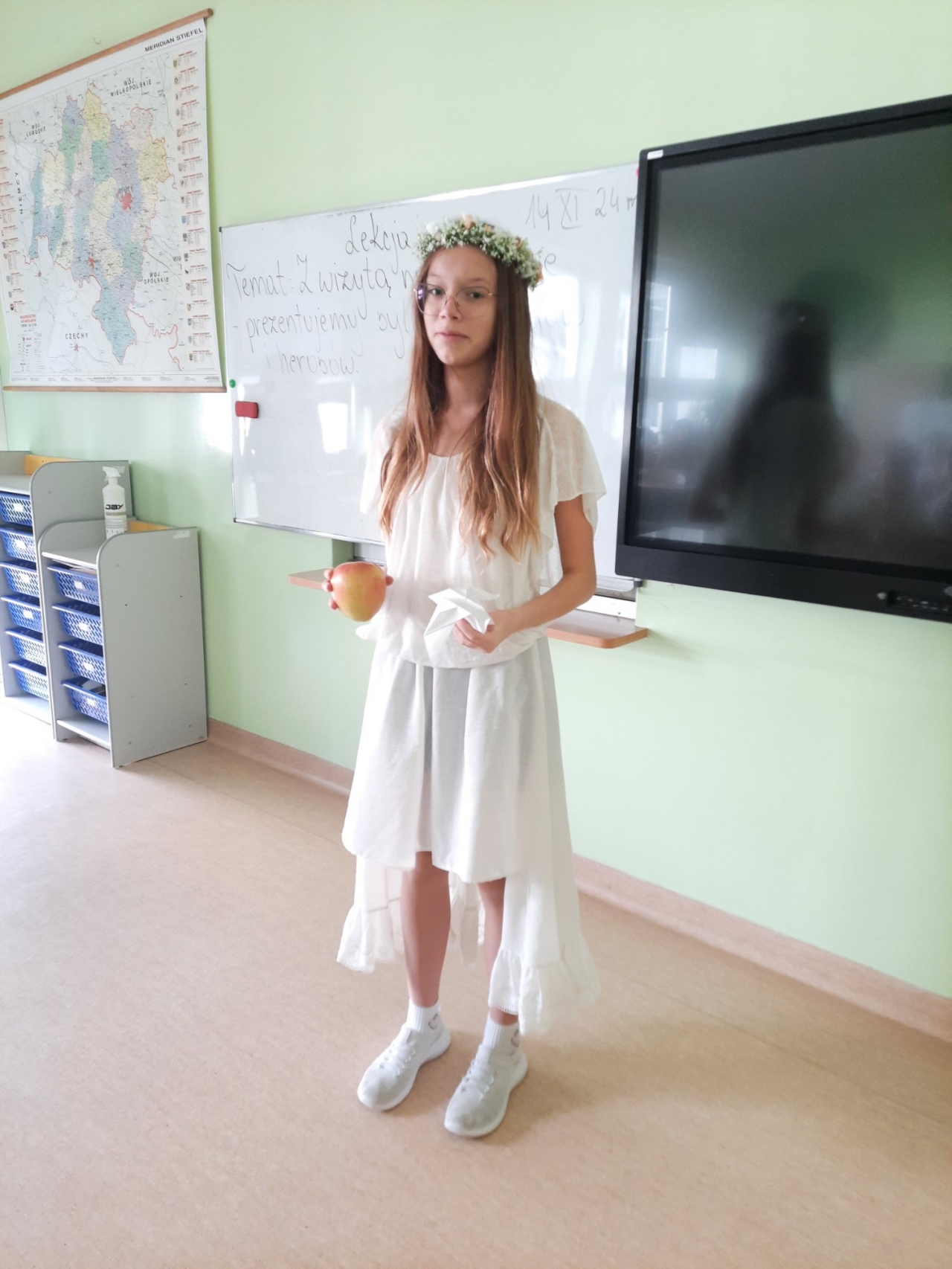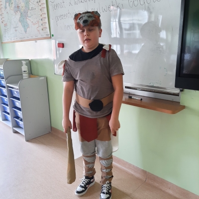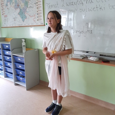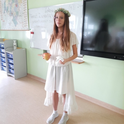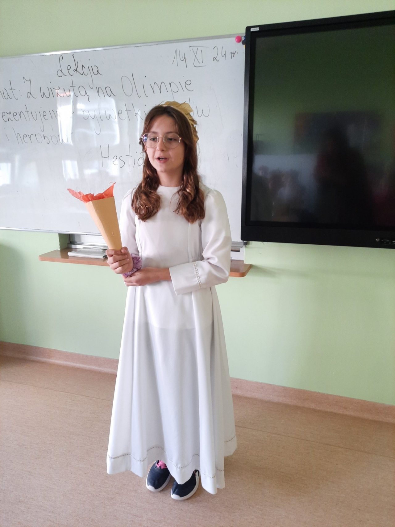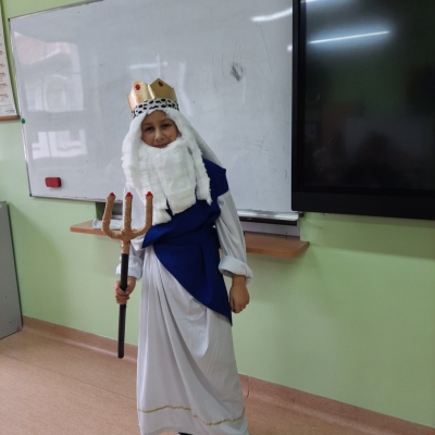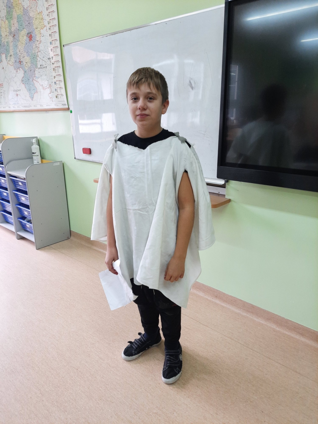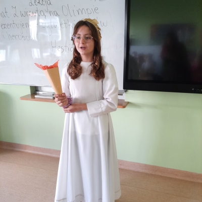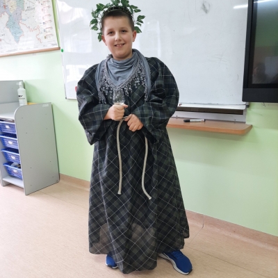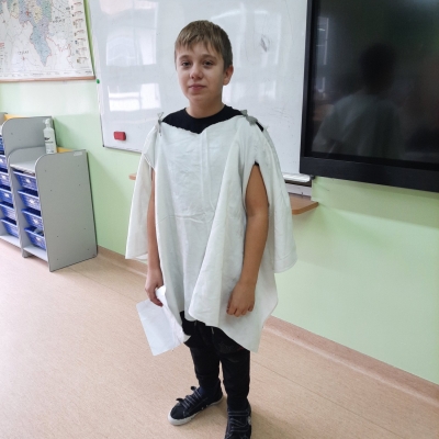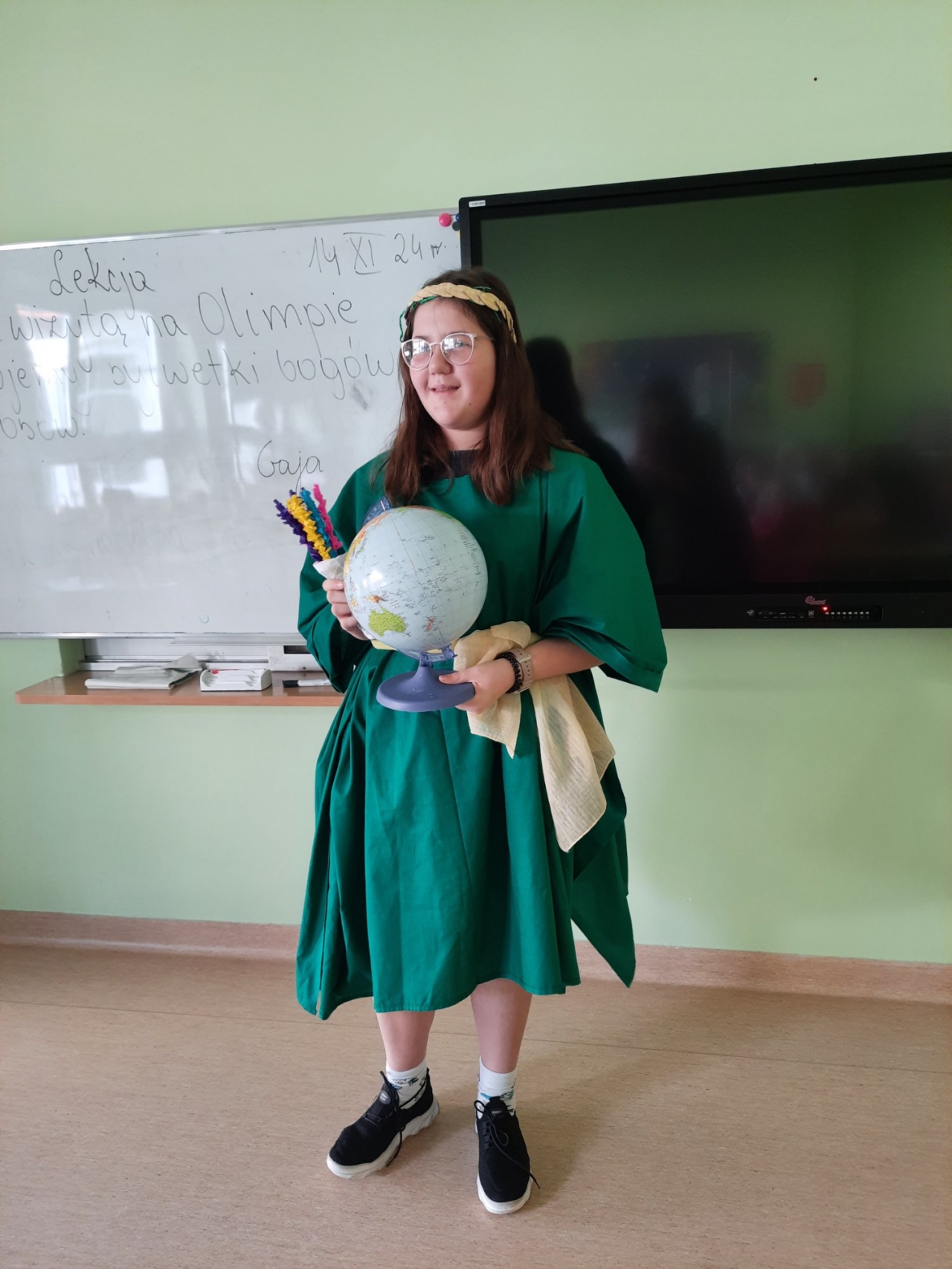 W ubiegły czwartek - podczas lekcji podsumowującej dział: ,,Starożytna Grecja”, piątoklasiści mieli okazję wcielić się w rolę bogów i herosów. Pięknie przebrani w ciekawy sposób opowiadali pochodzeniu i przygodach mitologicznych bohaterów. Wykazali się dużą wiedzą i pomysłowością. Ta lekcja z pewnością na długo pozostanie w ich pamięci.