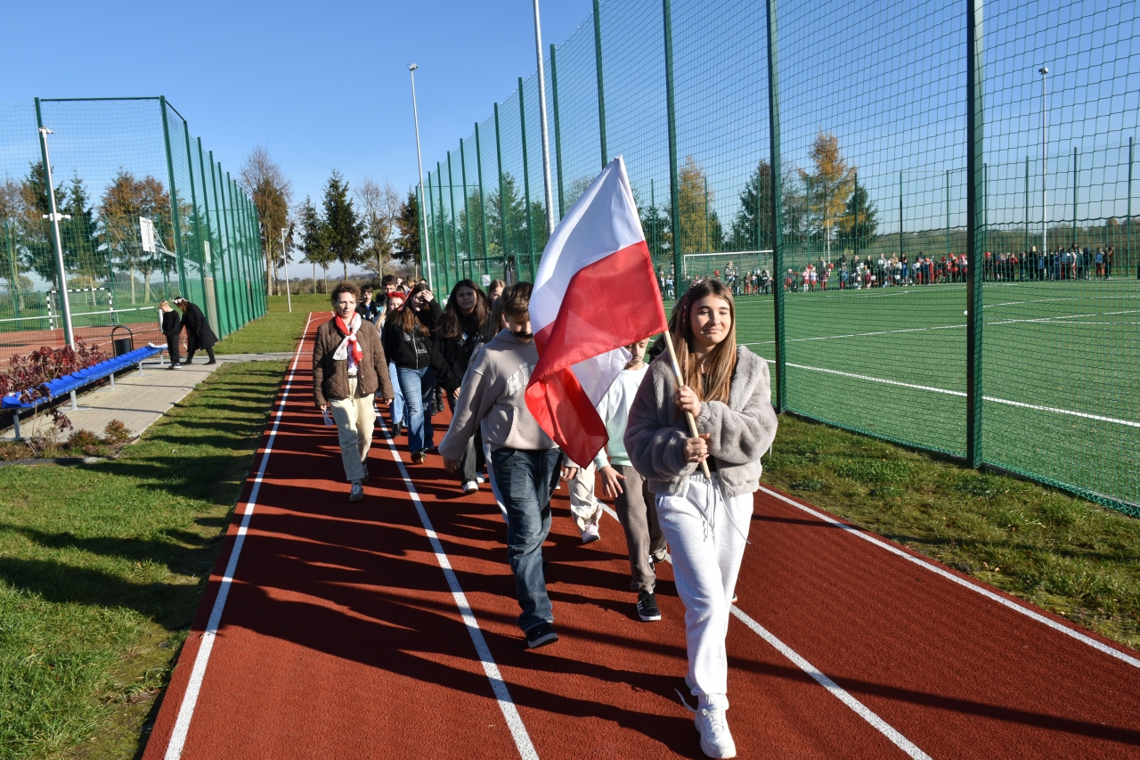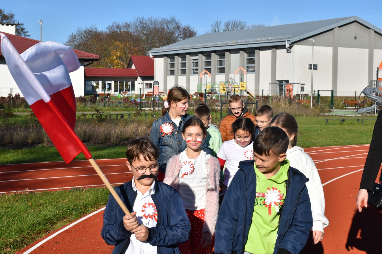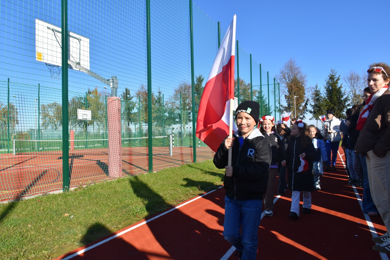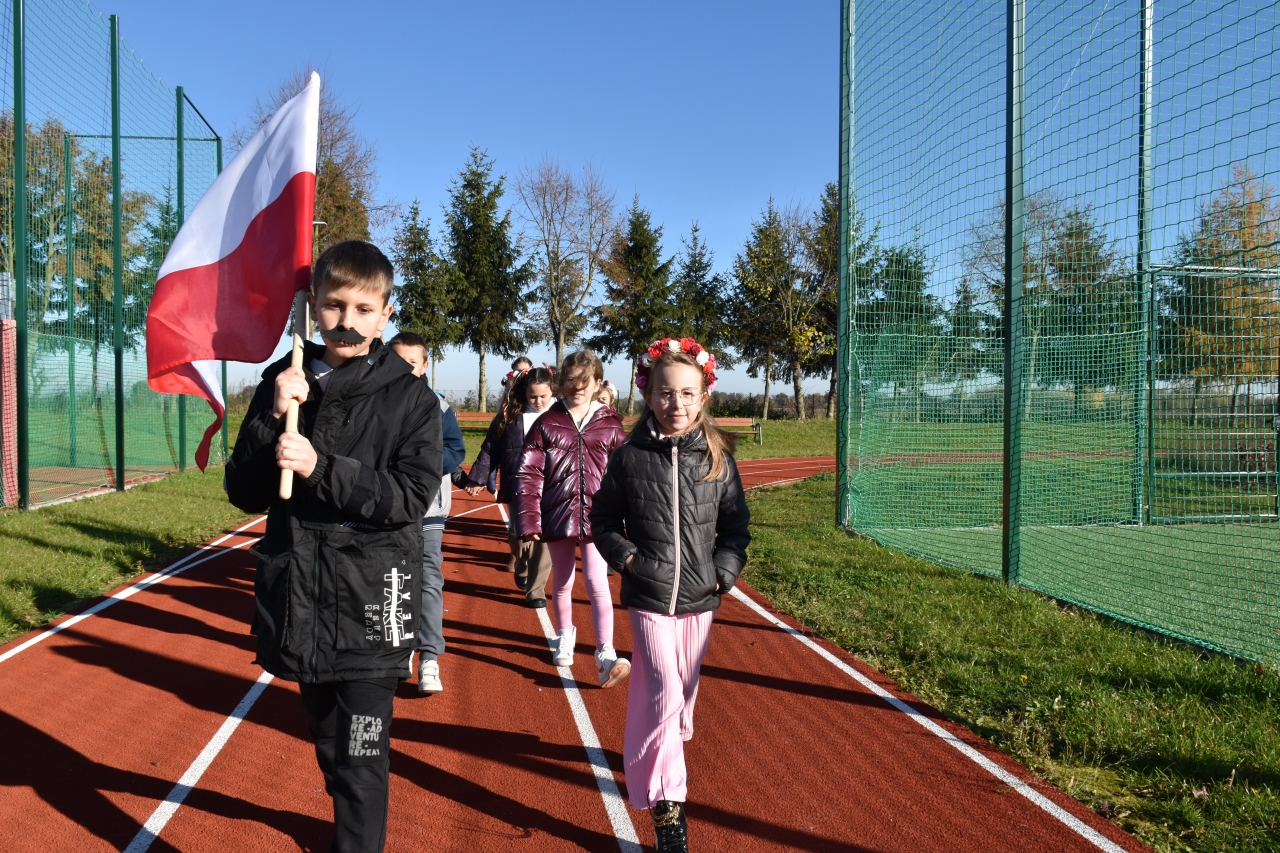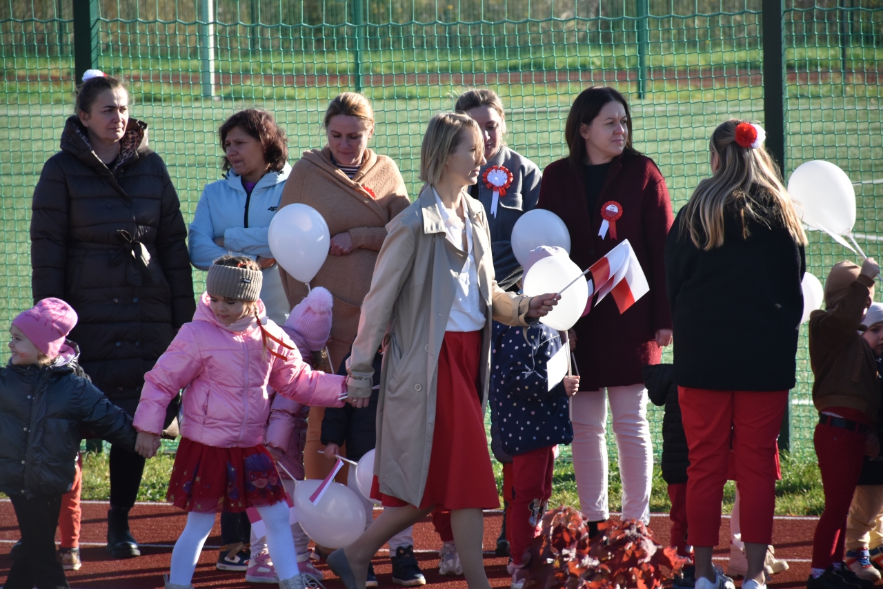 Symbolicznym rozpoczęciem obchodów była Sztafeta Niepodległości – uroczysty marsz z flagą narodową, prowadzony przez chorążego Krzysztofa Sachanka. Flaga wędrowała z rąk do rąk, począwszy od najmłodszej grupy przedszkolnej, aż po uczniów klasy ósmej.