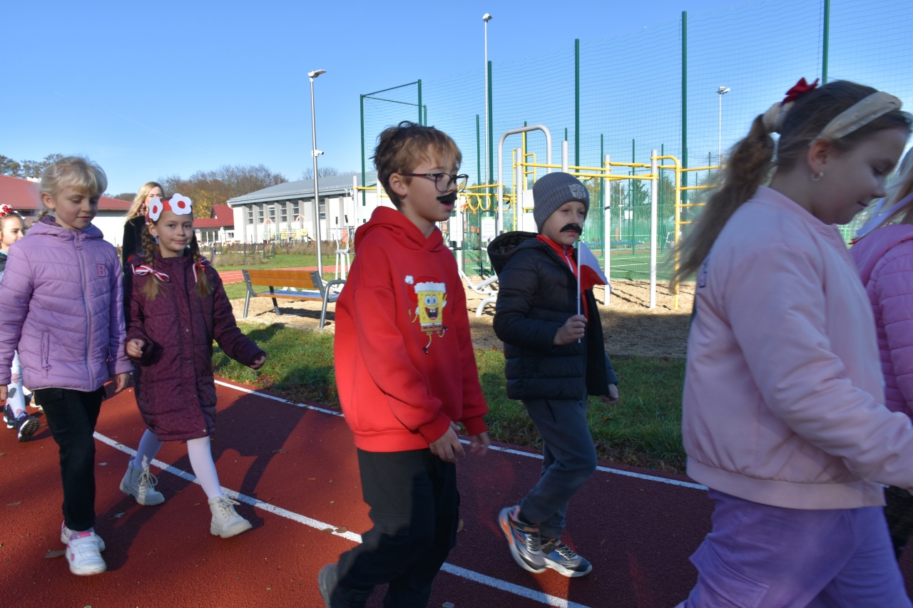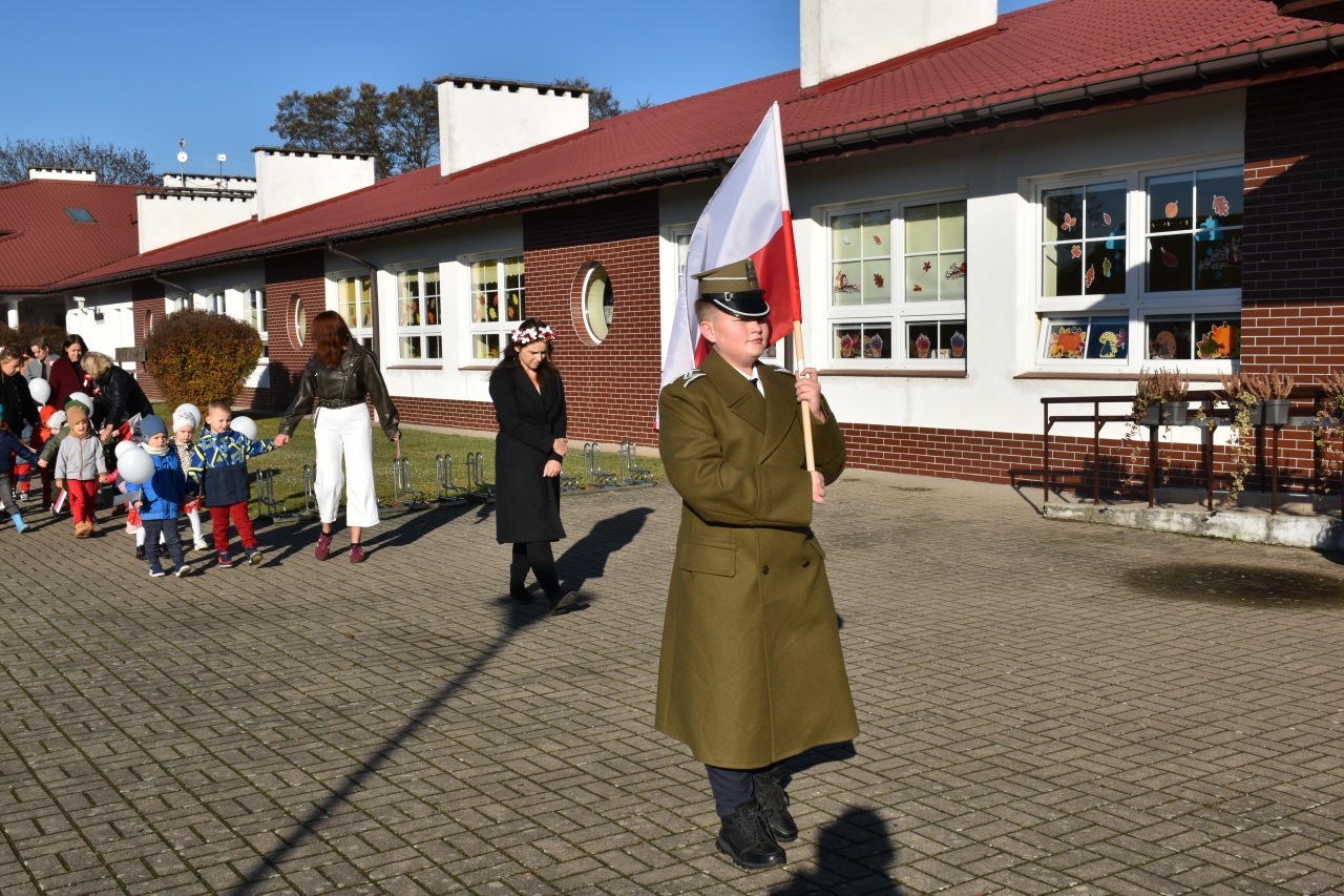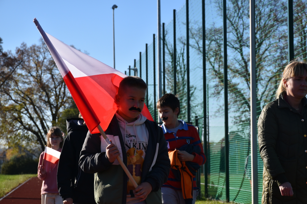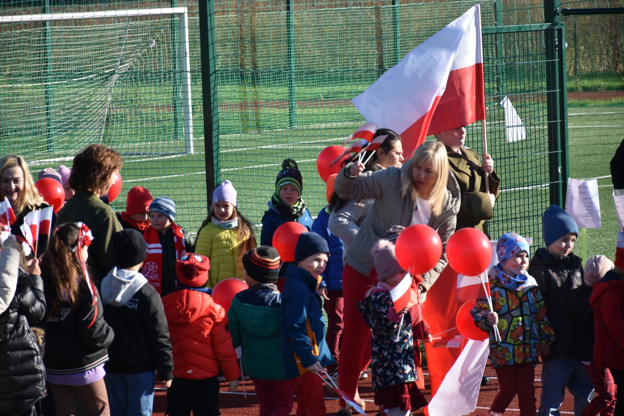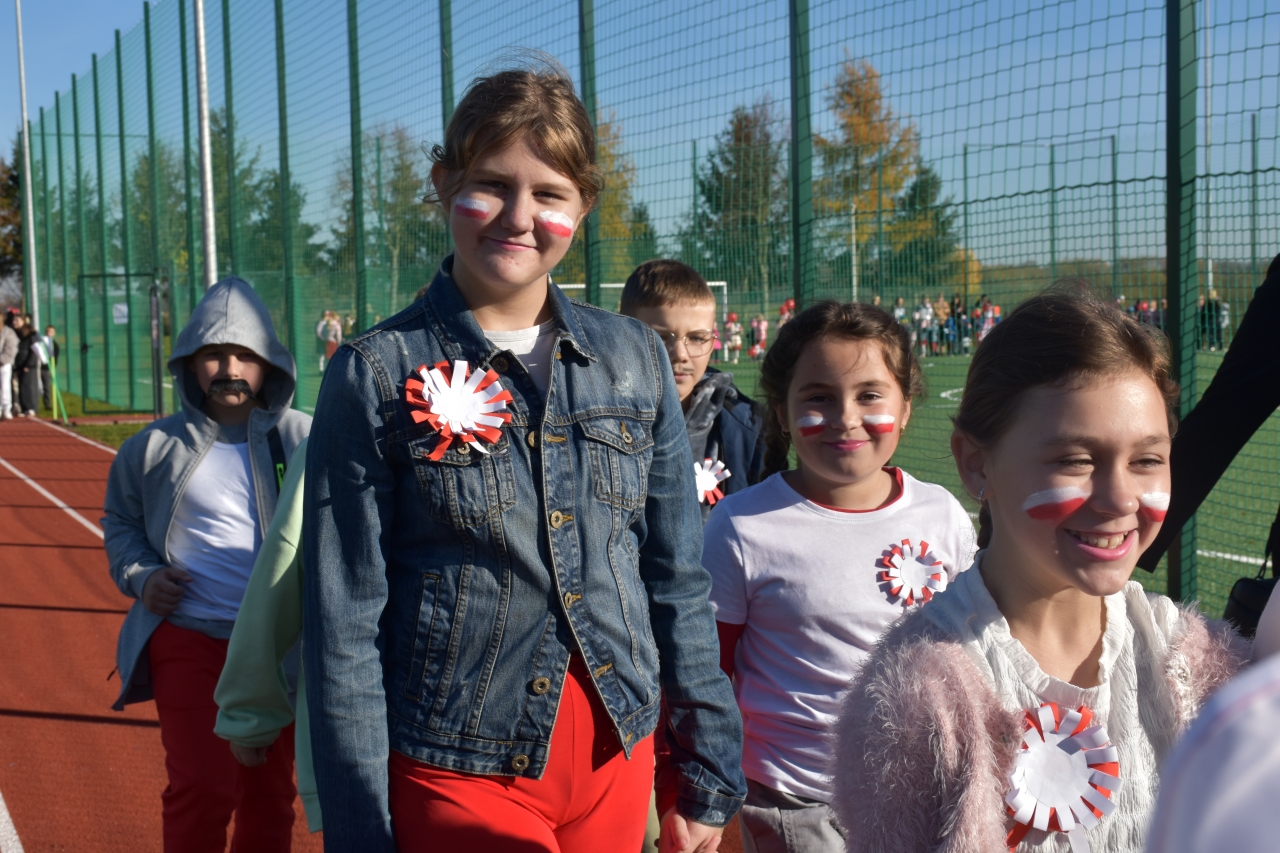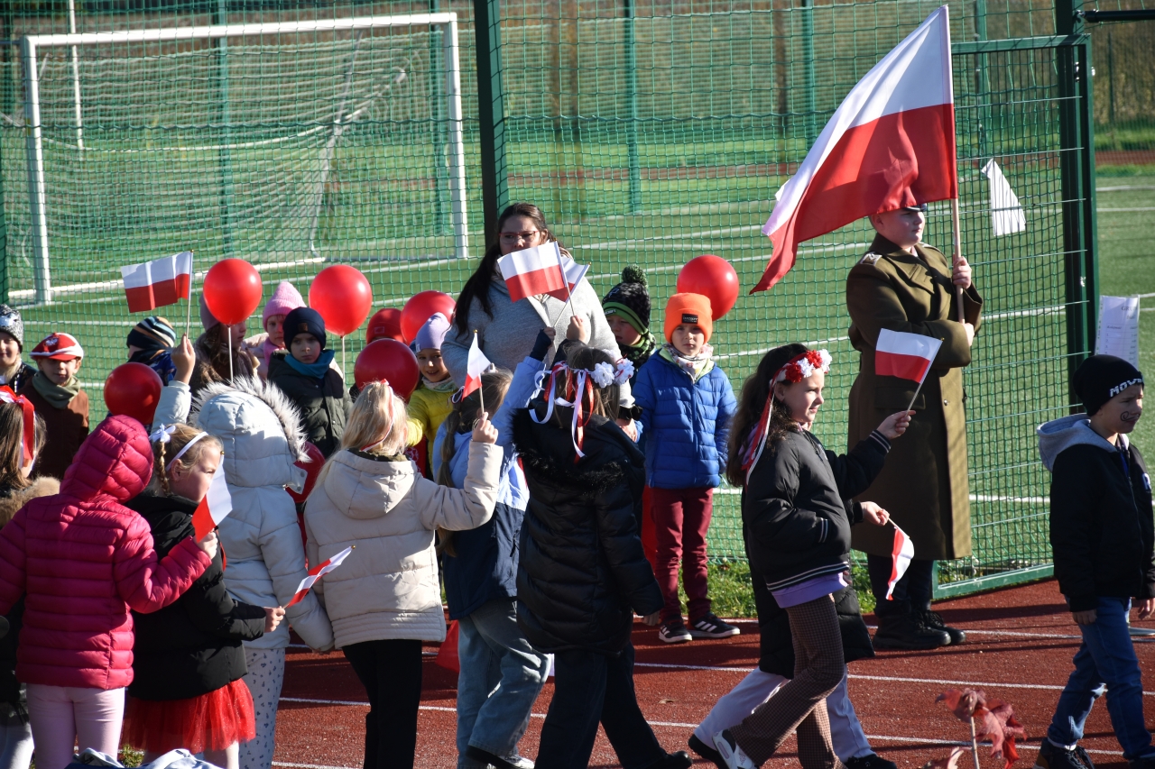 Symbolicznym rozpoczęciem obchodów była Sztafeta Niepodległości – uroczysty marsz z flagą narodową, prowadzony przez chorążego Krzysztofa Sachanka. Flaga wędrowała z rąk do rąk, począwszy od najmłodszej grupy przedszkolnej, aż po uczniów klasy ósmej.