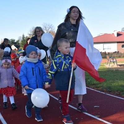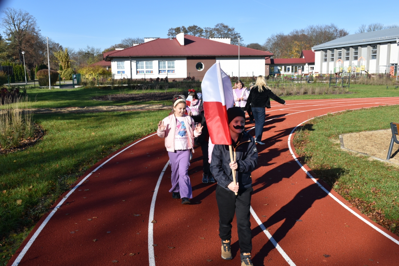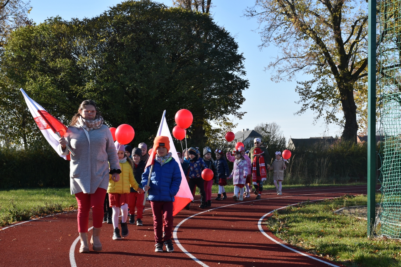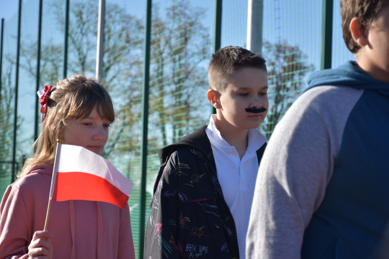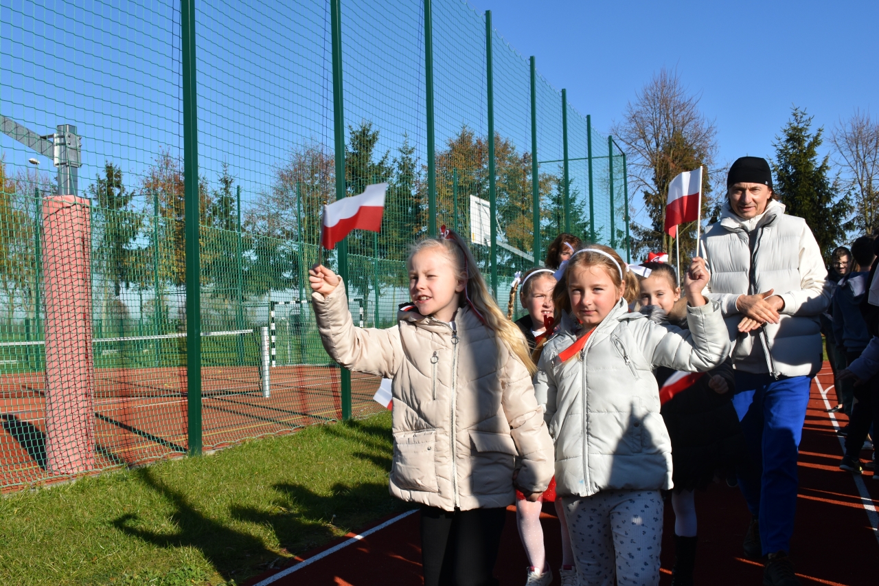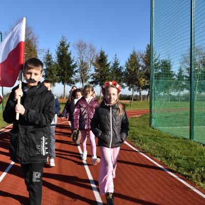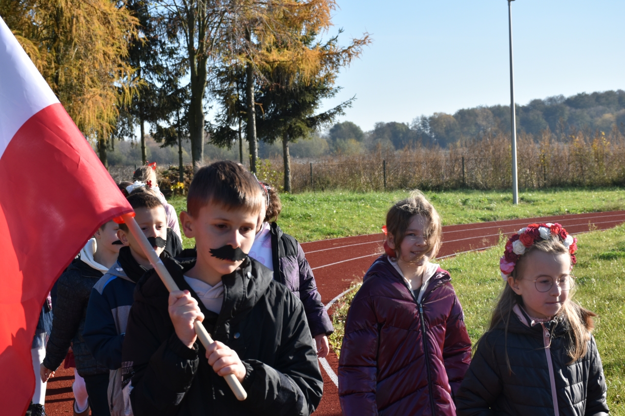 Symbolicznym rozpoczęciem obchodów była Sztafeta Niepodległości – uroczysty marsz z flagą narodową, prowadzony przez chorążego Krzysztofa Sachanka. Flaga wędrowała z rąk do rąk, począwszy od najmłodszej grupy przedszkolnej, aż po uczniów klasy ósmej.