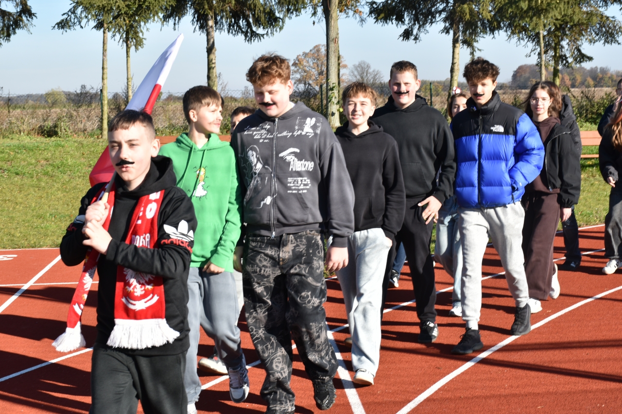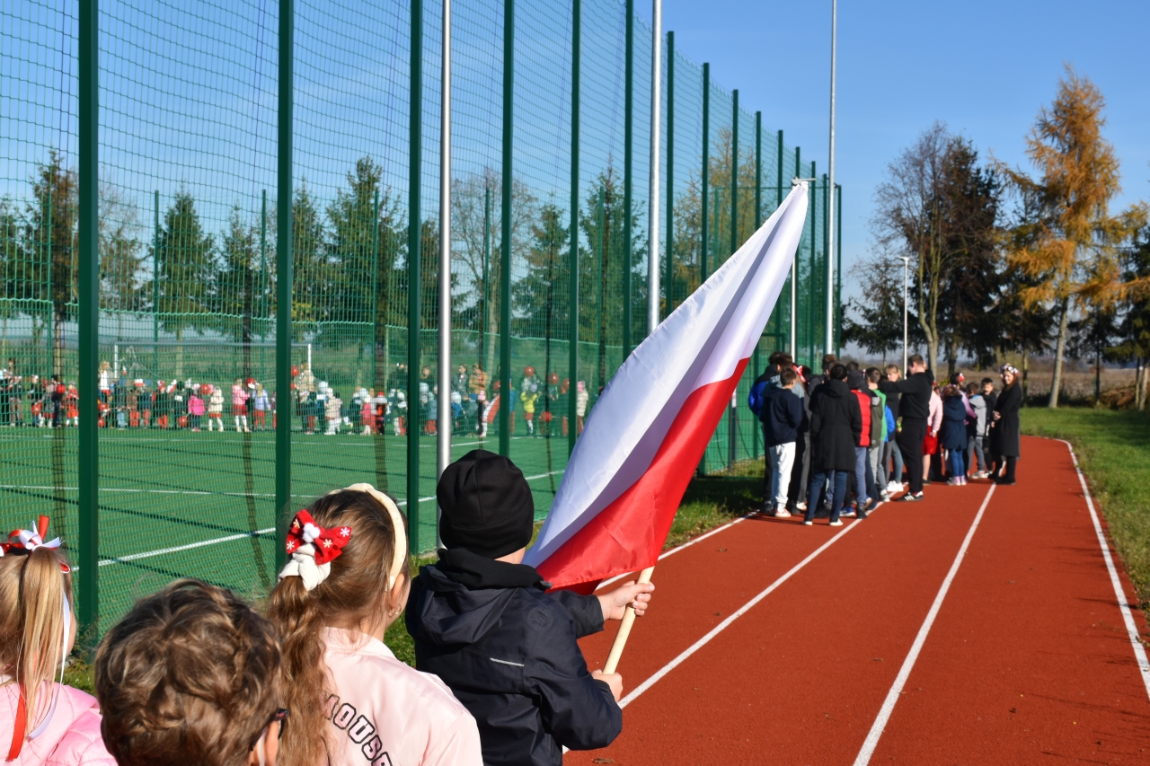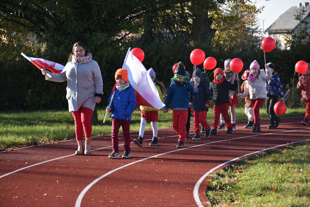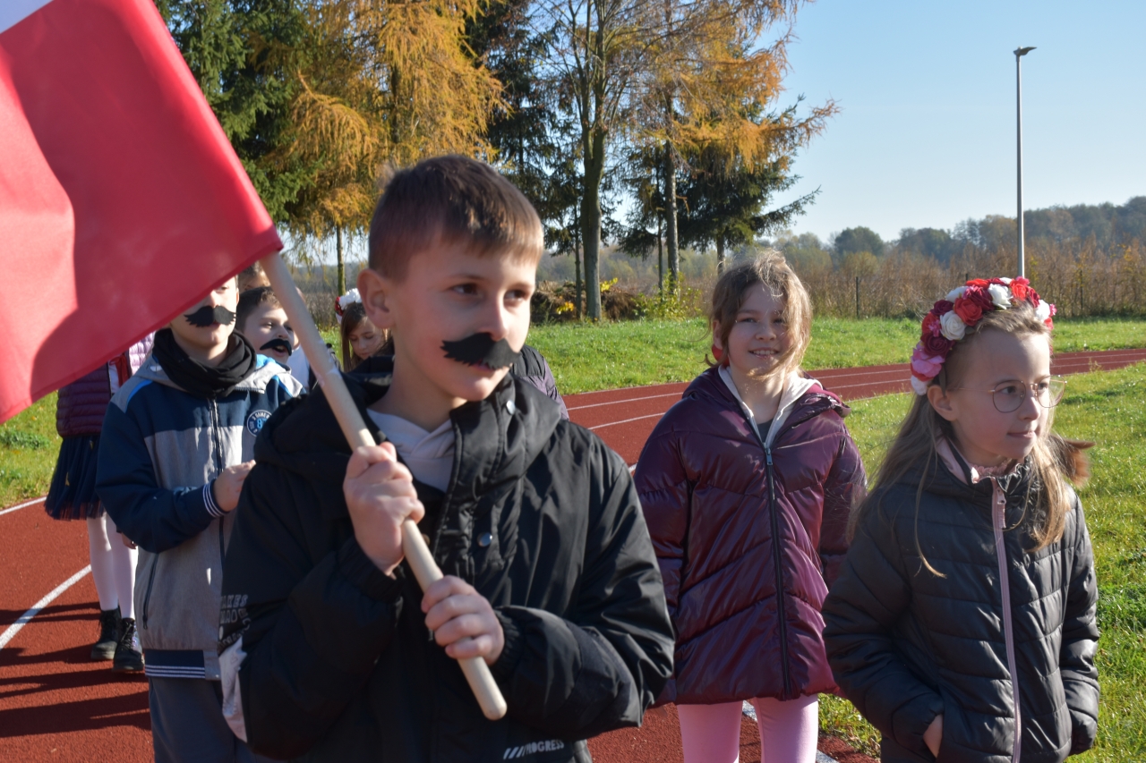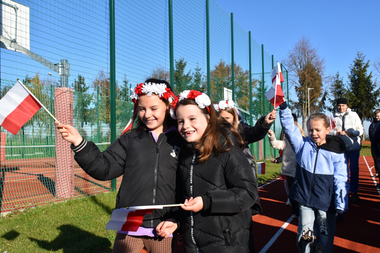 Symbolicznym rozpoczęciem obchodów była Sztafeta Niepodległości – uroczysty marsz z flagą narodową, prowadzony przez chorążego Krzysztofa Sachanka. Flaga wędrowała z rąk do rąk, począwszy od najmłodszej grupy przedszkolnej, aż po uczniów klasy ósmej.