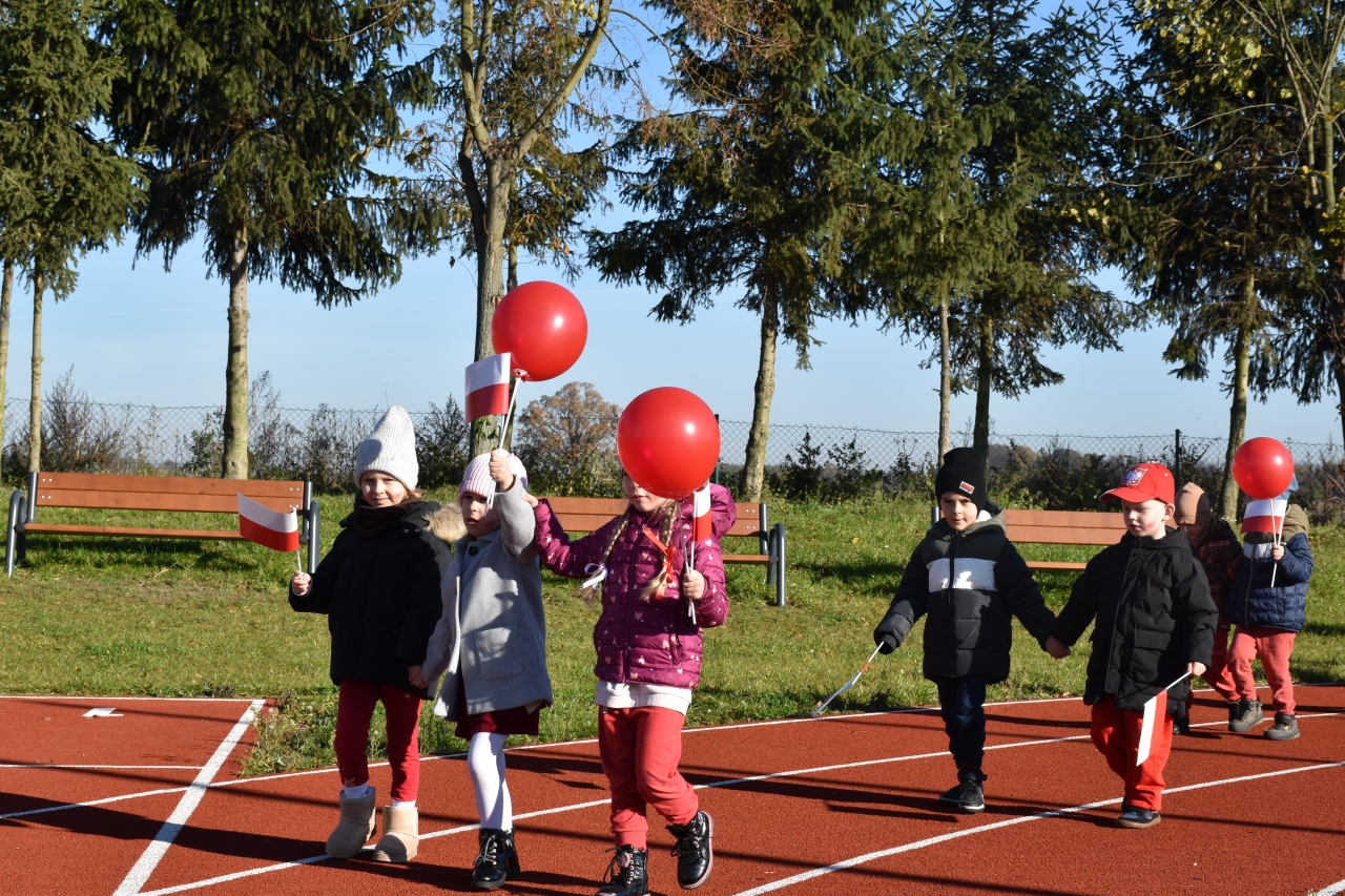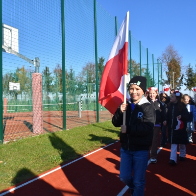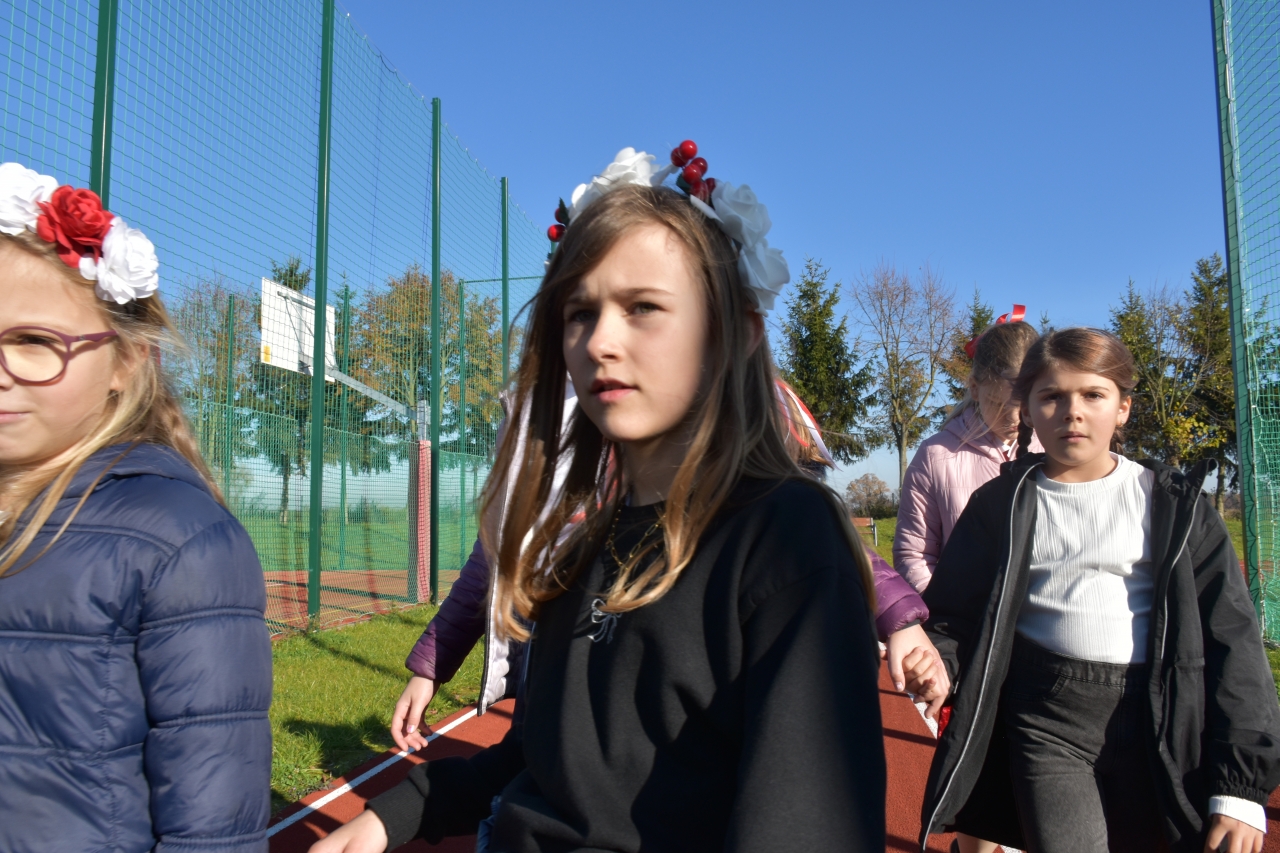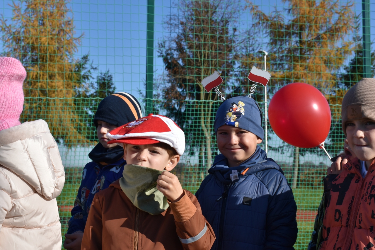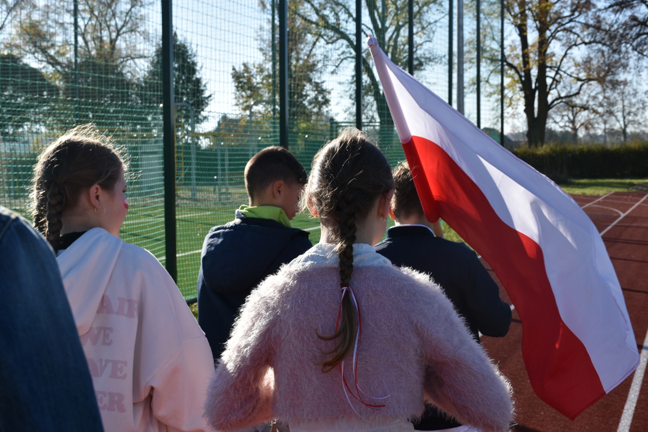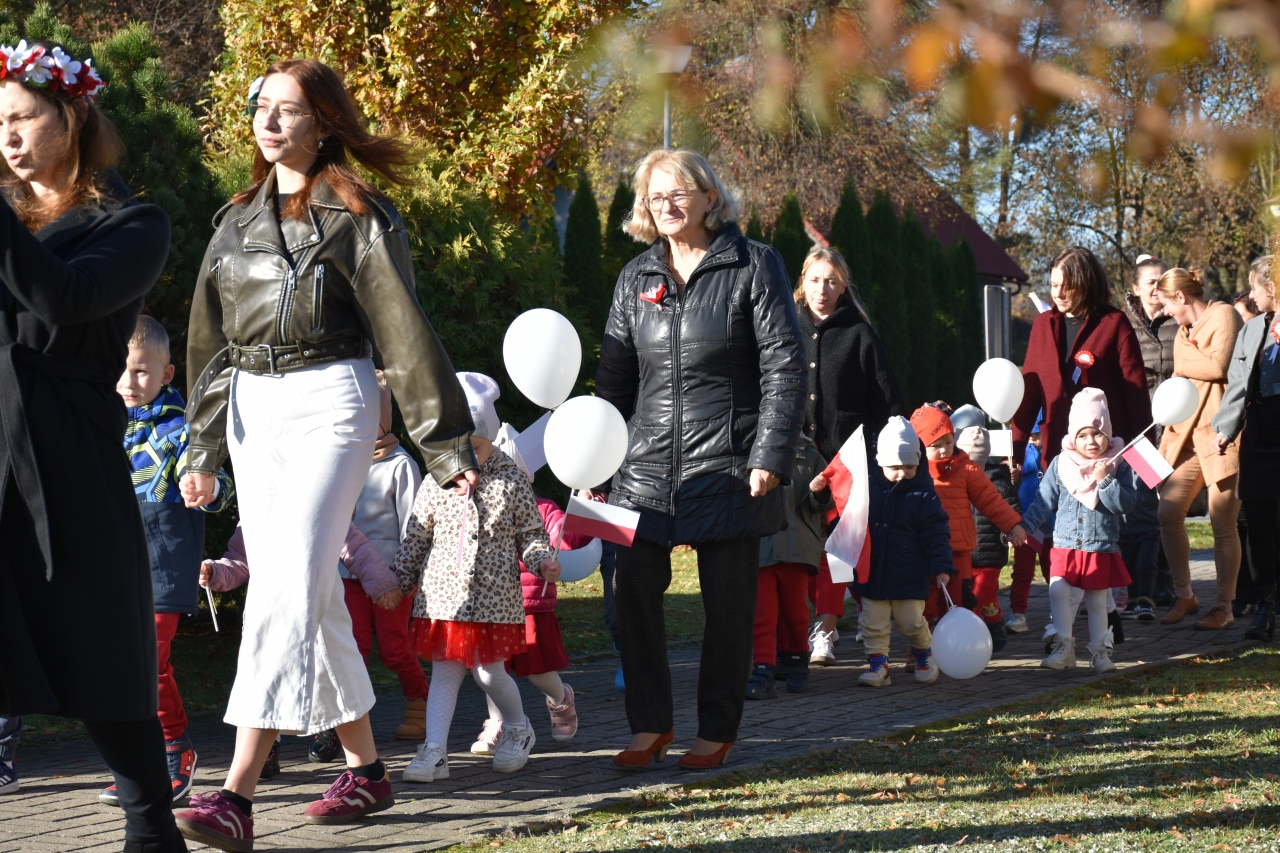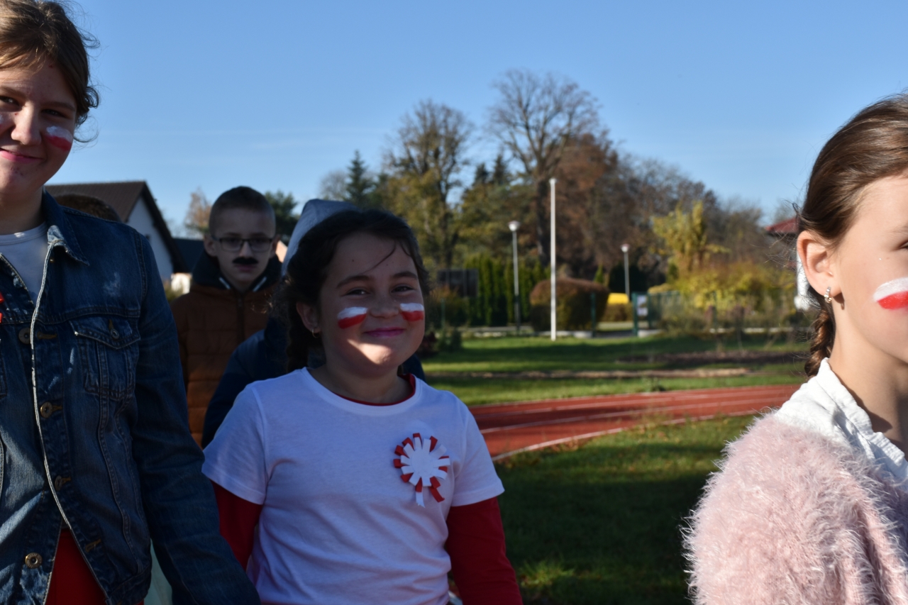 Symbolicznym rozpoczęciem obchodów była Sztafeta Niepodległości – uroczysty marsz z flagą narodową, prowadzony przez chorążego Krzysztofa Sachanka. Flaga wędrowała z rąk do rąk, począwszy od najmłodszej grupy przedszkolnej, aż po uczniów klasy ósmej.