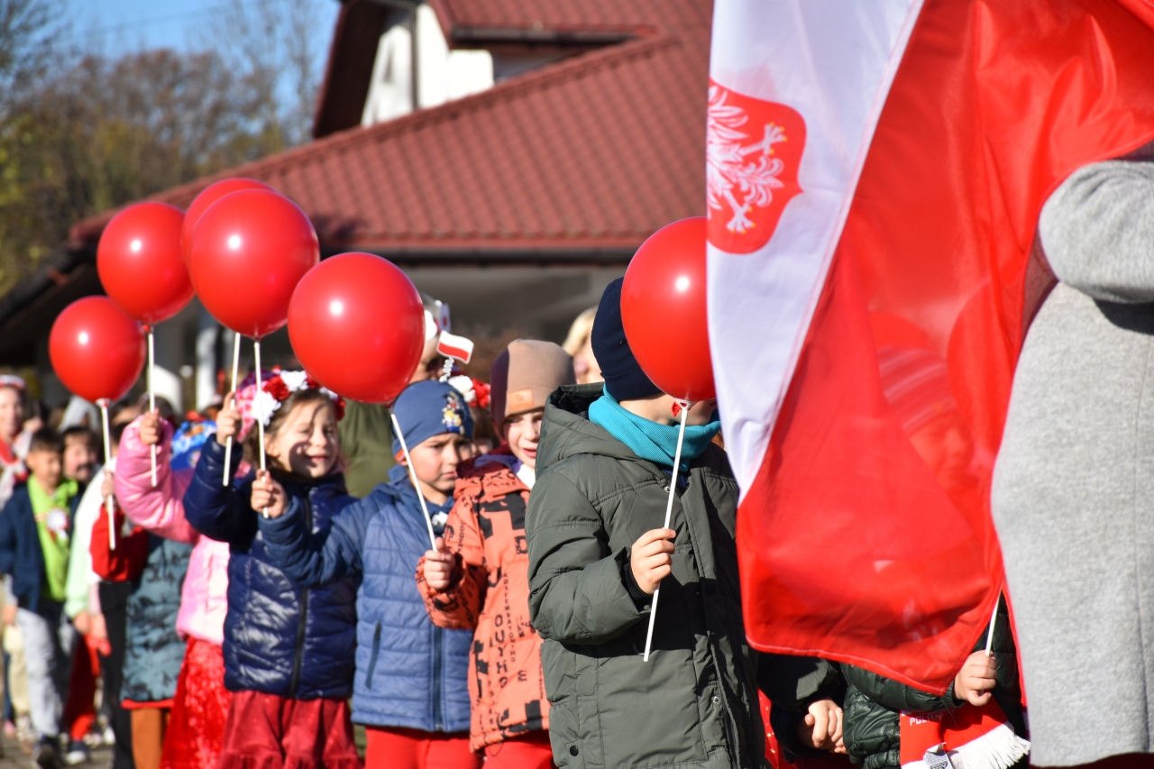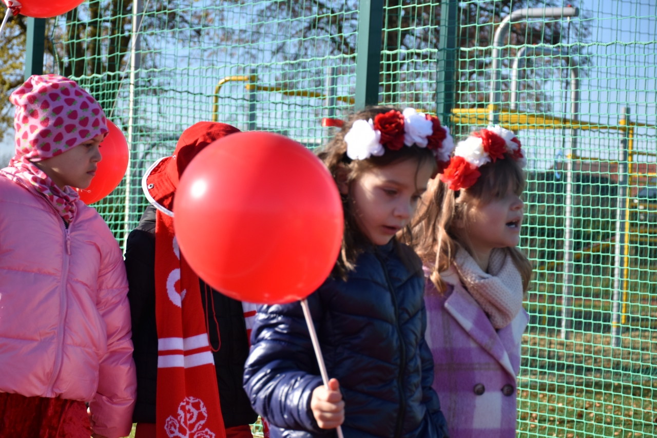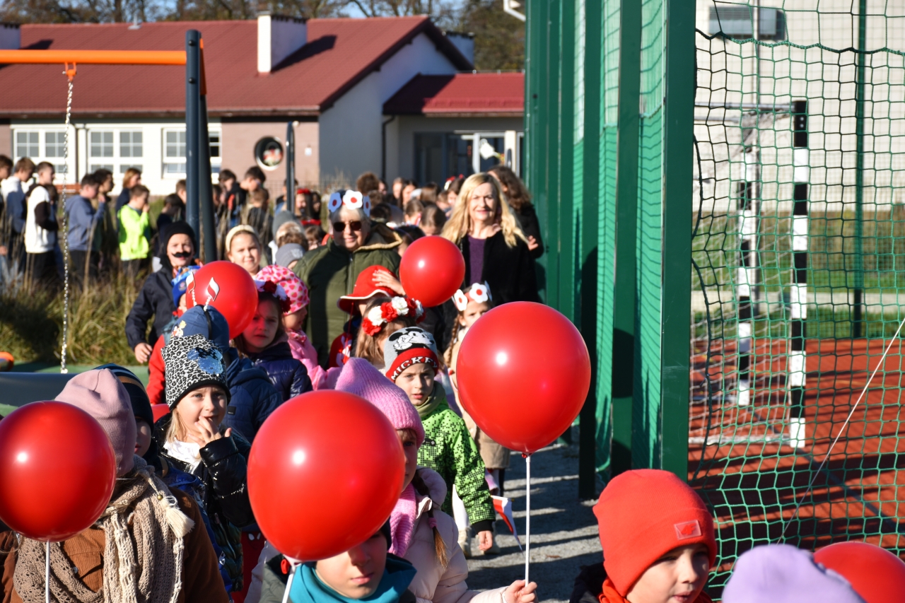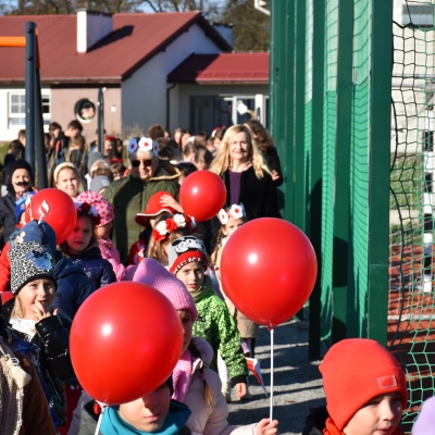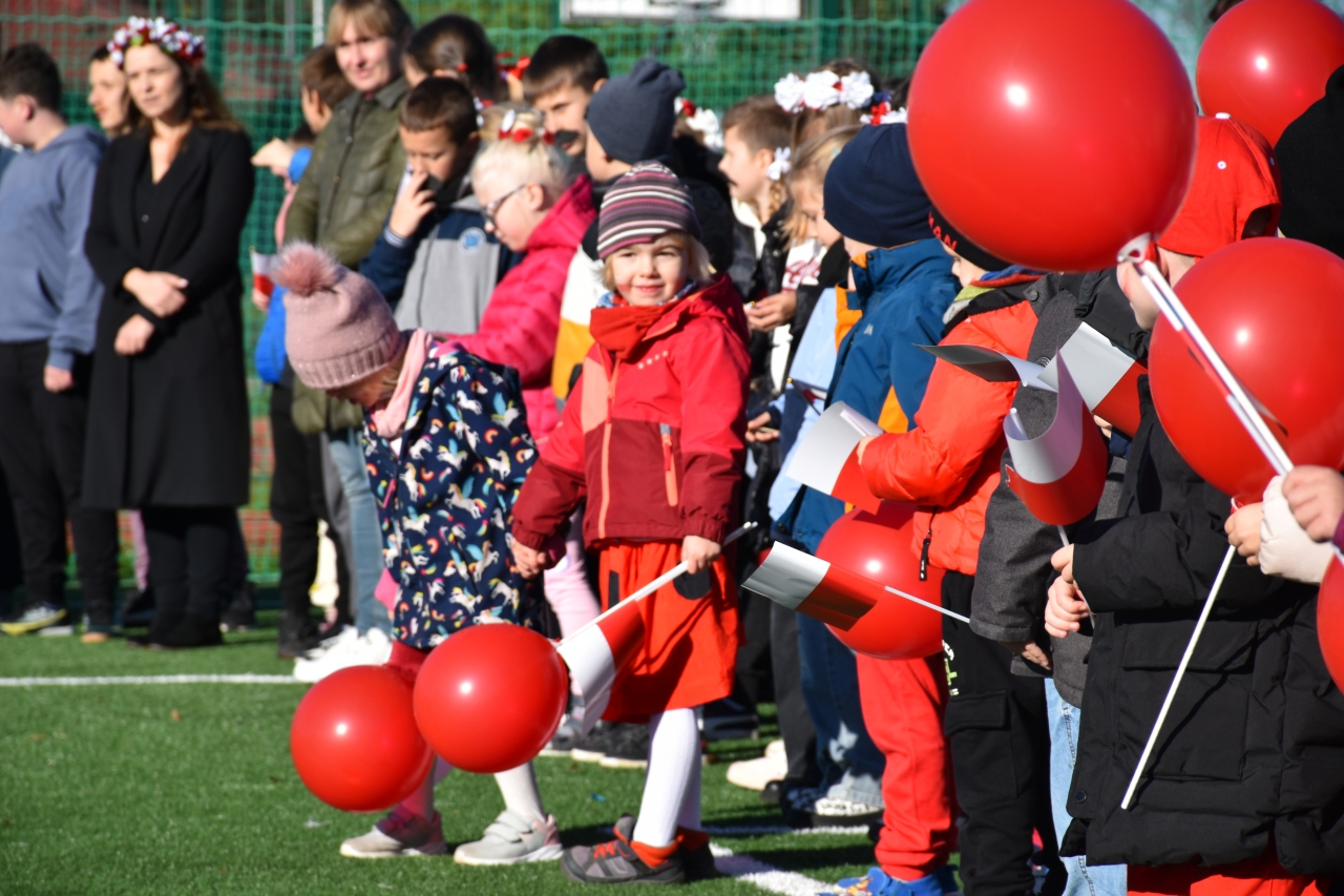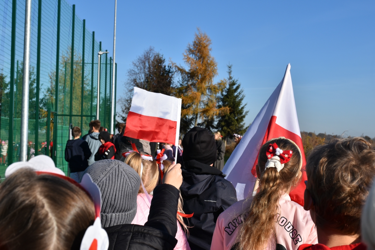 W dłoniach wielu uczniów powiewały biało-czerwone flagi, a balony w barwach narodowych dodawały wydarzeniu radosnego charakteru.