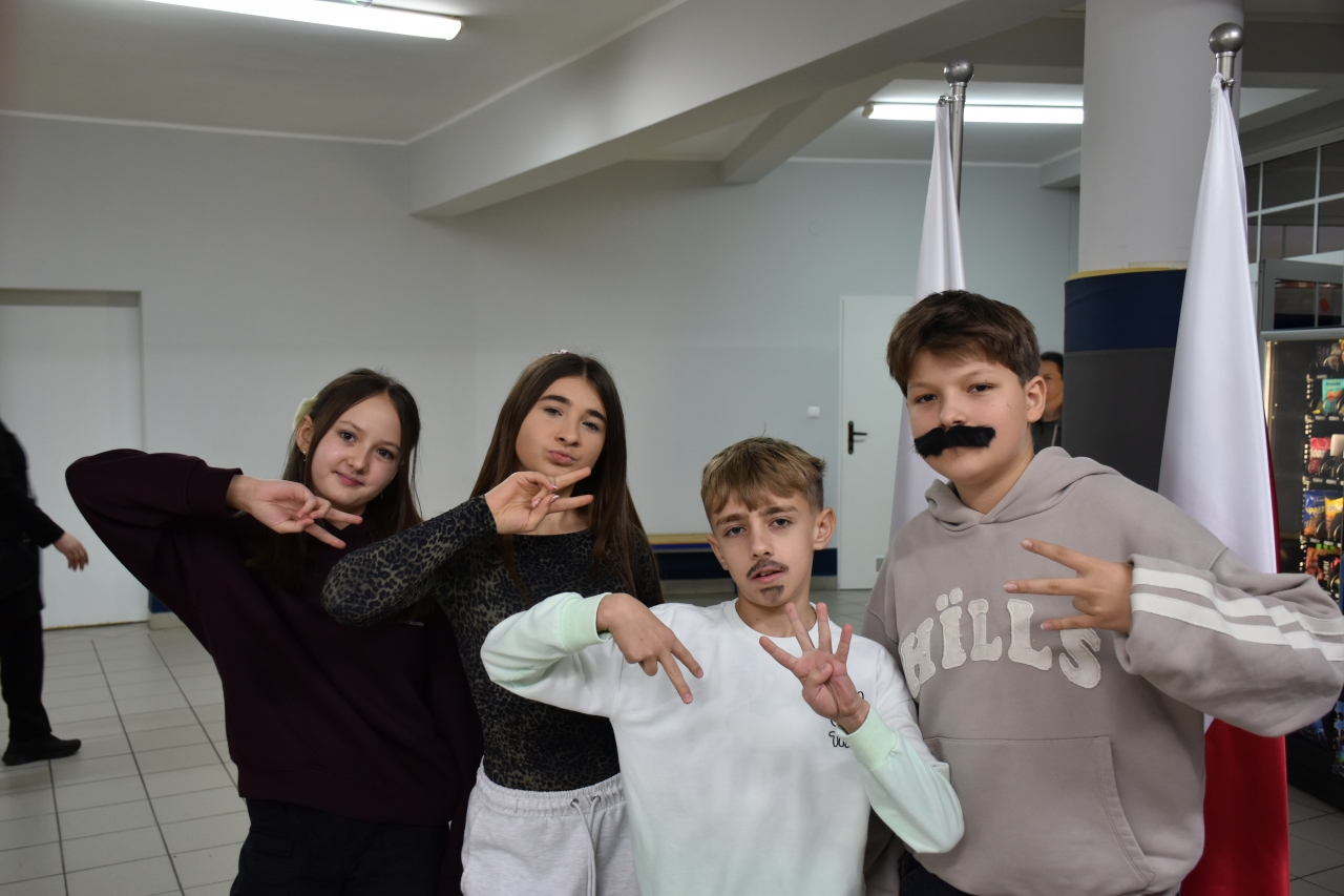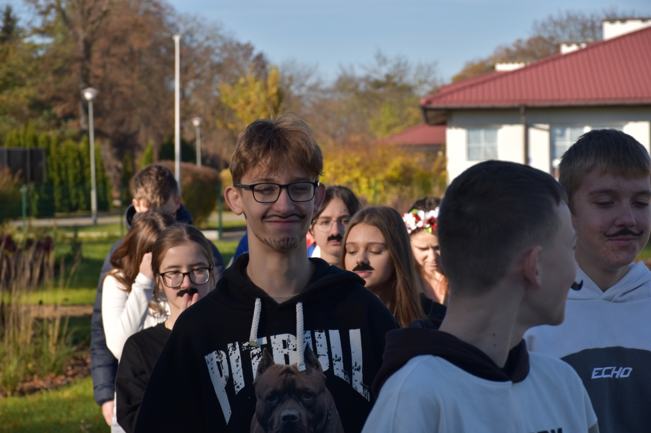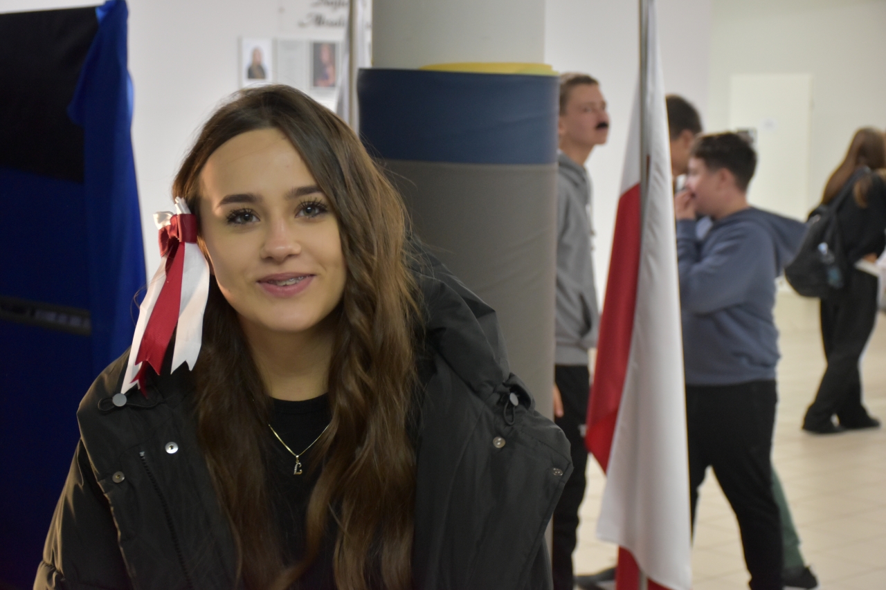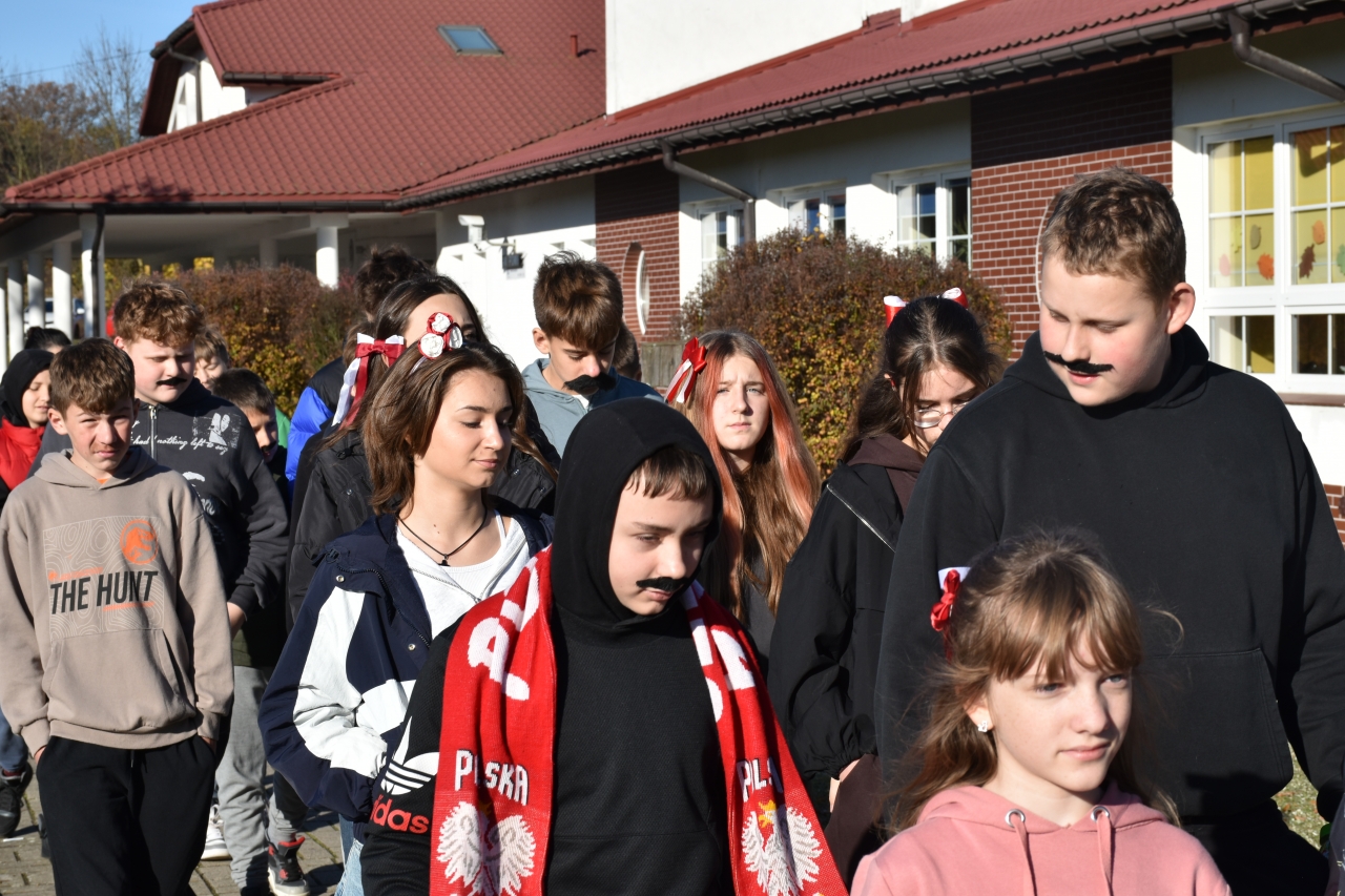 Obchody Narodowego Święta Niepodległości w naszej szkole rozpoczęliśmy już w czwartek. Od wczesnych godzin porannych w korytarzach panowała podniosła, patriotyczna atmosfera. Uczennice ubrane w biało-czerwone ozdoby – opaski i kokardy – oraz uczniowie z wąsami wprowadzili wszystkich w nastrój narodowego świętowania.
