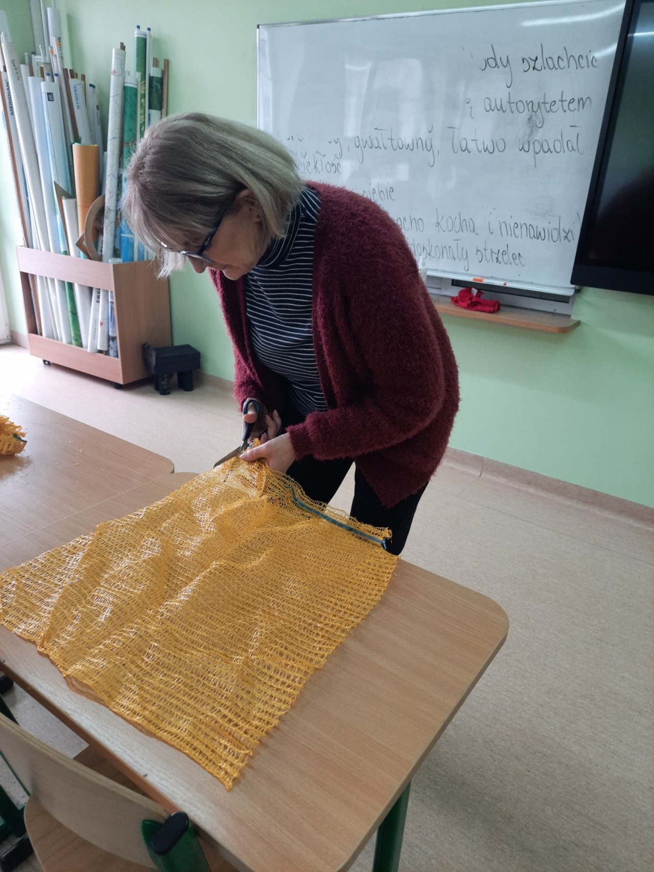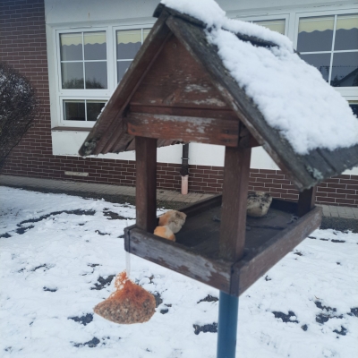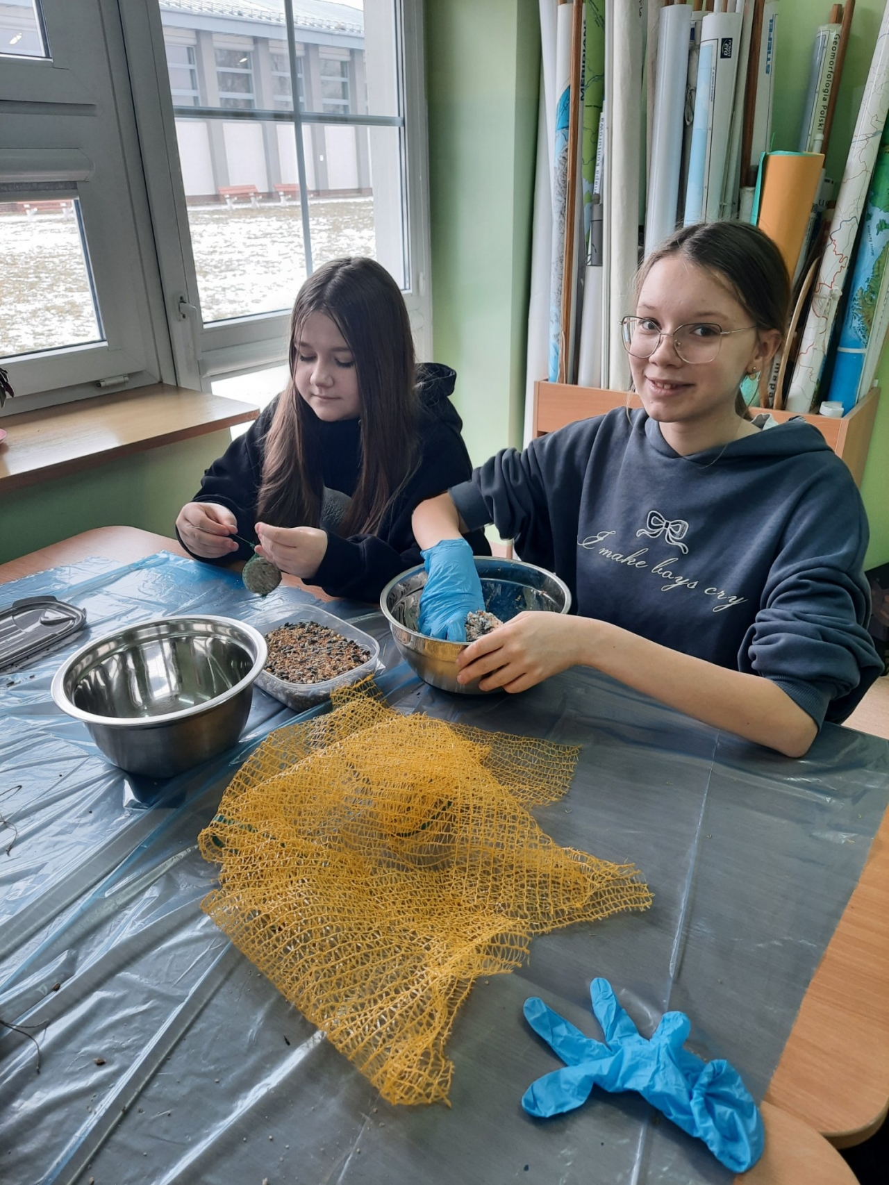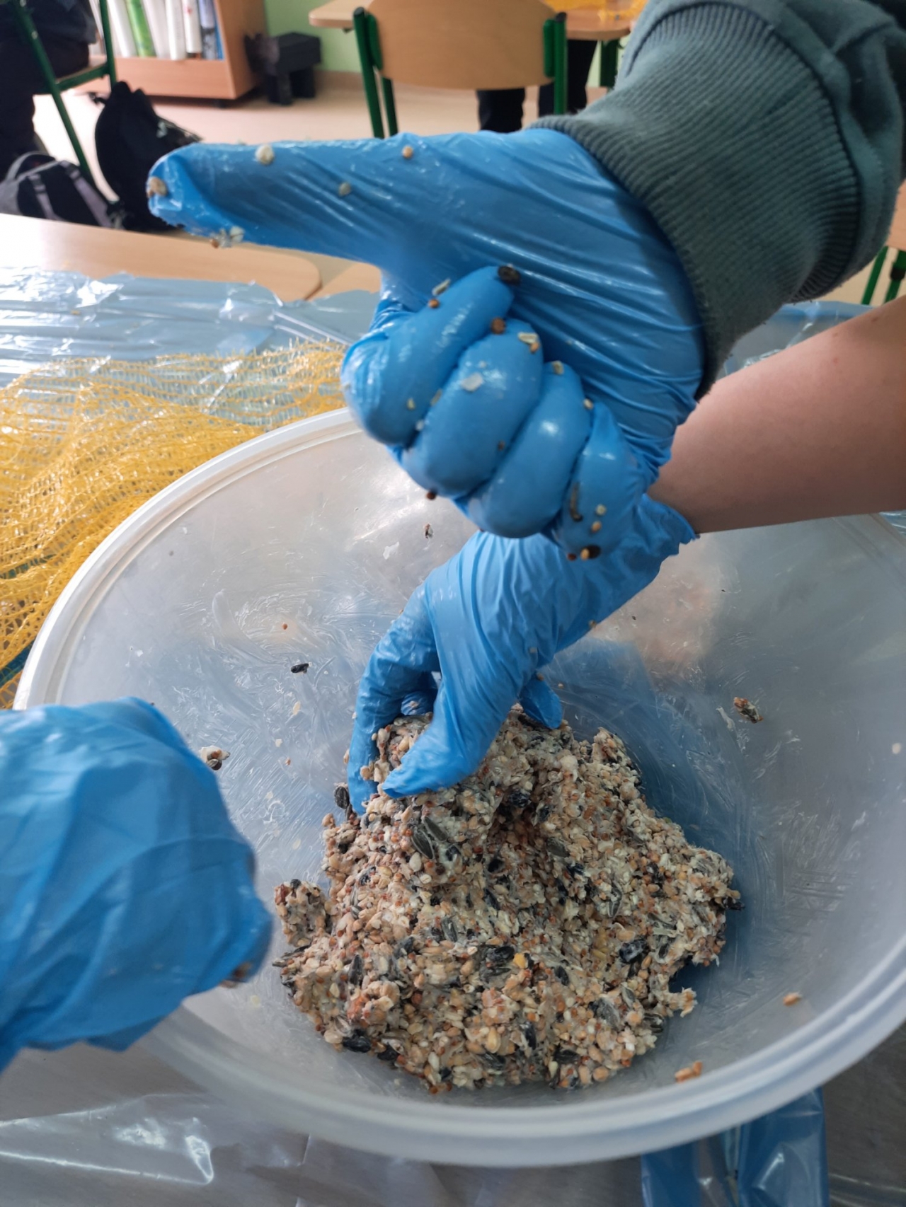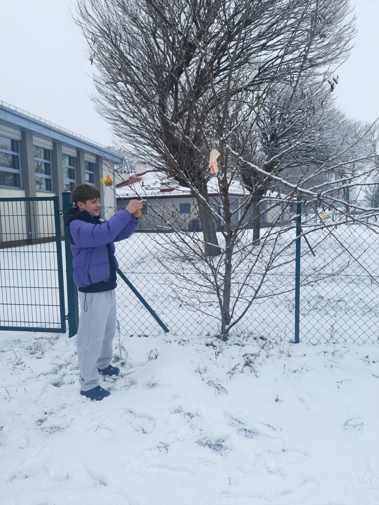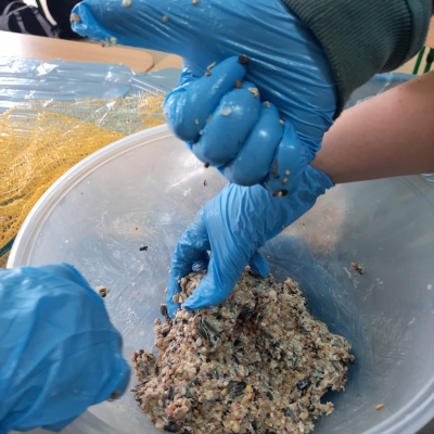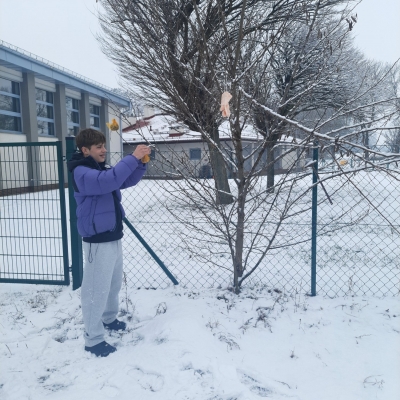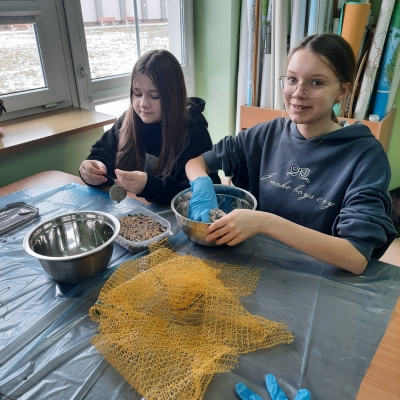 Wolontariusze – pod czujnym okiem opiekunek, wykonali zawieszki z produktów, które nie szkodzą naszym skrzydlatym przyjaciołom. Naturalne, pozbawione przypraw ziarna zostały połączone z tłuszczem. Uformowane w ten sposób kule zostały rozwieszone na drzewach wokół szkoły. Nie zabrakło także tradycyjnej słoniny, która z pewnością pomoże przetrwać największe mrozy.
