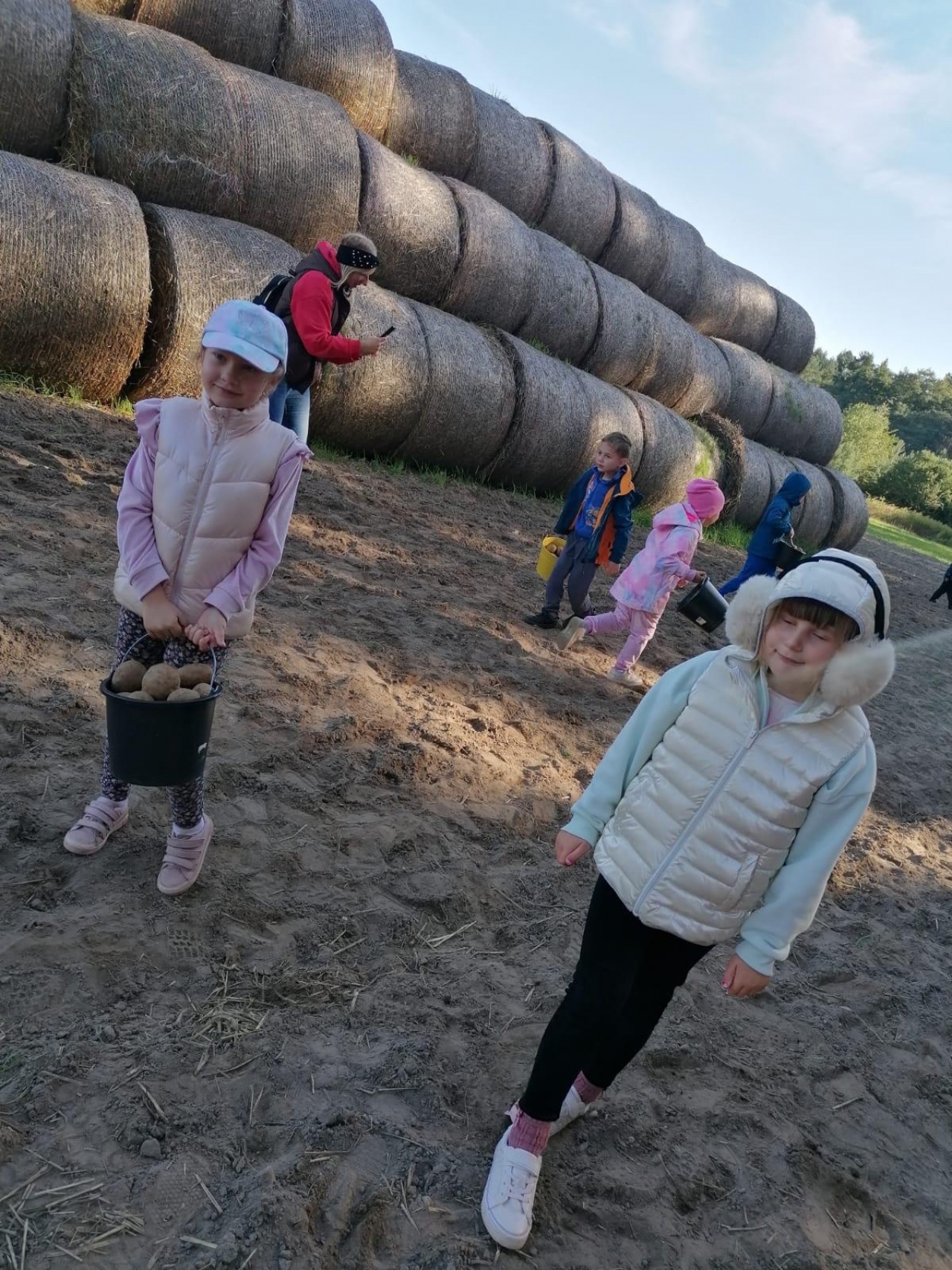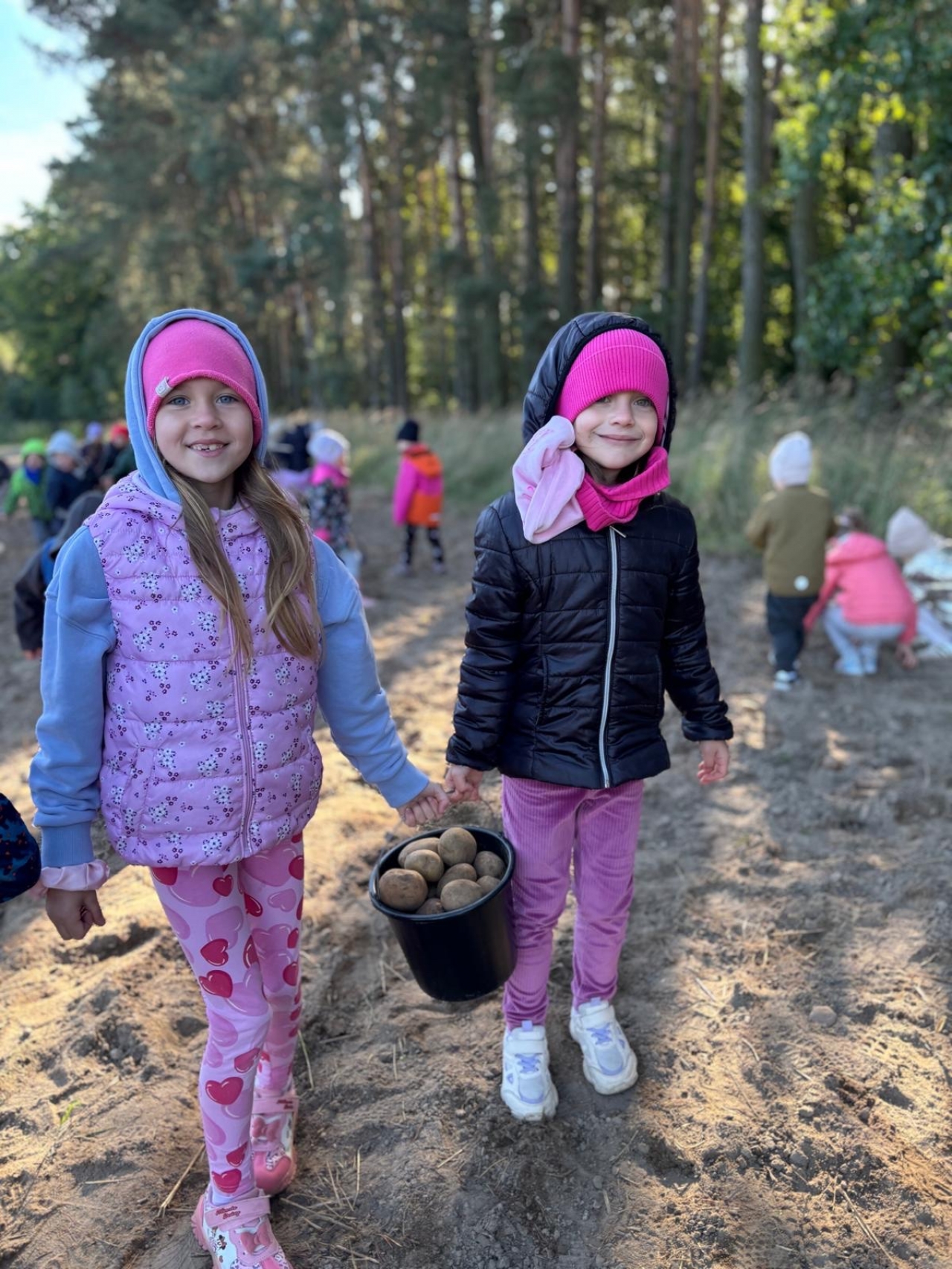 Po przybyciu na miejsce zajęcia rozpoczęliśmy wizytą na polu, gdzie dzieci samodzielnie zbierały ziemniaki, które później trafiły do ogniska. Podczas pieczenia się ziemniaczków przedszkolaki wysłuchały ciekawostek na temat ziemniaka – dowiedziały się, skąd przybył do Europy i jakie potrawy można z niego przygotować.