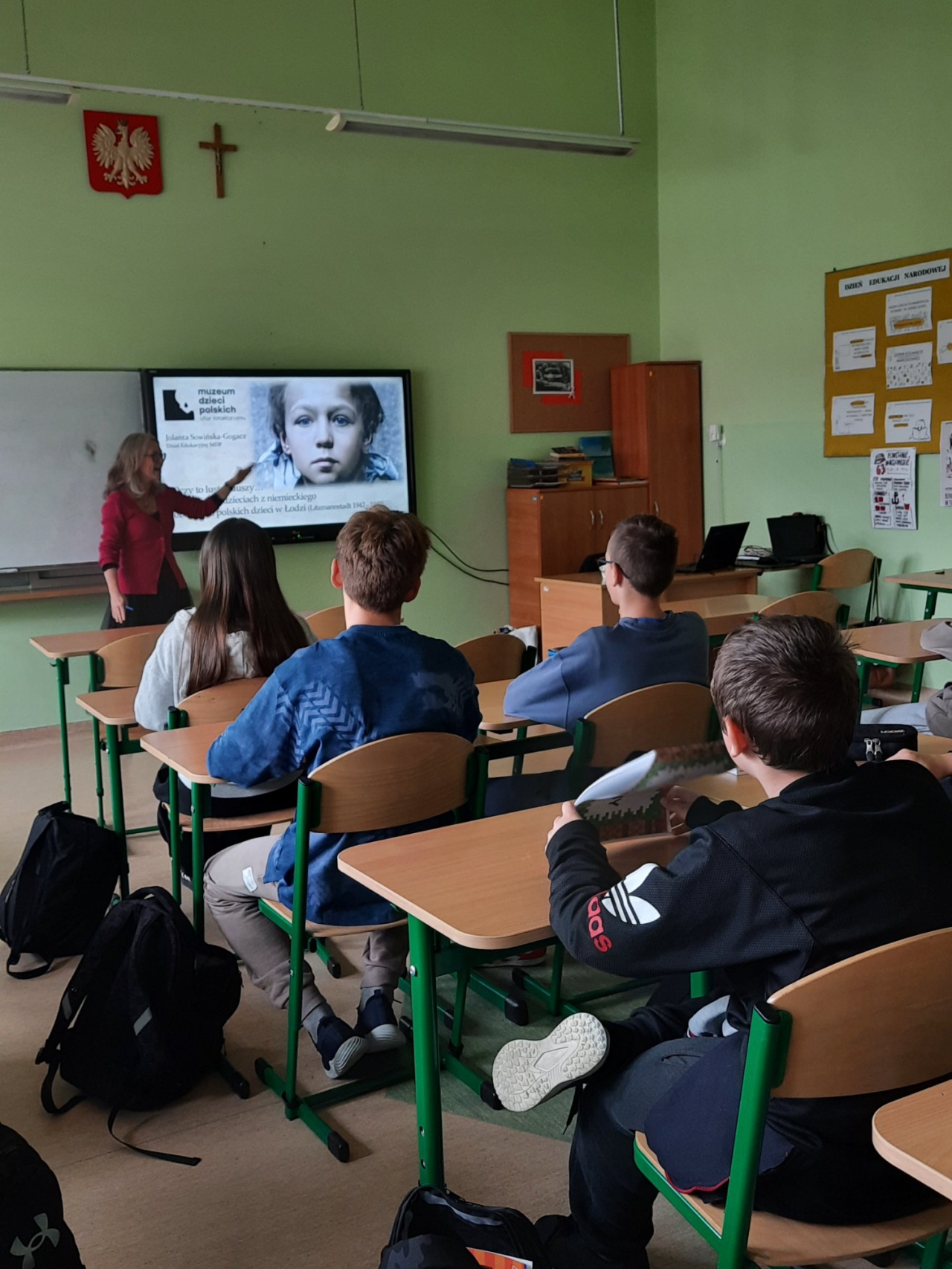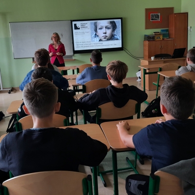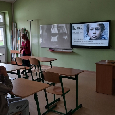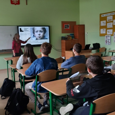 7 października 2025 roku w naszej szkole odbyło się spotkanie z p. Jolantą Sowińską-Gogacz, pracownikiem Muzeum Dzieci Polskich – ofiar totalitaryzmu. Autorka książki ,,Mały Oświęcim” przybyła do nas na zaproszenie p. Sylwii Trzeciak. Zajęcia edukacyjne dotyczące historii jedynego niemieckiego obozu dla dzieci polskich wywarły na uczniach klas VII i VIII ogromne wrażenie. Ukryte przed światem miejsce, z którego nie można było uciec. Naznaczone bólem i cierpieniem dziecięce piekło stworzone przez Niemców na terenie łódzkiego getta to historia, która nigdy nie powinna się wydarzyć.