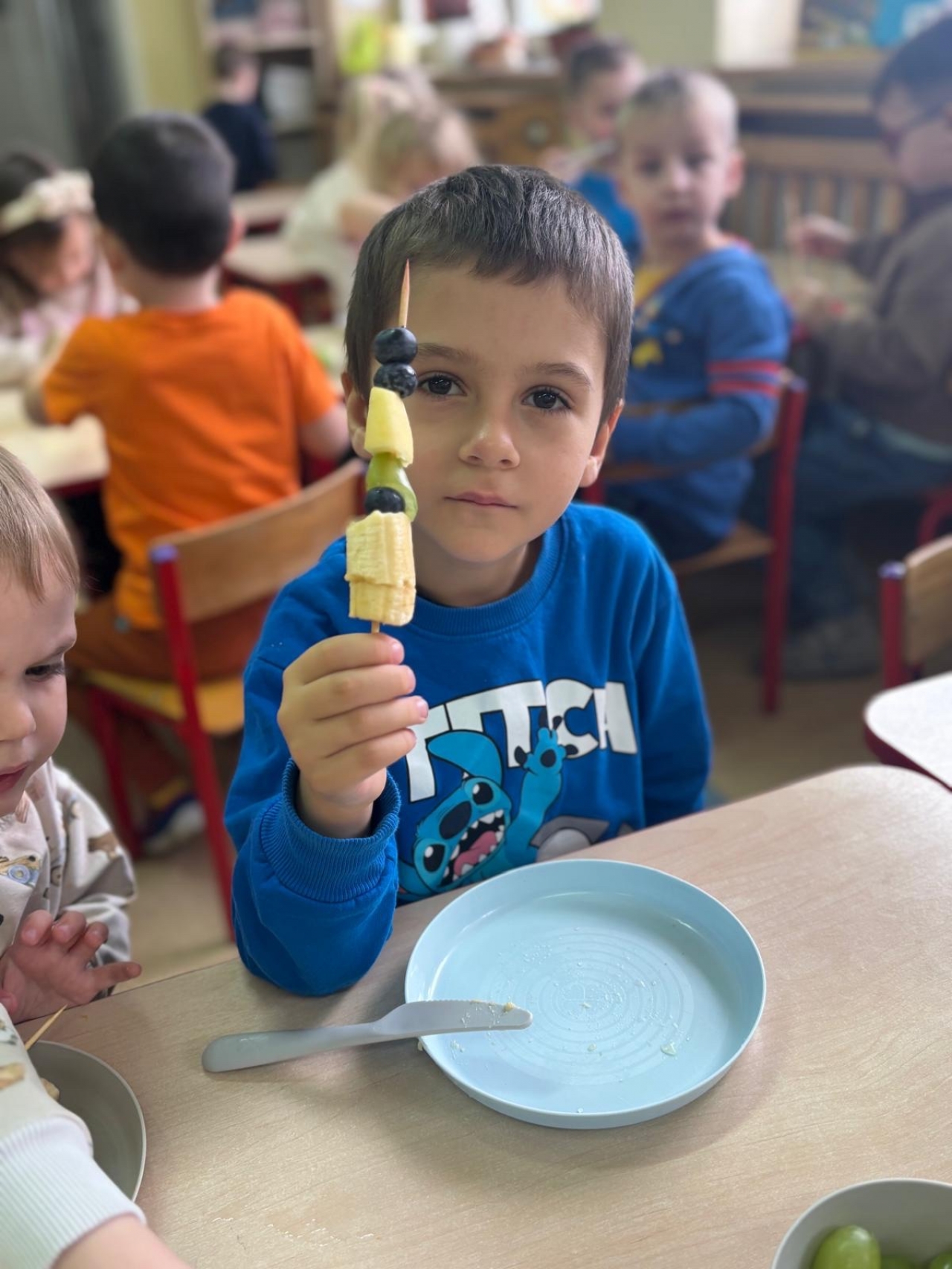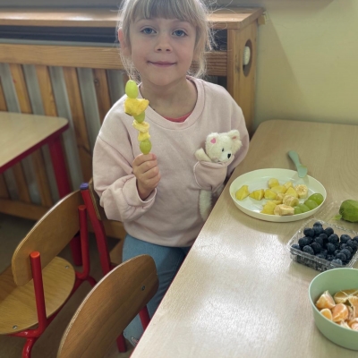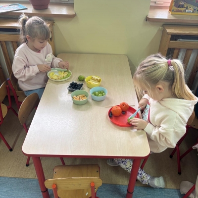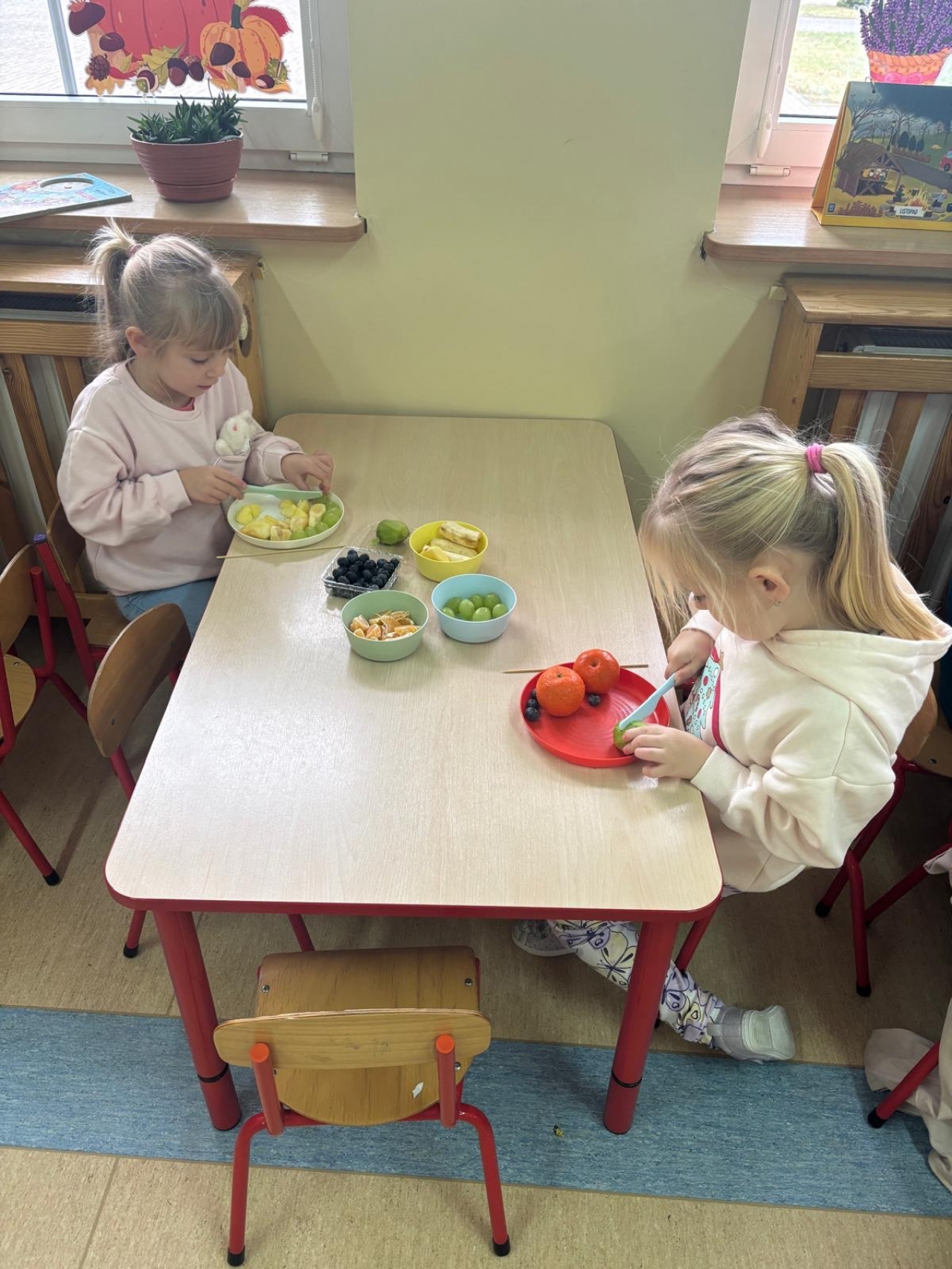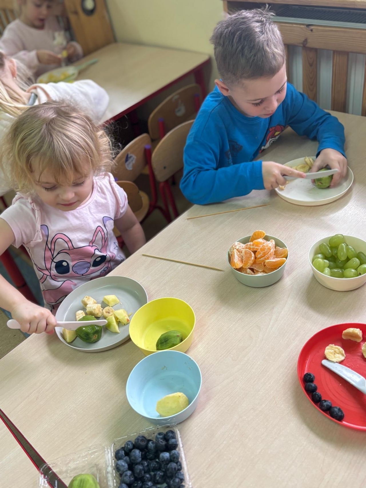 Największą atrakcją tygodnia było wspólne przygotowanie szaszłyków owocowych. Przedszkolaki z entuzjazmem wybierały ulubione owoce, kroiły je i tworzyły kolorowe, apetyczne przekąski. Była to świetna okazja, aby pokazać, że zdrowe jedzenie może być nie tylko pożywne, ale także wyjątkowo smaczne i kolorowe.