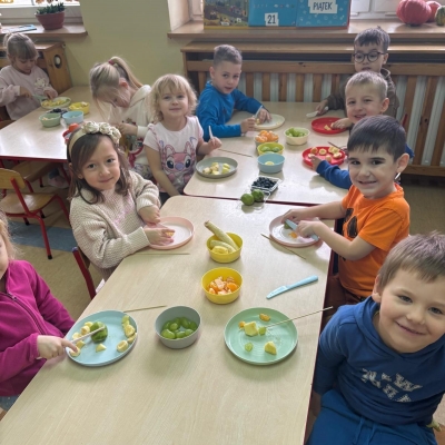 Podczas zajęć rozmawialiśmy o wartościach odżywczych warzyw i owoców. Dzieci poznały ich wpływ na zdrowie, m.in. na odporność, koncentrację i samopoczucie.