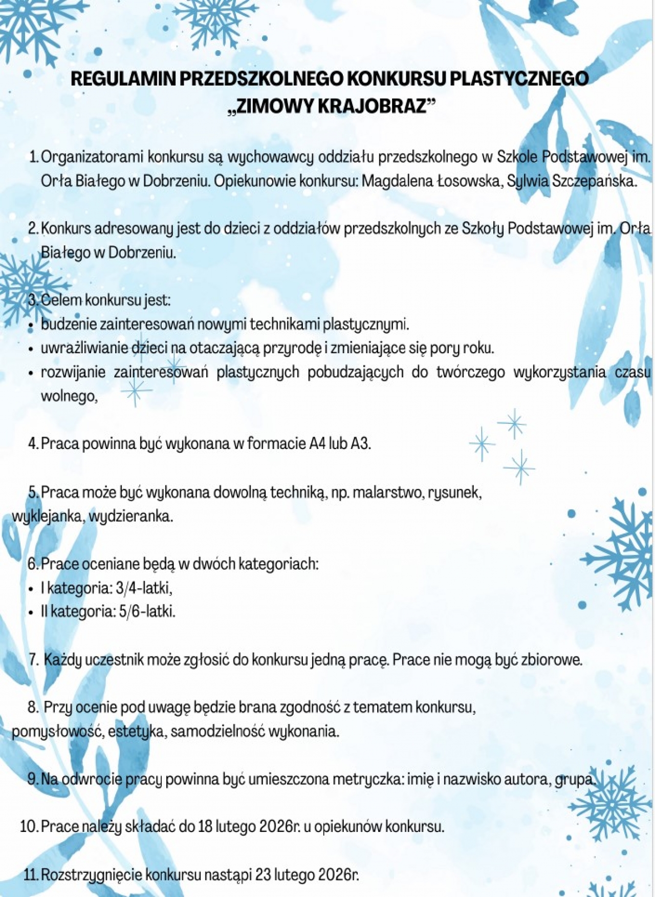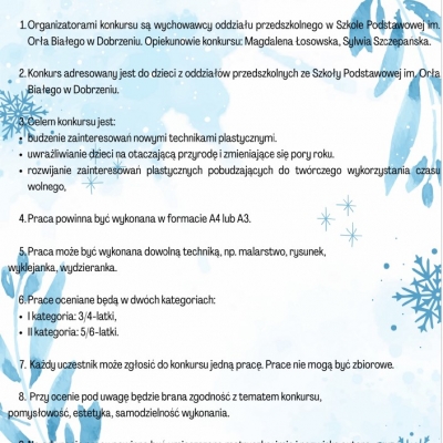 Zapraszamy do udziału w konkursie plastycznym nt. "Zimowy krajobraz". Szczegóły konkursu na plakacie oraz w regulaminie.